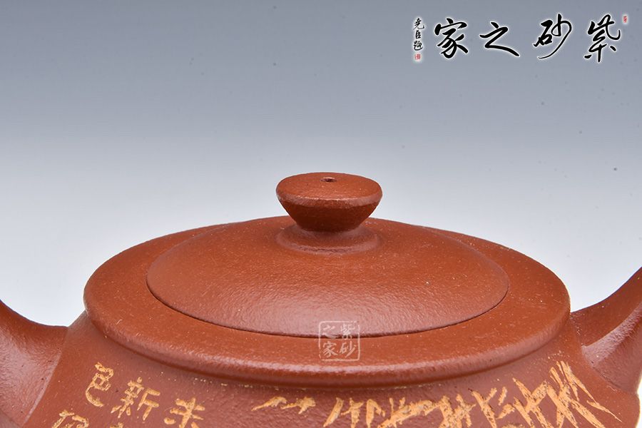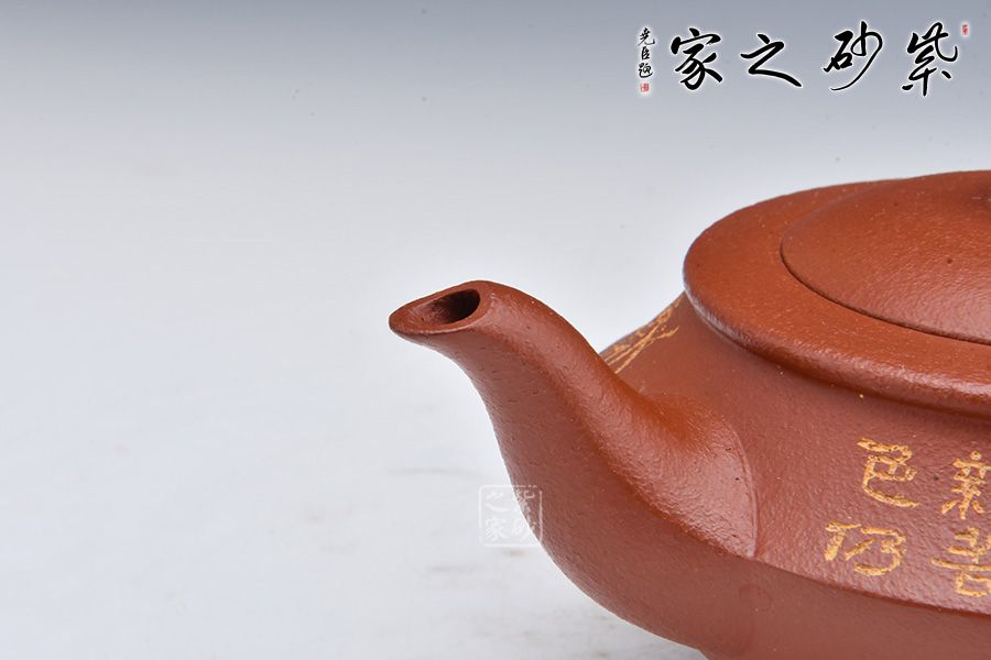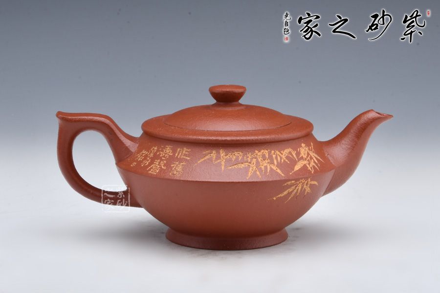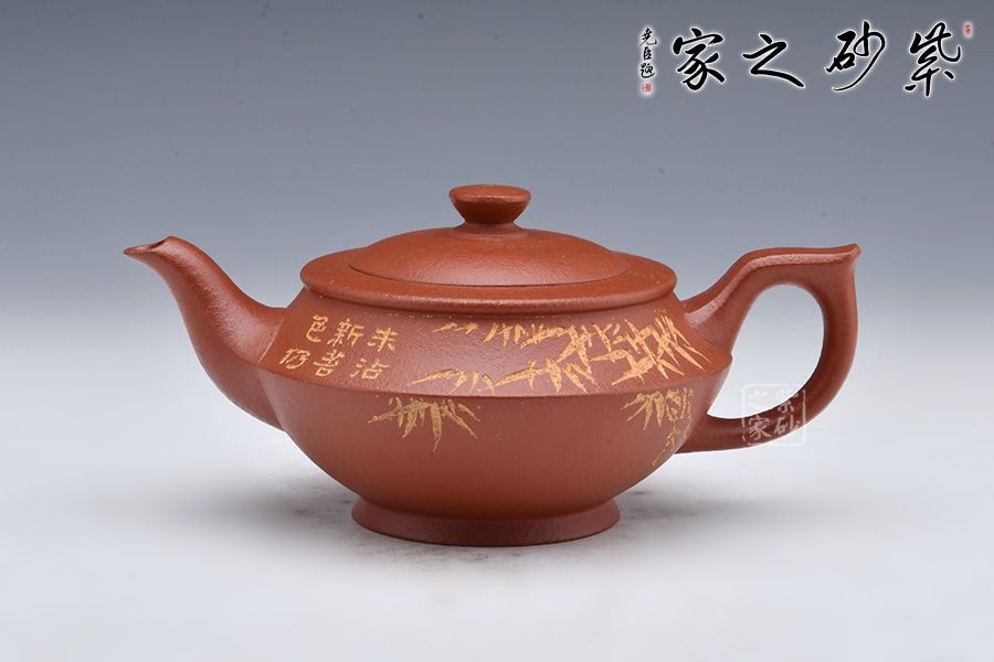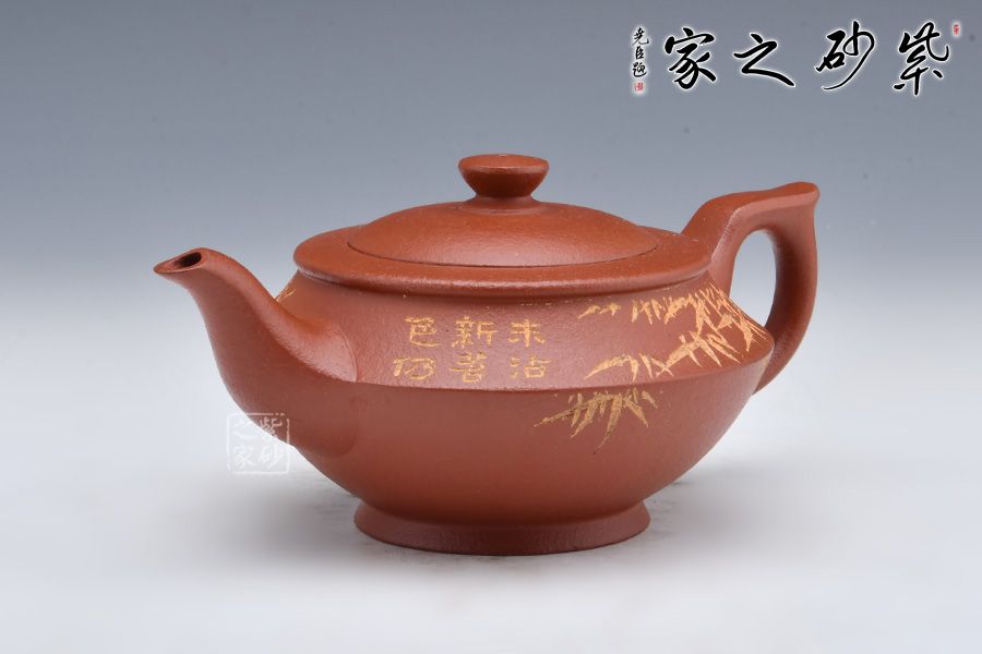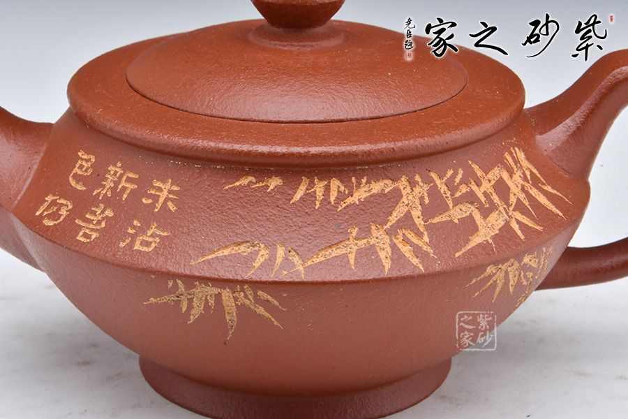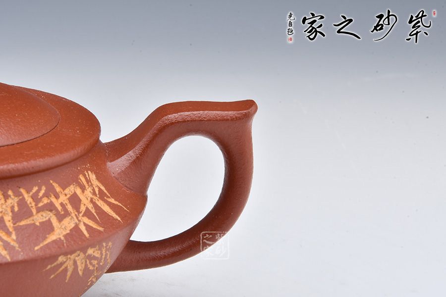 漢云壺采用魚(yú)籽大紅袍精制而成,色澤亮麗,泥料細(xì)膩。整壺形體挺秀,整體協(xié)調(diào),線條流暢,嘴、把連接統(tǒng)一和諧,呈現(xiàn)出一種大雅之度,超出一般壺藝之匠氣,躍出新穎之靈氣!壺身線條圓融有力,簡(jiǎn)潔明快,沉穩(wěn)而不凝滯。壺面刻繪裝飾,寥寥幾筆刻繪出竹葉的神韻??捎茫少p、可藏,是一把不可多得的精品品茗壺。