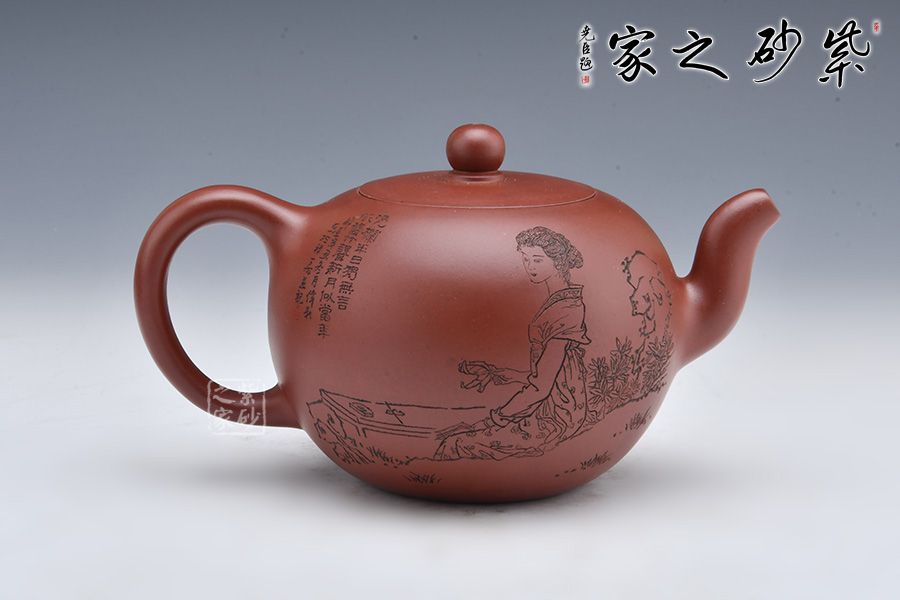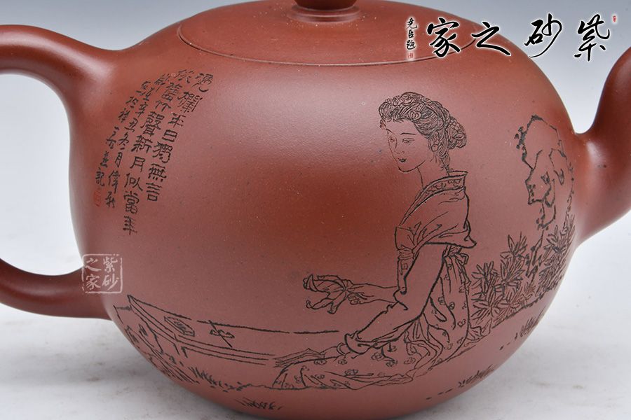 壺身雙面陶刻,正面刻“花自飄零水自流。一種相思,兩處閑愁。此情無計可消除,才下眉頭,卻上心頭”;反面刻繪一美女游湖賞荷,刻畫精細。