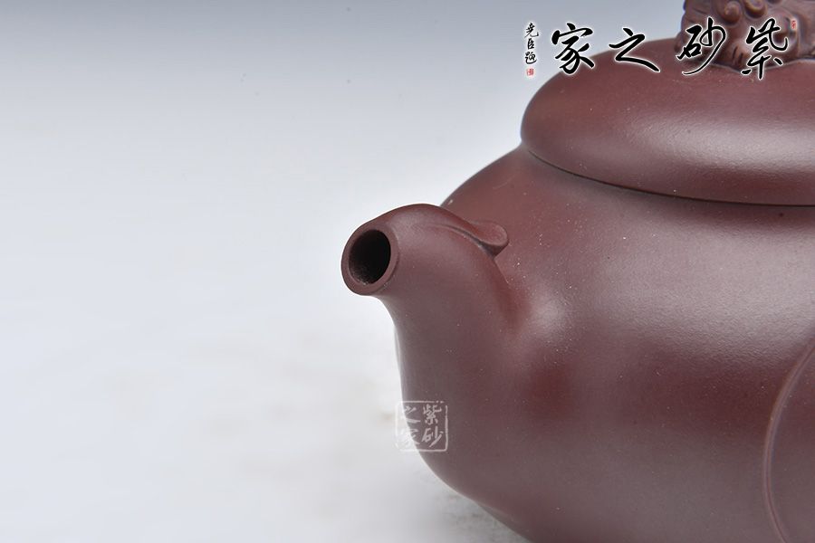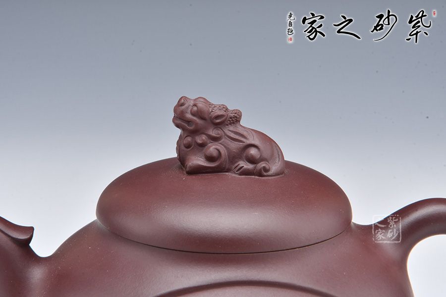 壺身圓潤(rùn)飽滿,鳳嘴、鳳把,把鳳凰的元素融合進(jìn)壺身。半圓壺蓋飽滿,壺鈕一瑞獸端坐,制作精細(xì),形態(tài)逼真,整器猶為穩(wěn)重而渾厚,但又有些許的靈動(dòng),是一款不可多得的好壺。