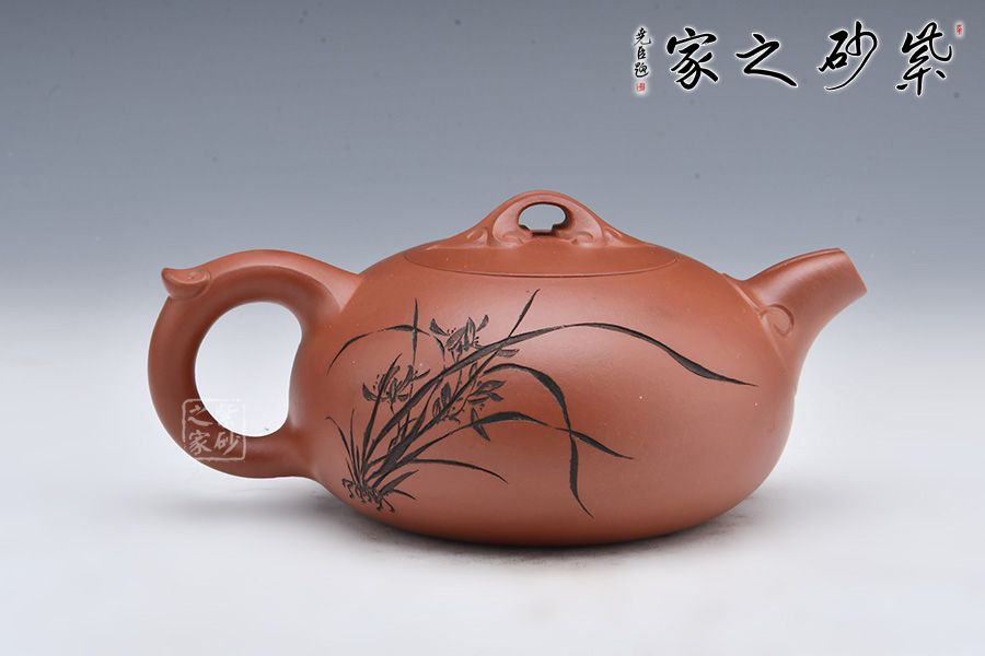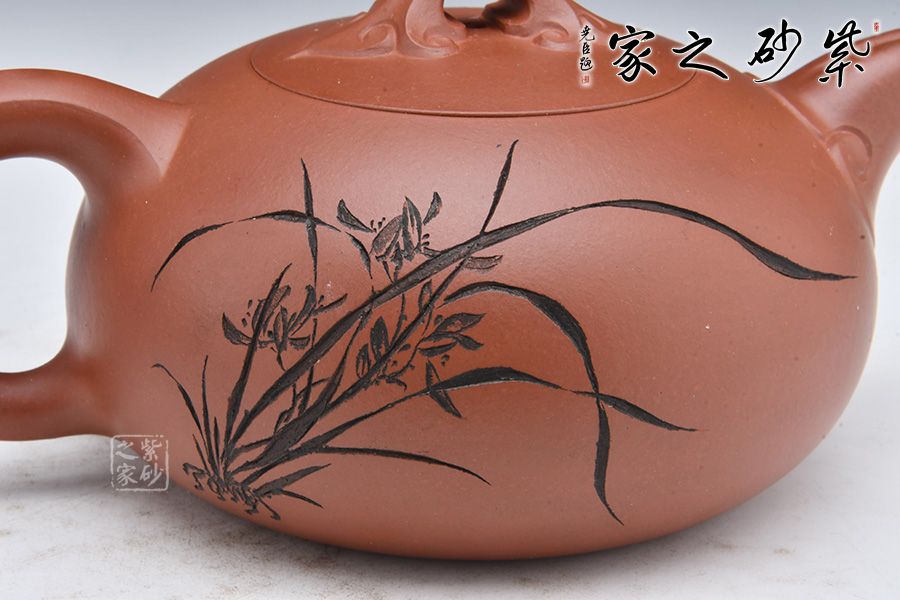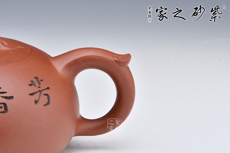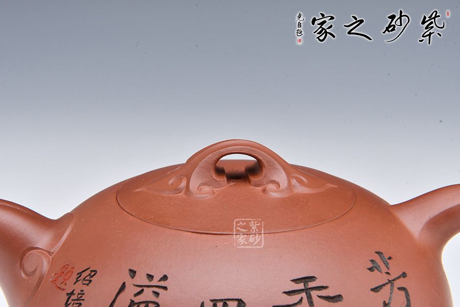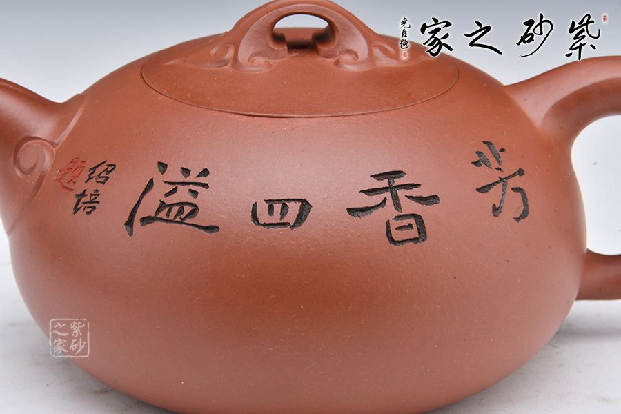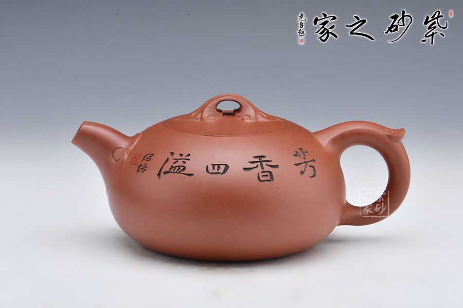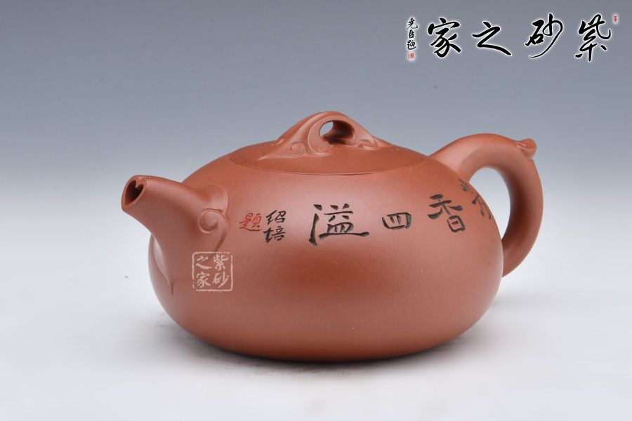 此壺端莊大氣,飽滿大度的壺體,給人以有容乃大的大家風(fēng)范和氣度。一彎流胥出流暢,張力大,挺翹有力,耳把與之呼應(yīng),也成大張之勢,帶小小飛把,別致可愛。截蓋設(shè)計,與壺身融為一體,如意橋鈕圓潤,壺嘴、壺把上的刻繪小小的如意紋,更添吉祥氣息,蘊涵四方平安,如意吉祥,很見制壺功力。 壺身顧紹培大師書寫“芳香四溢”四個大字,強強聯(lián)合,收藏價值更高!
