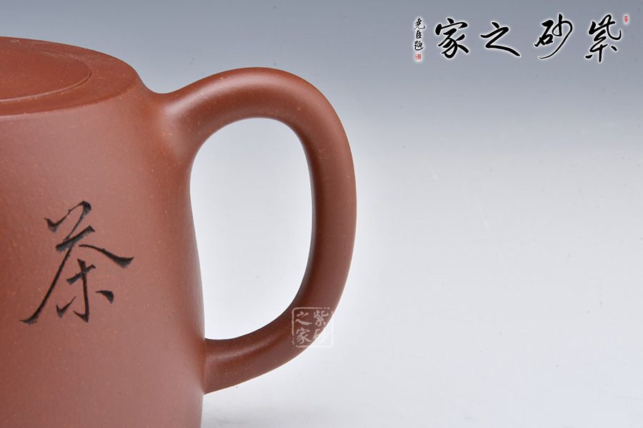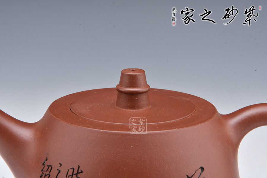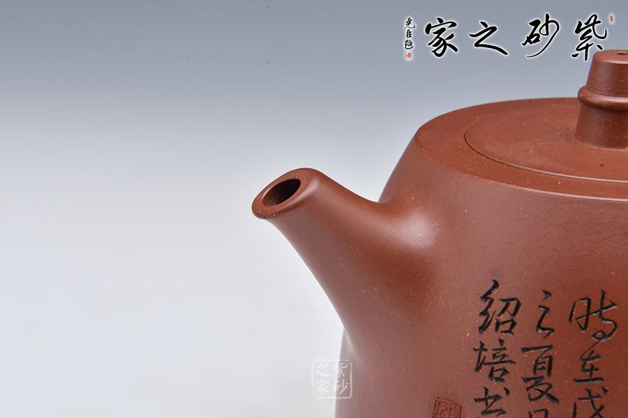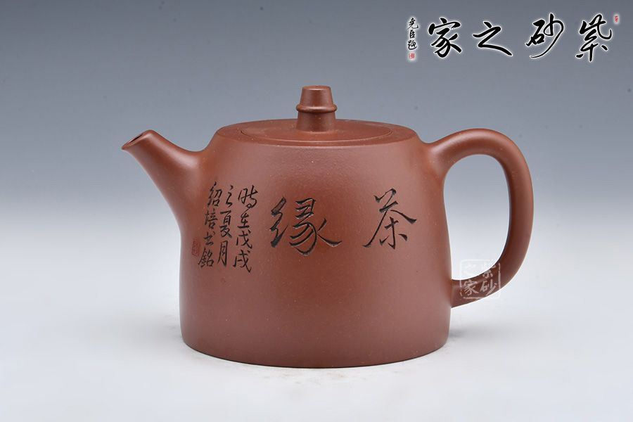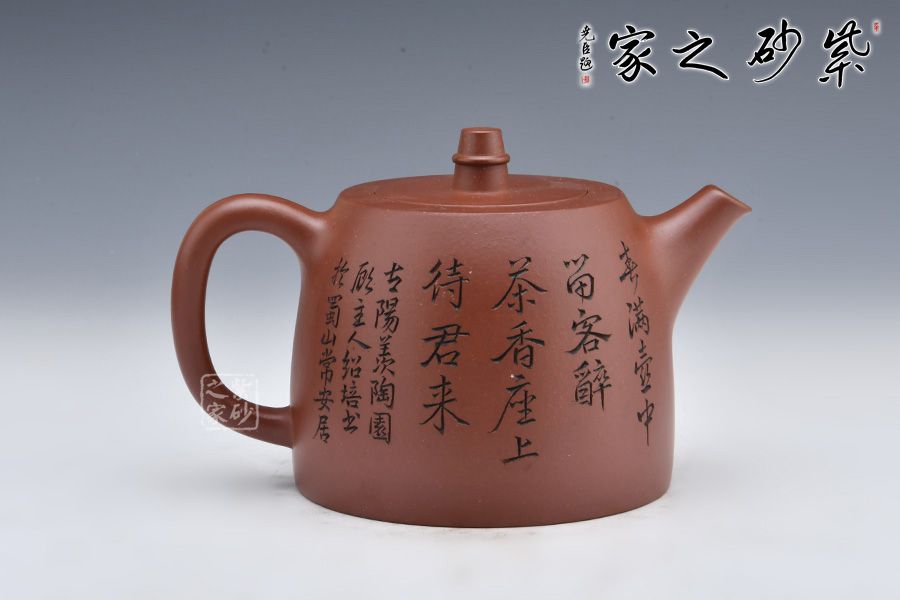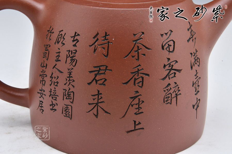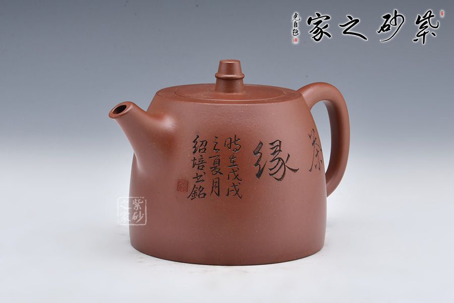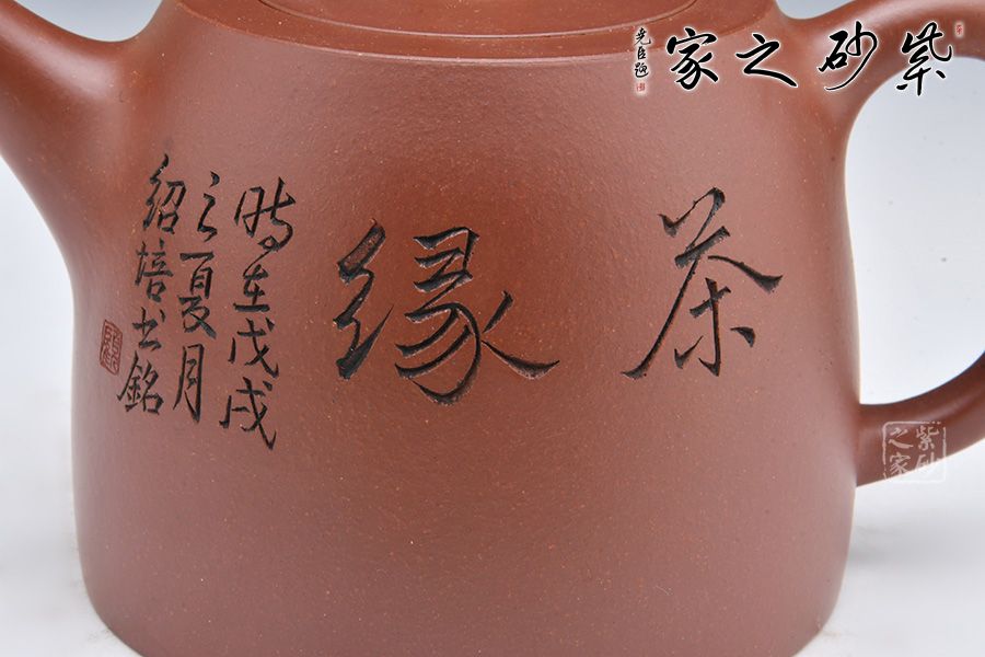 漢鐸壺為經(jīng)典器型,壺體造型源自漢代之“鐸”,“以漢之鐸,為今之壺,土既代金,茶當(dāng)呼荼”。壺體為上收下寬的圓柱形,壺肩與嵌蓋吻合嚴(yán)密,口部平整嚴(yán)絲合縫一般。柱鈕直挺,揭拿口蓋十分便利。壺之流、把造型敦厚古拙,十分別致,整器實(shí)用性極佳! 壺身顧紹培老師題字,正面刻繪“茶緣”,反面刻繪“春滿(mǎn)壺中留客醉,茶香座上待君來(lái)”刻畫(huà)精細(xì),實(shí)乃精品品茗壺。