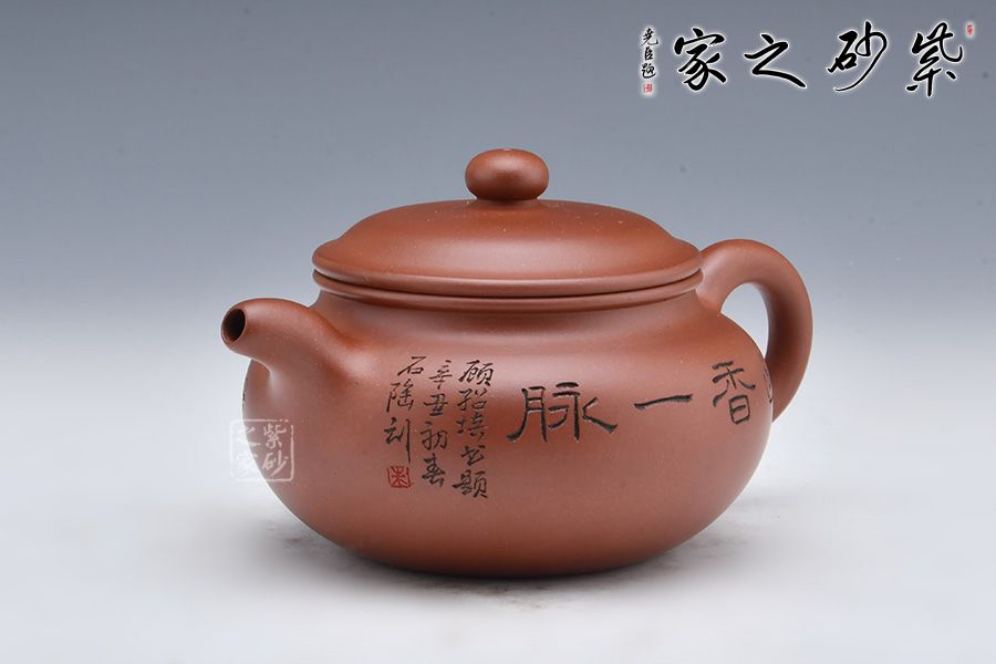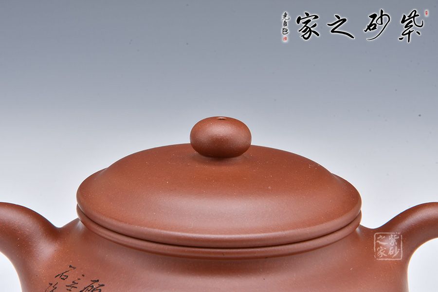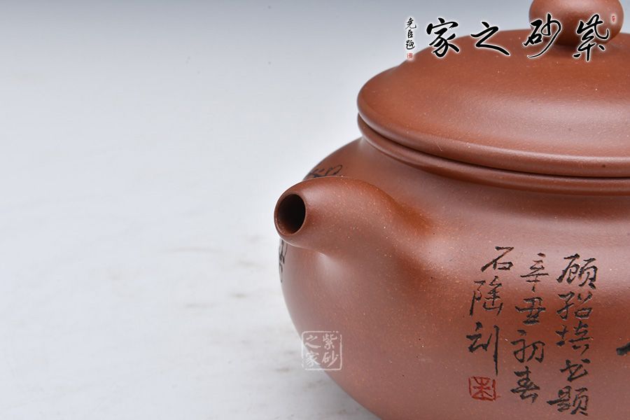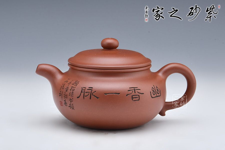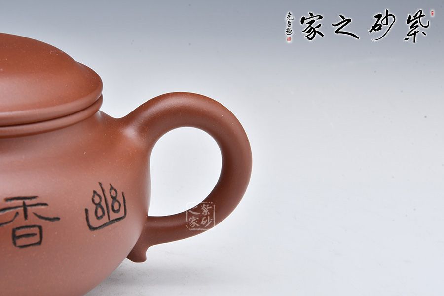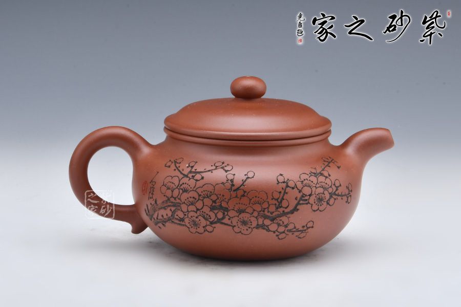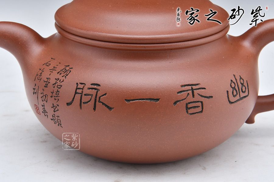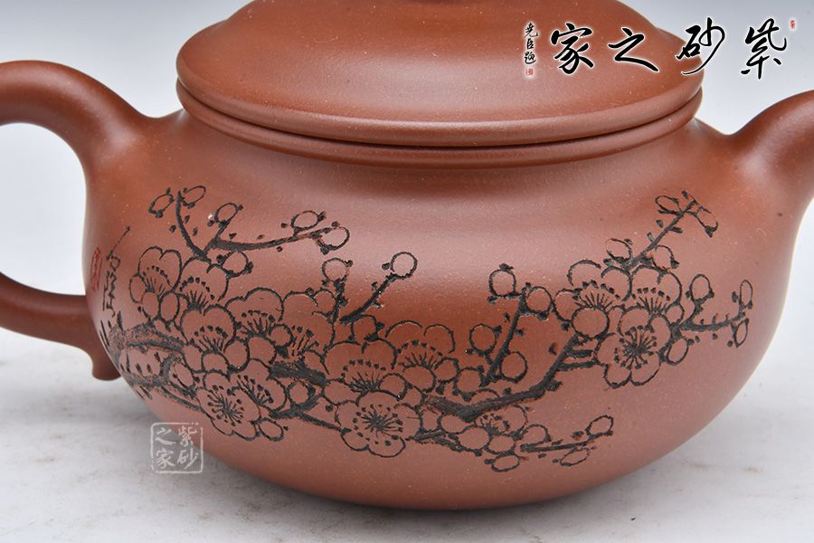 此壺選用稀有泥料底槽清精制而成,泥色明潤(rùn)雅致。造型仿“鼓”之形,壺身扁圓,壺腹飽滿(mǎn),鈕、蓋、身三位一體,線(xiàn)條銜接流暢。彎流挺拔,出水爽利,耳把端莊秀麗,把握舒適。 壺身正面陶刻“幽香一脈”,字體工整秀麗,力道十足;反面陶刻朵朵梅花盛開(kāi)之景,寥寥幾筆之中讓我們感受到了冬天梅花的傲雪盛開(kāi),仿佛有徐徐的香味襲來(lái)。整壺氣質(zhì)高雅,賞用皆宜。