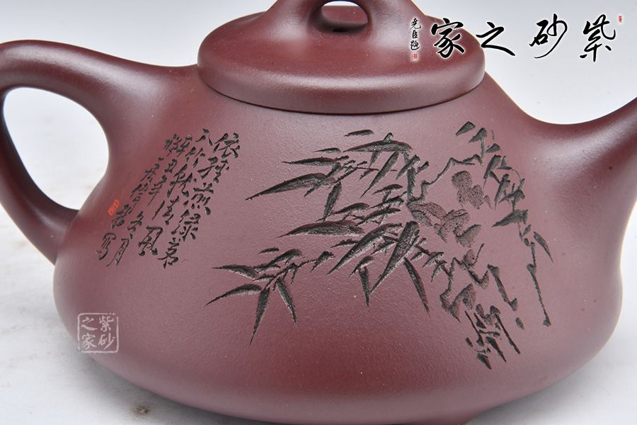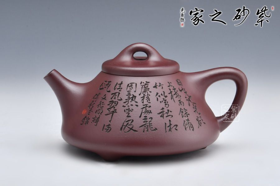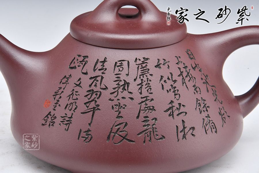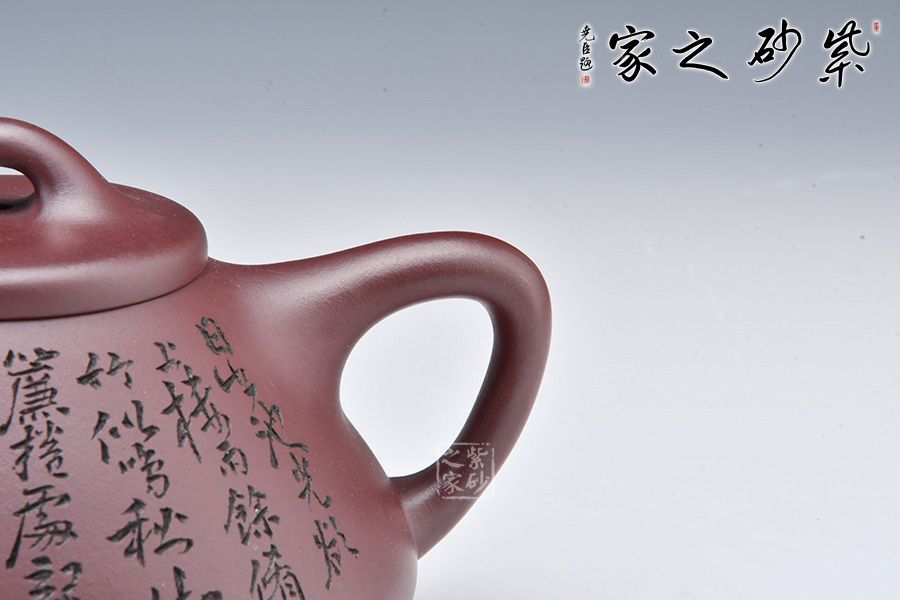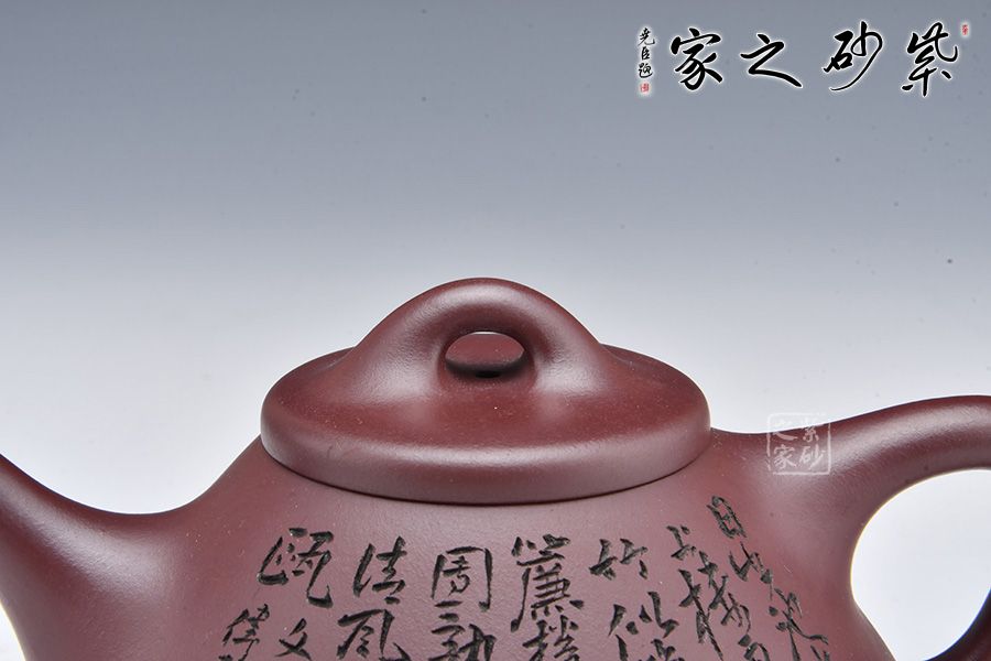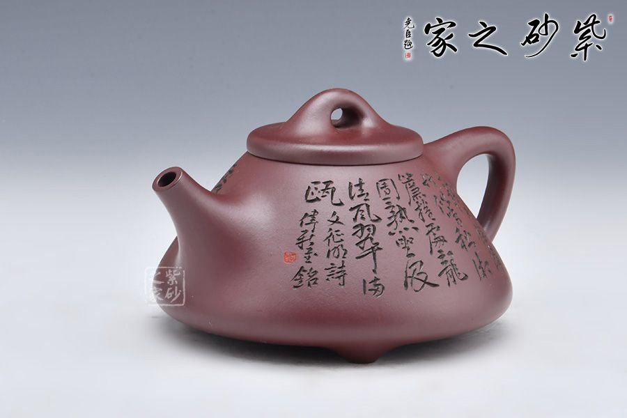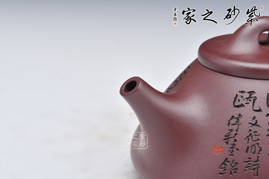 此壺摹古而作,以子冶石瓢為型,精選龍血砂精制而成,泥色成熟穩(wěn)重,古樸雅致,造型簡約大方。壺身呈金字塔形,豐潤飽滿,拱起的橋鈕使用起來更為自如,直流簡而有力,出水順暢,壺把呈倒三角勢,與壺身之型互補(bǔ),形成和諧的美學(xué)效果。
