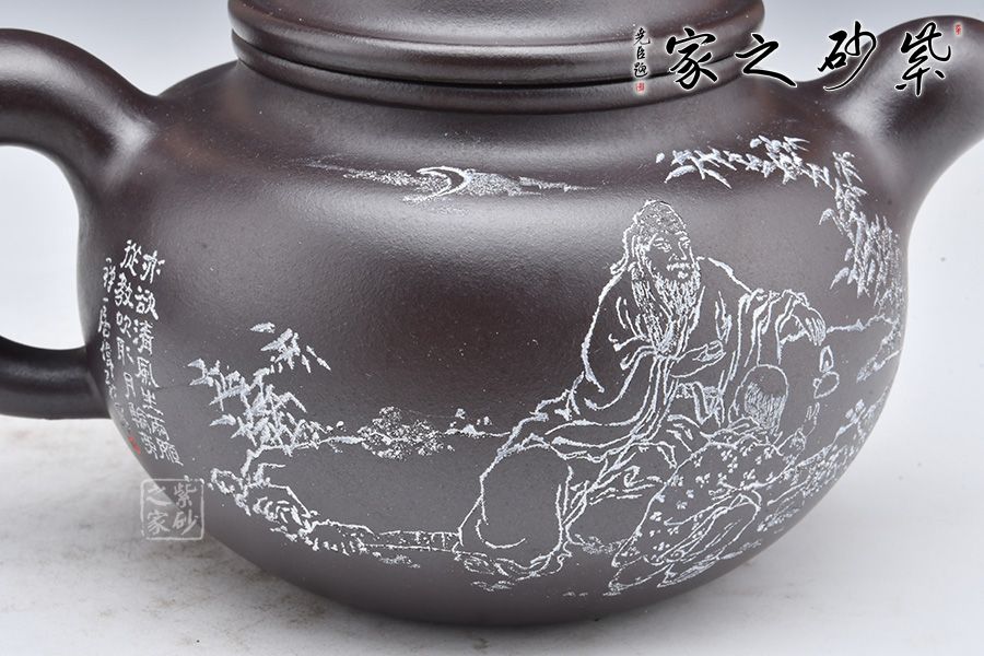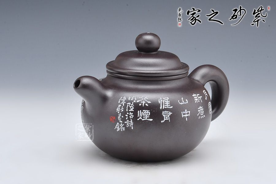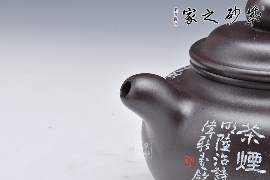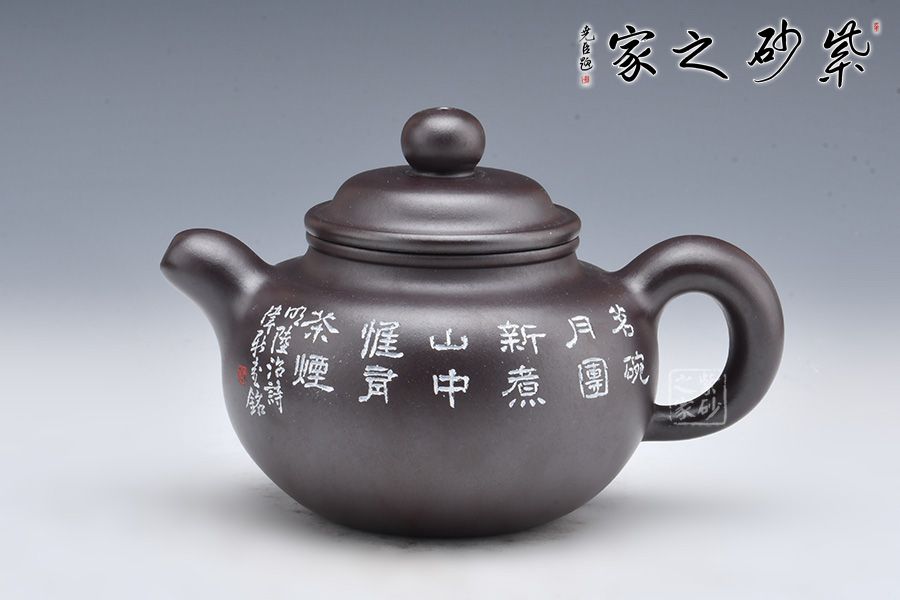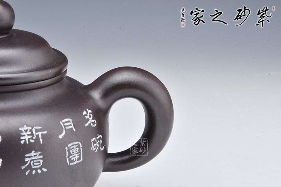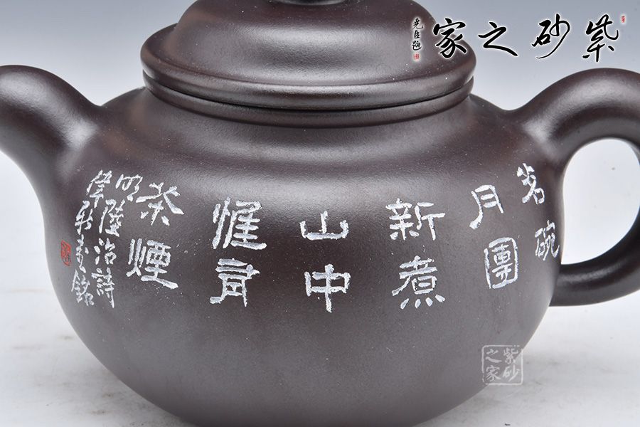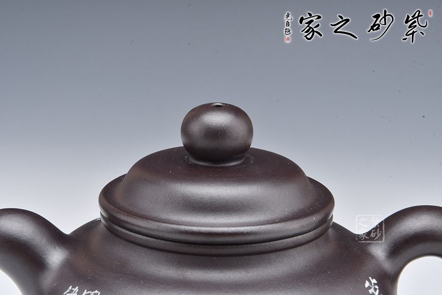 此壺摹古而作,以道洪蓮子為型,選用金龍血精制而成,泥質(zhì)細(xì)膩,明潤雅致。整器承襲道洪之風(fēng)格,身、蓋、鈕、流、把渾厚大氣,線條流暢,遒勁豪邁,內(nèi)蘊(yùn)充沛。
