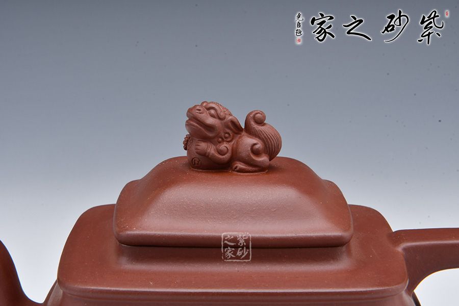 以方器為基調(diào),壺身以梯形狀示出,秀出壺身俊逸周正之姿,壺底四角,烘托出壺體剛健婀娜之態(tài)。流把同樣以四方之形設計,彰顯肅穆之氣勢。壺蓋之上以瑞獸設計,精巧靈動,象征吉祥,有祥瑞之氣。