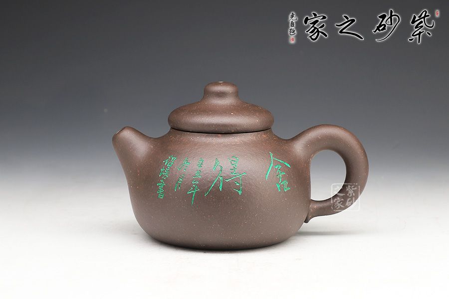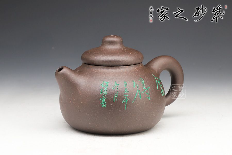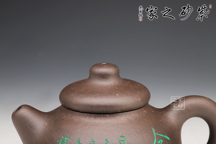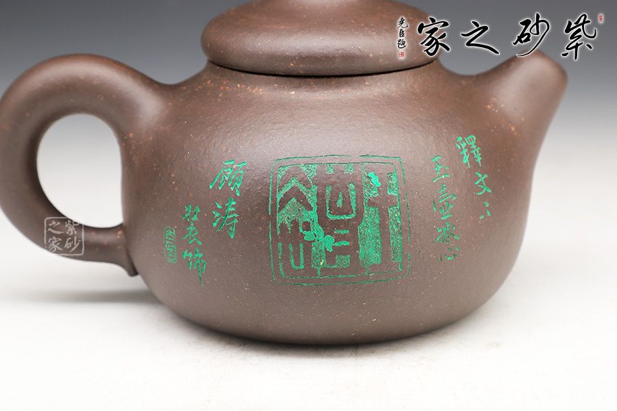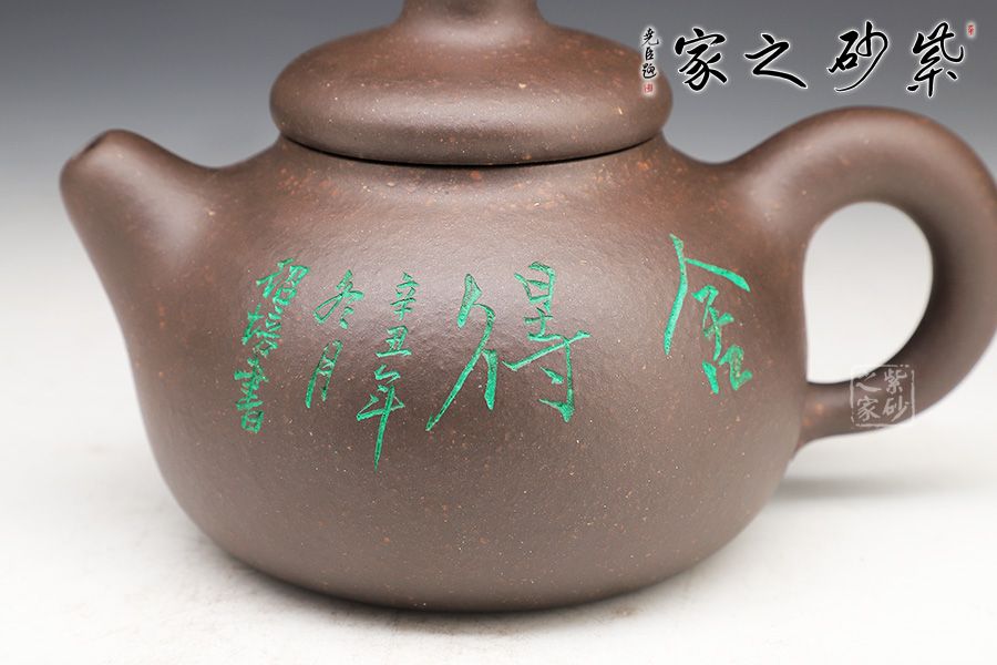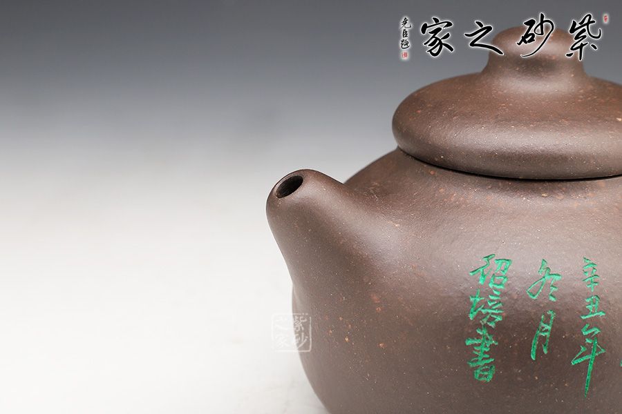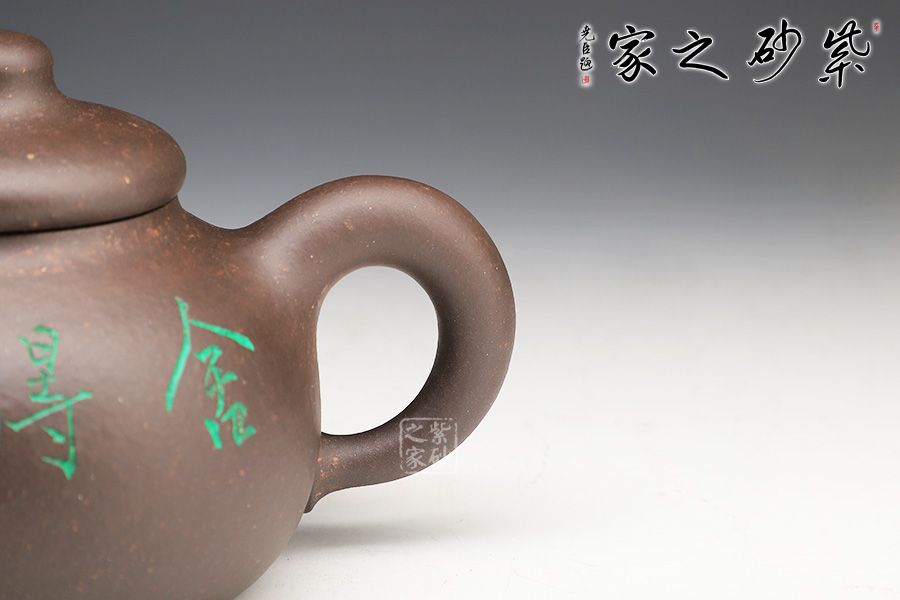 此壺的造型非常樸實(shí)。壺身是一個(gè)圓球,飽滿而潤(rùn)滑,調(diào)砂肌理豐富有趣。壓蓋圓潤(rùn)精巧,圓柱壺鈕與壺蓋一體,簡(jiǎn)練有趣。短促直嘴和環(huán)形把左右對(duì)應(yīng),二者都是線條凝重,似有不散的意味。名為“憨壺”,真的名副其實(shí)