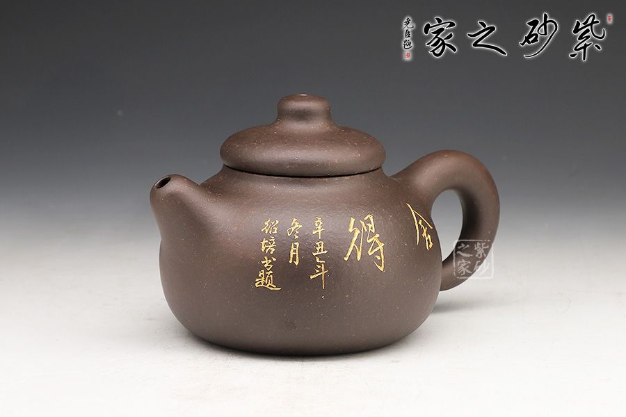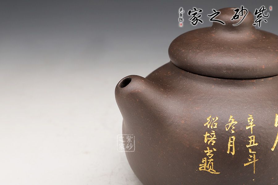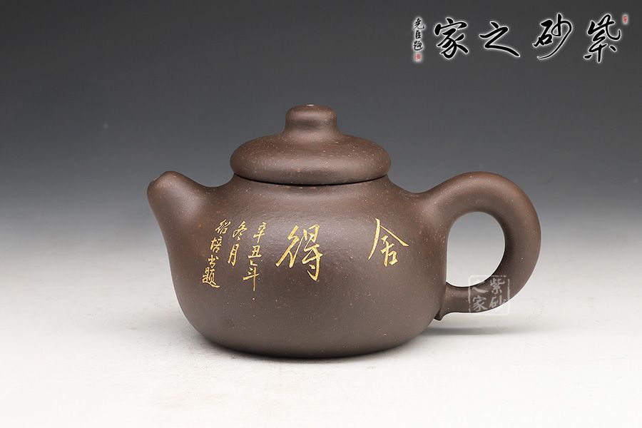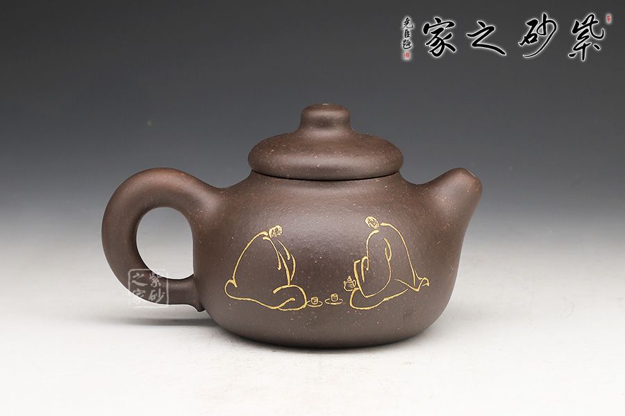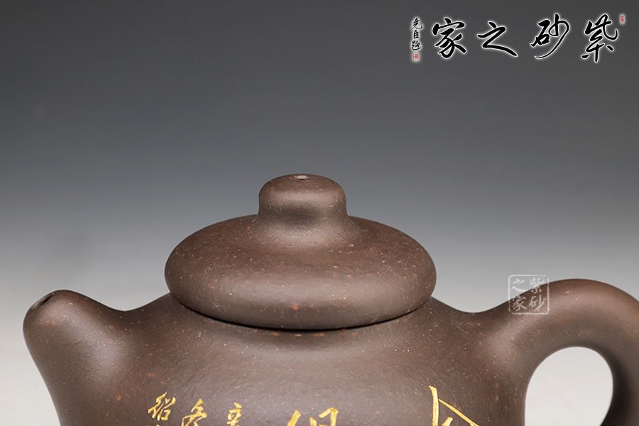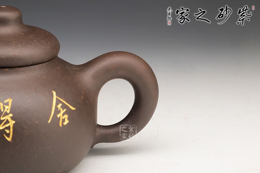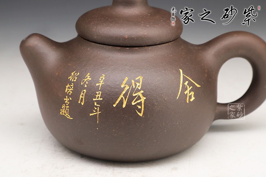 此壺的造型非常樸實(shí)。壺身是一個圓球,飽滿而潤滑,調(diào)砂肌理豐富有趣。壓蓋圓潤精巧,圓柱壺鈕與壺蓋一體,簡練有趣。短促直嘴和環(huán)形把左右對應(yīng),二者都是線條凝重,似有不散的意味。名為“憨壺”,真的名副其實(shí)
