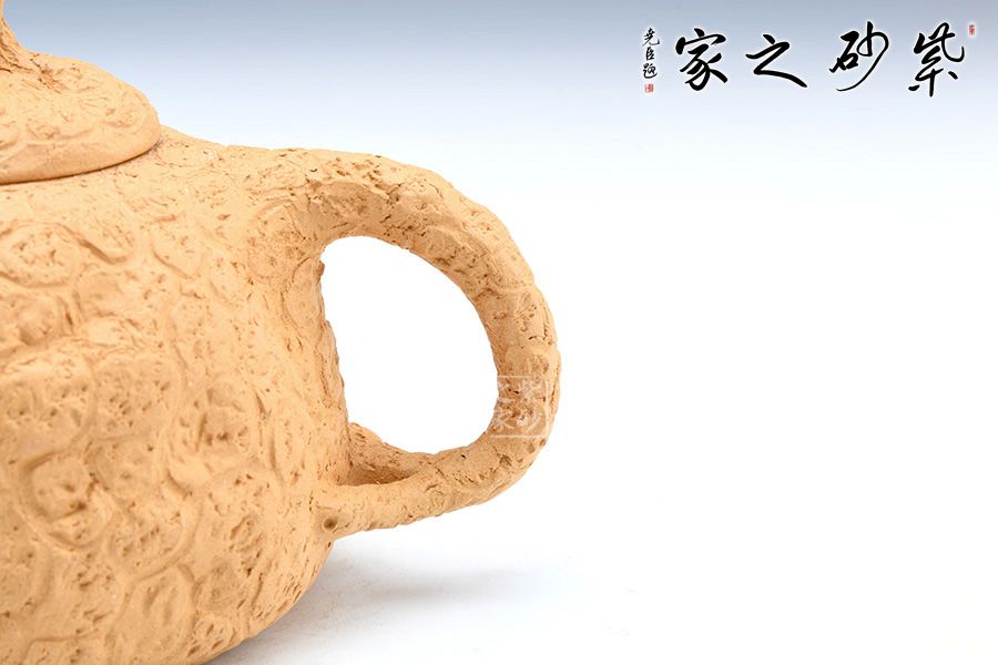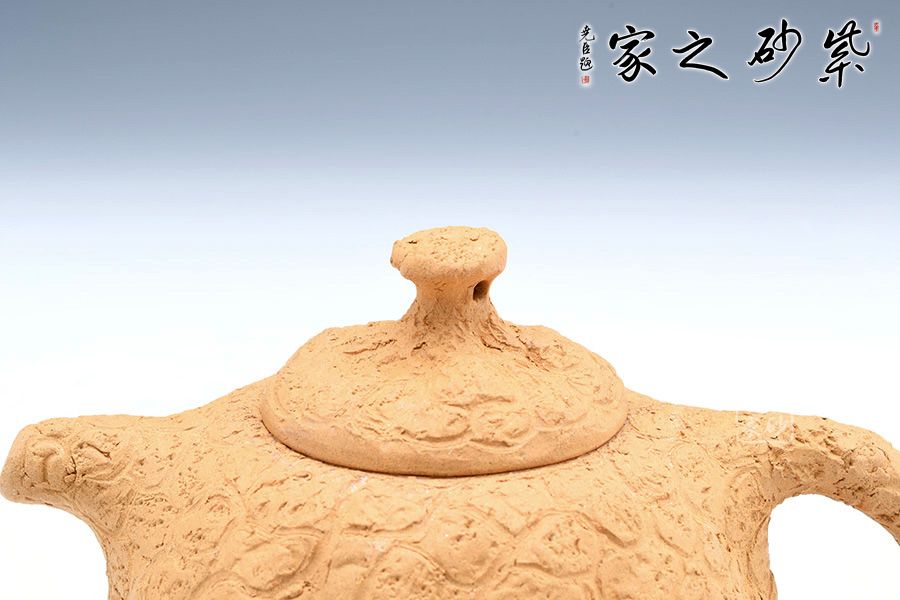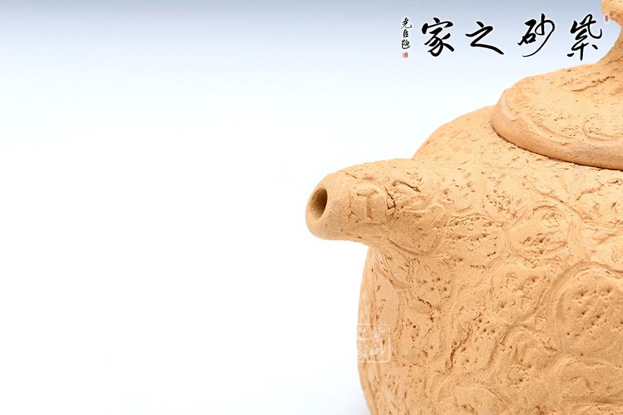 壺身皆有如老樹疙瘩般,盡顯得老成,但此款作品壺身的疙瘩卻有一定的規(guī)律可尋,壺把與壺嘴纖細(xì)對稱,以靈芝為壺鈕不但突出主題,亦區(qū)分出與其他供春壺的不同,整體造型渾圓敦厚,古樸雅拙,器身仿樹皮褶皺。