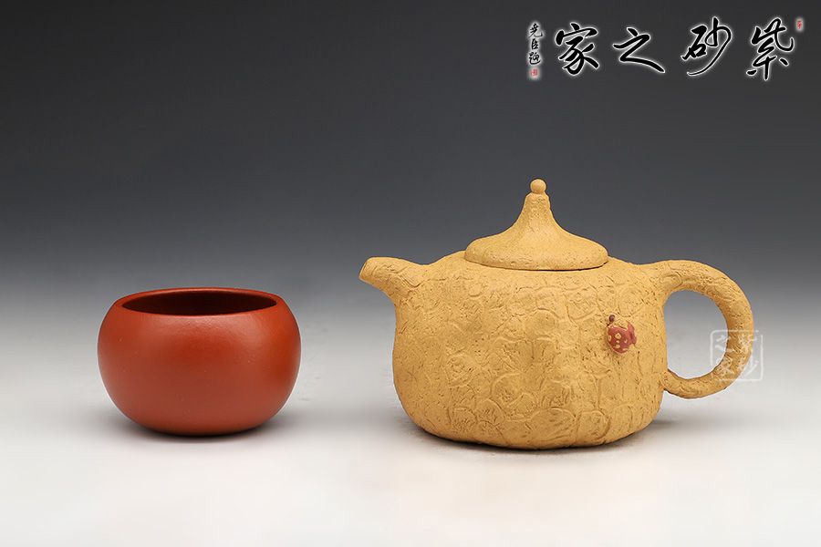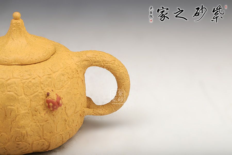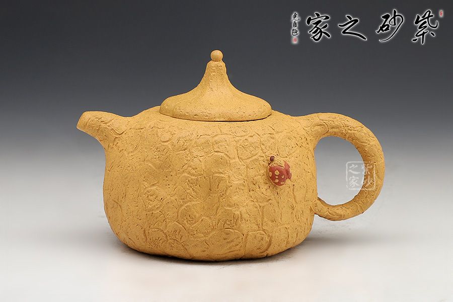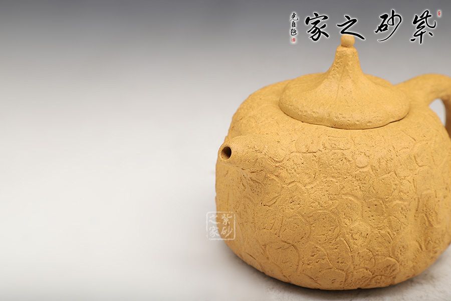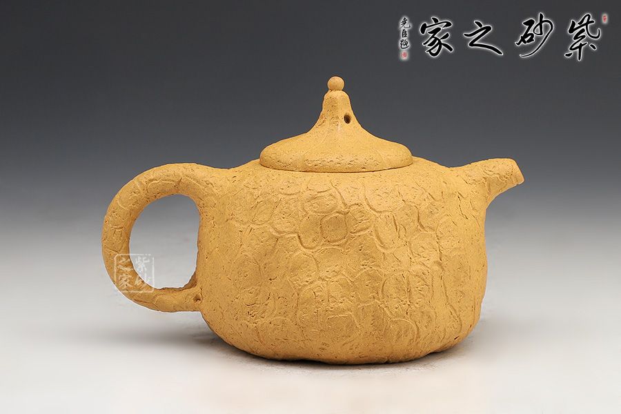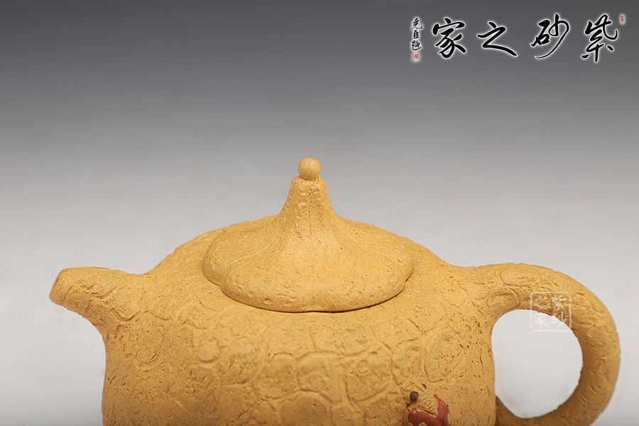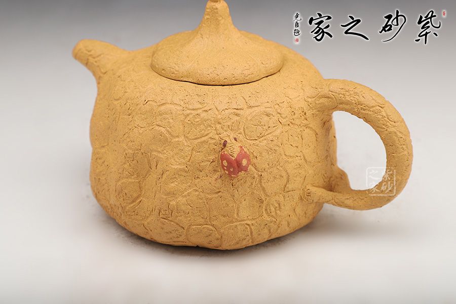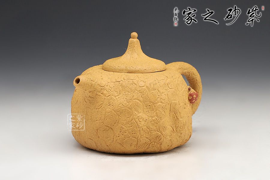 壺身斑駁,紋理錯雜繚繞,色澤渾樸,古韻優(yōu)雅。壺腹微癟,瓜蒂式壺鈕,大有返璞歸真之意境;壺身輕巧,端握舒適,凹凸自然,渾身紋路密集卻不繁亂,老味十足;壺嘴精巧胥出,嘴口圓潤,出水流暢;端把粗細均勻,支撐力更強,更加穩(wěn)固。