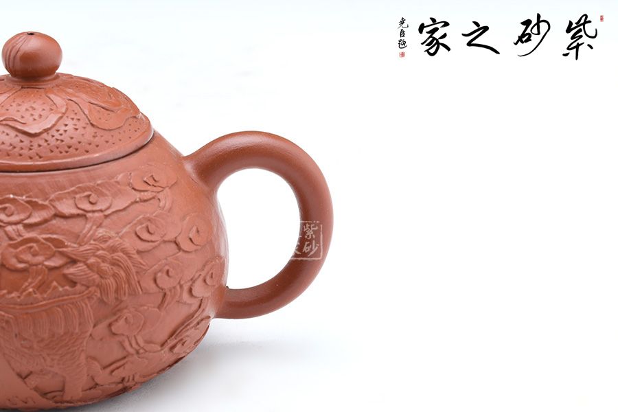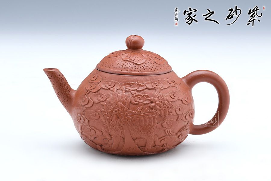 此款壺器是老師在傳統(tǒng)壺型的基礎(chǔ)上創(chuàng)新而來(lái),做工小巧精致,壺身通體為蛋狀,寶珠形鈕,直流嘴,出水干凈利落,耳形把端拿舒適,微凸壺蓋上雕塑圖案,麒麟送子寓意吉祥如意,帶來(lái)福祿、豐年和長(zhǎng)壽。