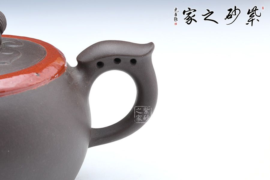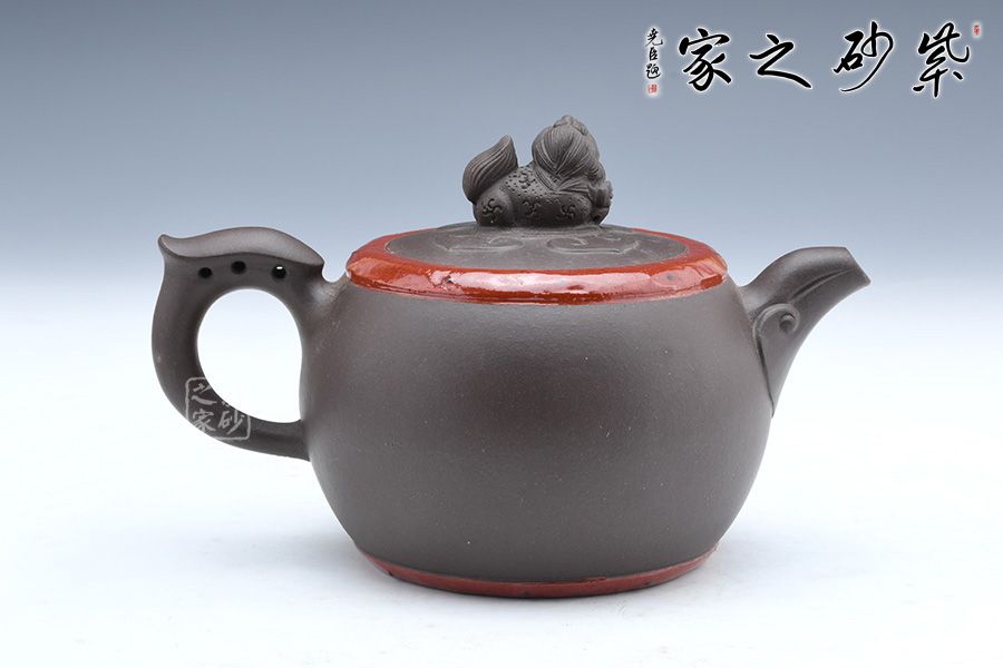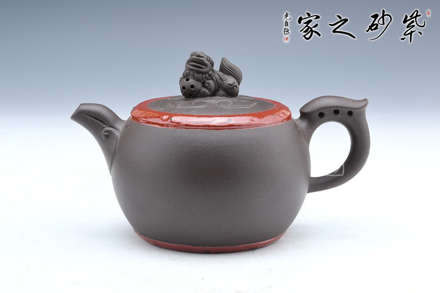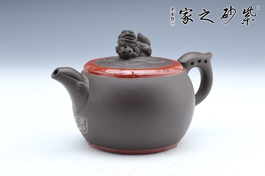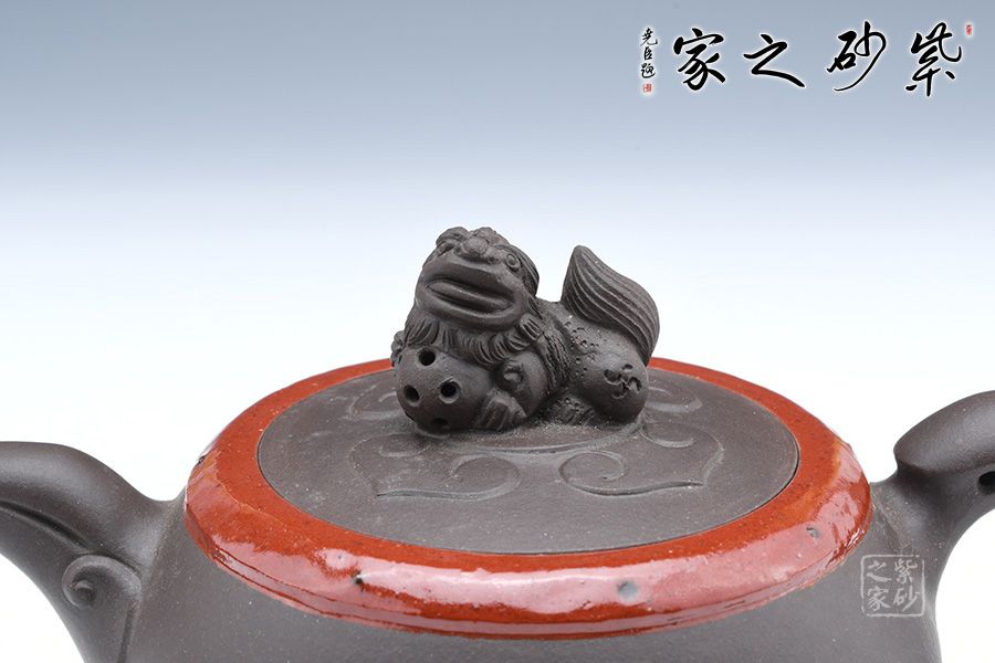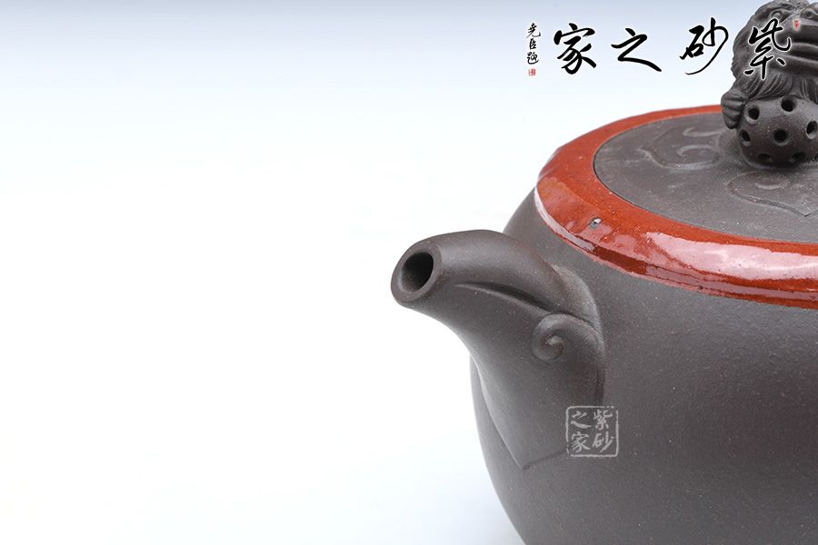 壺型以民間樂器大鼓為身,上下對稱,壺身邊緣起帶狀線,貼錦鼓子作裝飾,假底平整,嵌蓋嚴(yán)密、通暢。以瑞獅形狀做壺鈕,造型別致,拿捏方便。整壺造型簡約,卻別具韻味,一種厚拙古樸的觀感。
