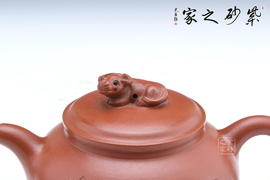以光素圓器工藝與雕塑工藝相結(jié)合完成的此壺,壺身豐潤,壺鈕以壯碩的春牛為形。 臥伏稍息的春牛,昂首伸展,似在仰觀世界萬象,體察人間百態(tài)。牛氣沖天寓意事業(yè)興旺發(fā)達(dá),紅紅火火、蒸蒸日上。