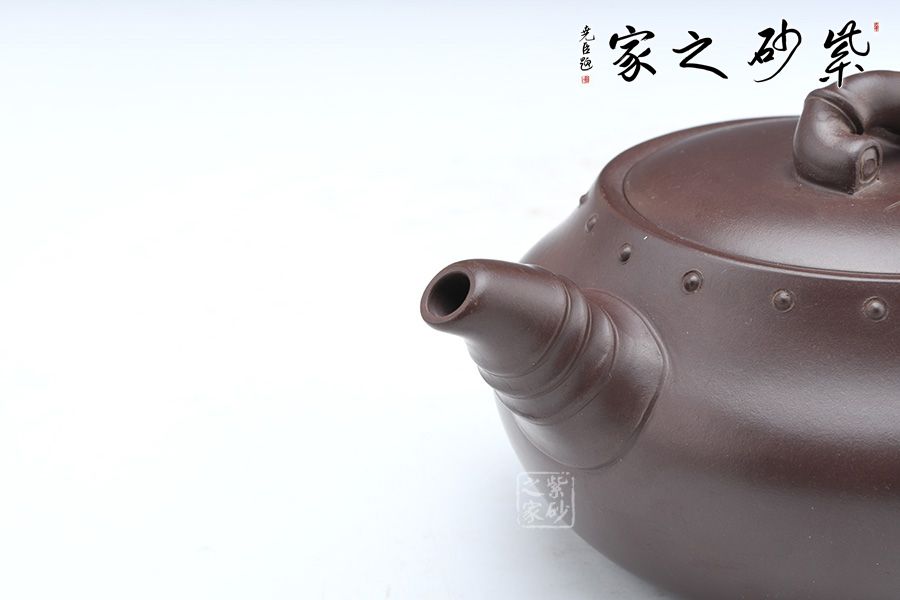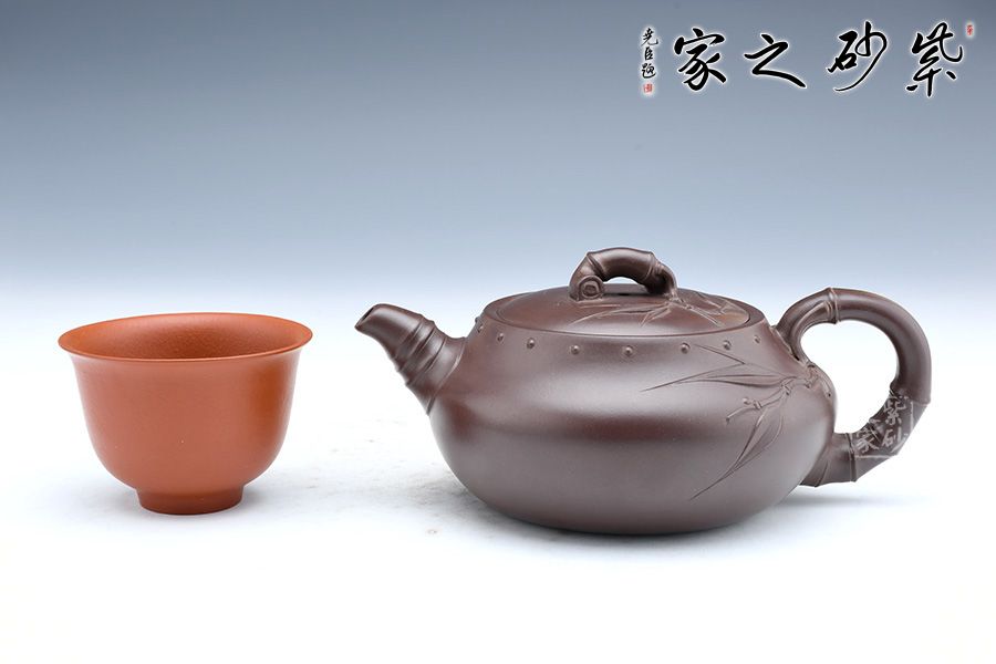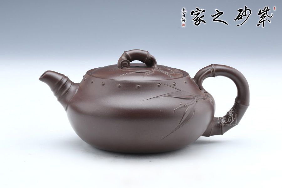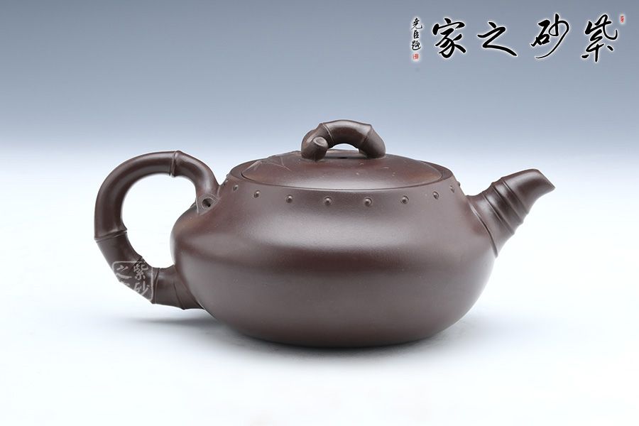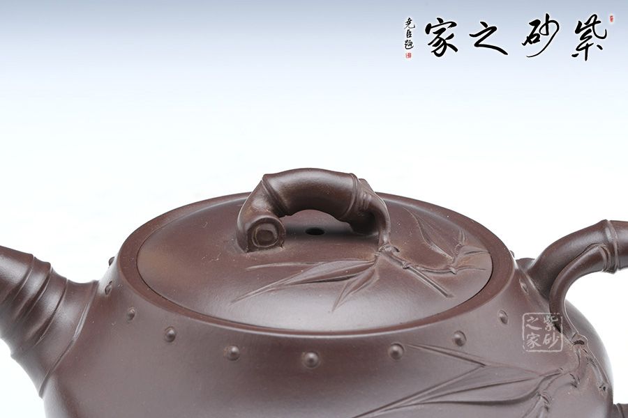 此壺以竹入型,融入禪味,是具有代表性的竹壺。壺身是器型飽滿,線條柔和,肩頸線條自然。截蓋平整光滑,其上的竹段橋鈕美觀逼真。壺嘴和壺把皆用竹為型,加以巧妙利用。壺嘴設(shè)計(jì),簡(jiǎn)單利落。壺把竹節(jié)自然,更有竹葉裝飾,顯得清新,拿捏適手。