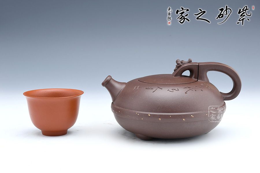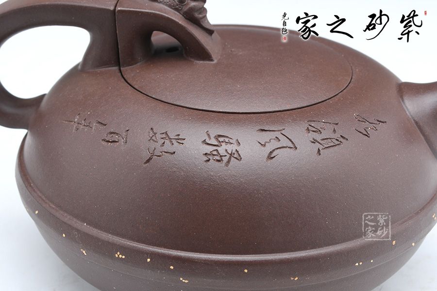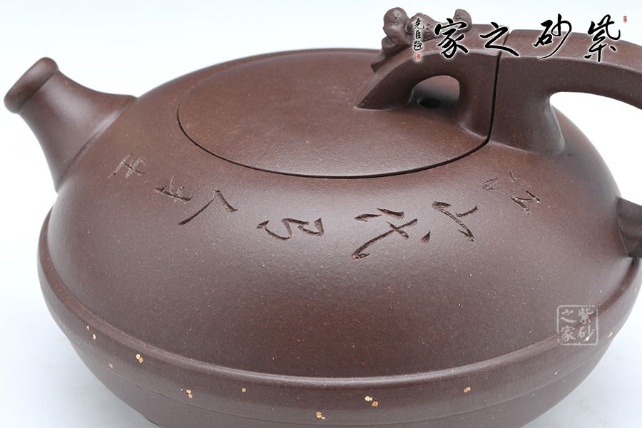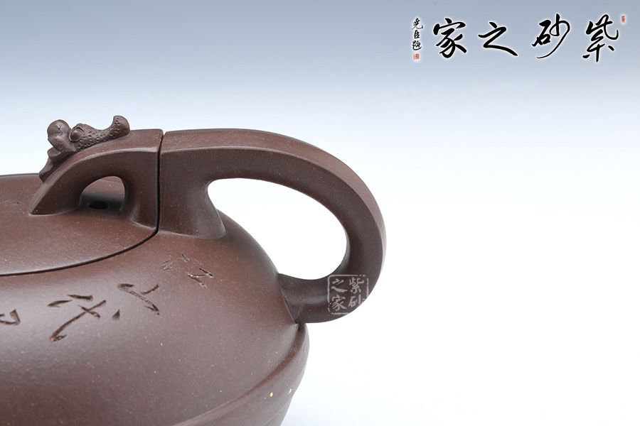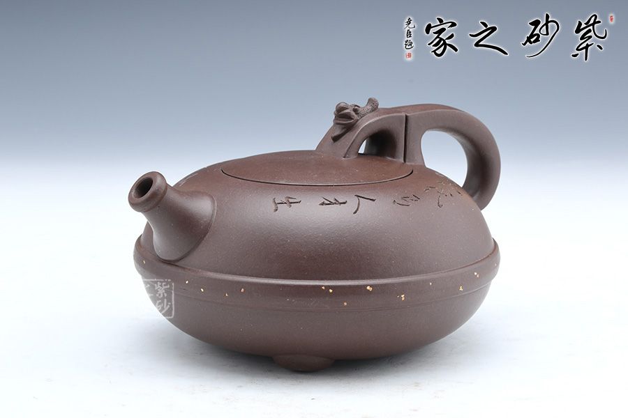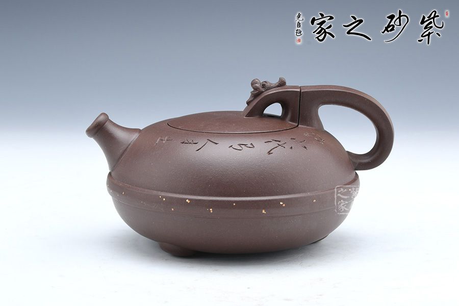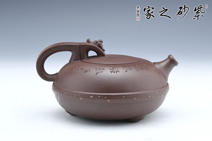 這款壺器精選原礦底槽青泥料制成,質地特純,泥質細膩、成色穩(wěn)重。壺身形似兩個半月形合扣,直流嘴出水干凈利落壺腹腰帶玉束采用撒金工藝手法,壺把與壺鈕渾若一體,龍首裝飾古樸自然,更顯氣韻高雅華貴。