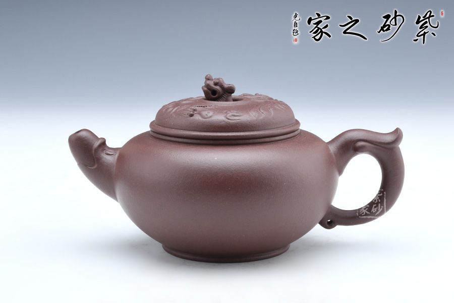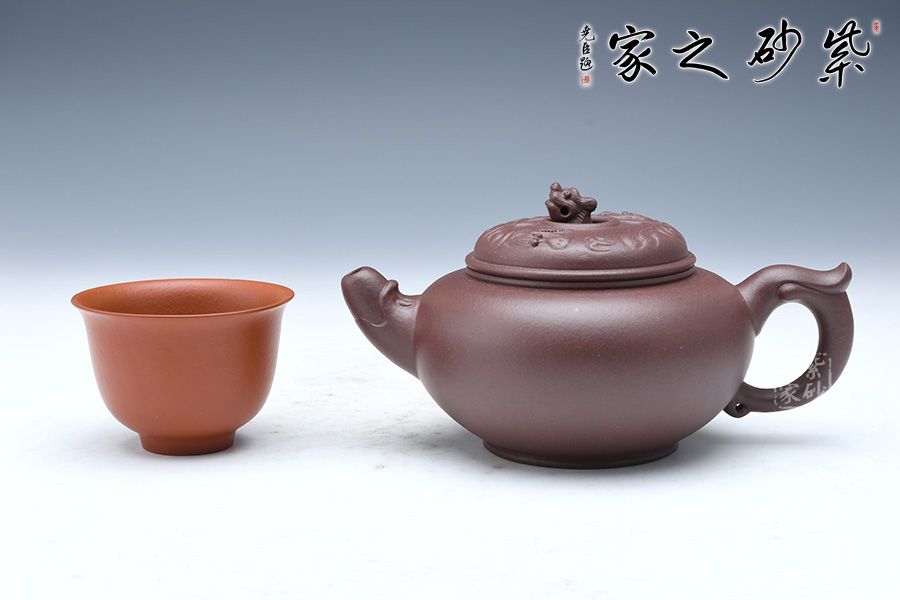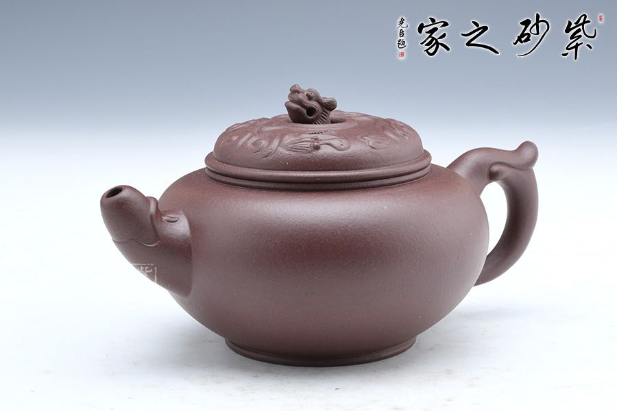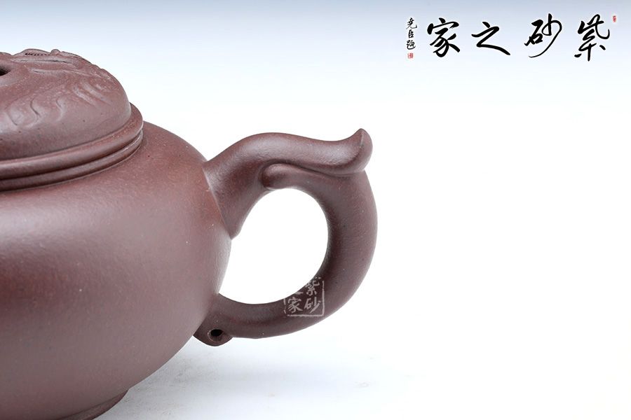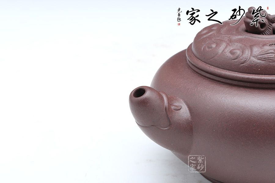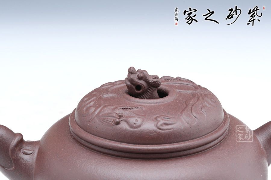 此壺是老師在傳統(tǒng)的壺型上增添了新意,壺身呈扁圓形,圈足底設(shè)計(jì),壺嘴壺把以龍為主,龍形壺鈕從壺蓋中沖出,整體活靈活現(xiàn),栩栩如生,經(jīng)典之作,精工細(xì)作,完美呈現(xiàn)。