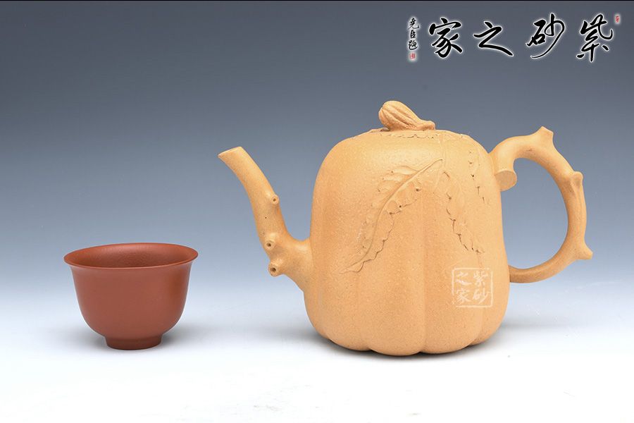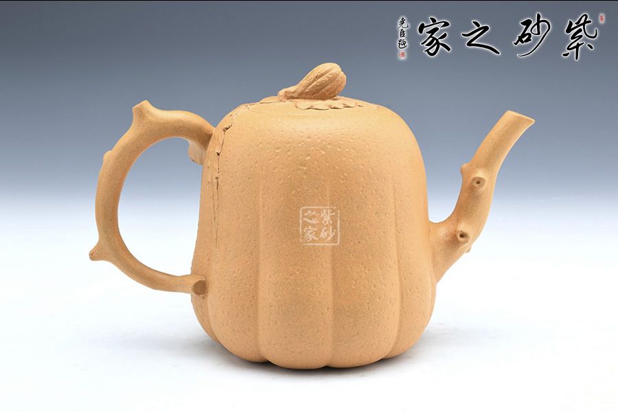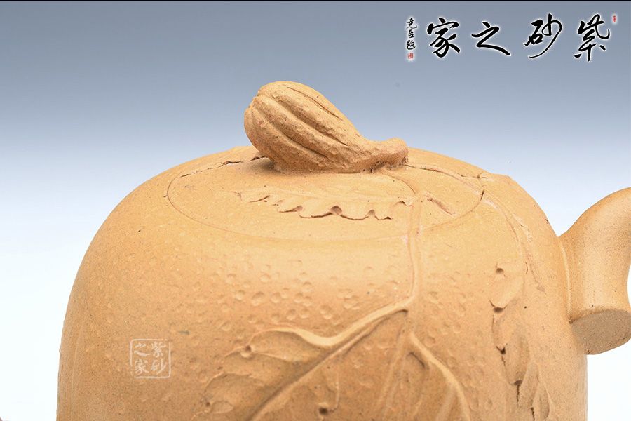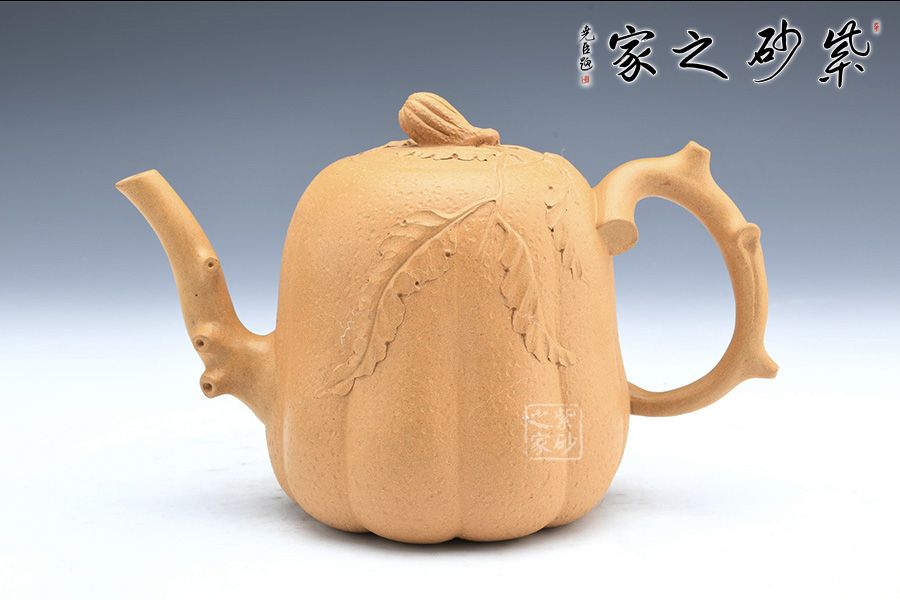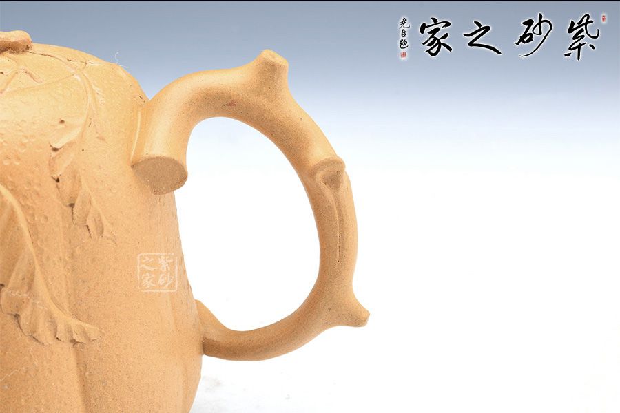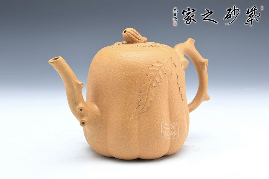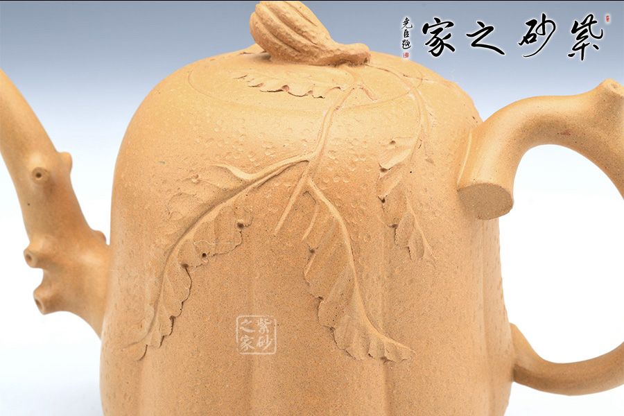 壺身以筋紋手法制作,突出佛手仿生形態(tài),壺嘴壺把以枝蔓為形,極具骨感,手工貼花靈動自然,好似幾片葉片散落一般,情趣盎然!