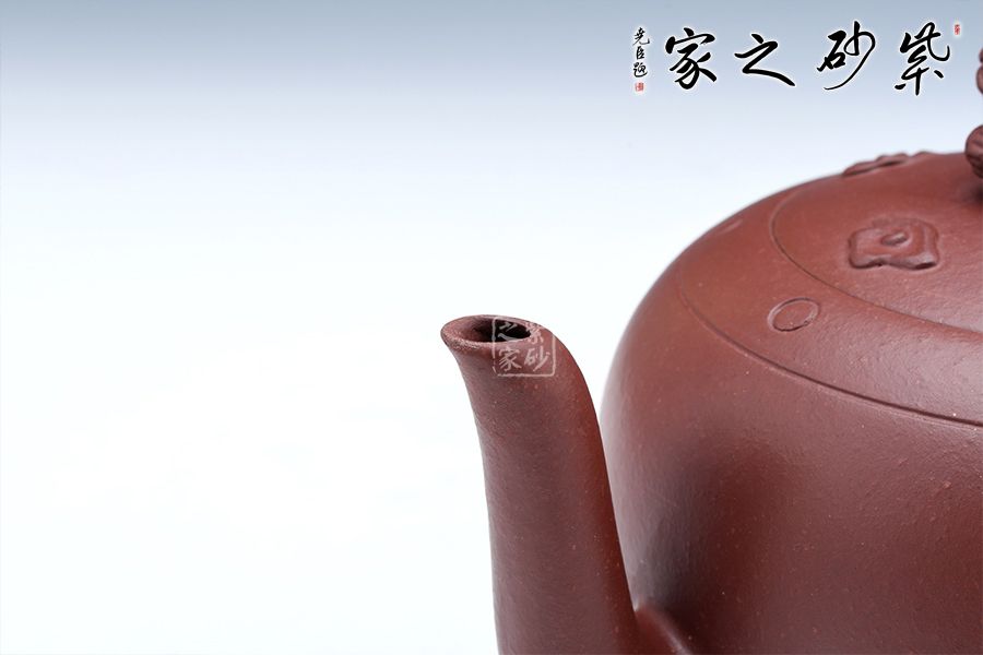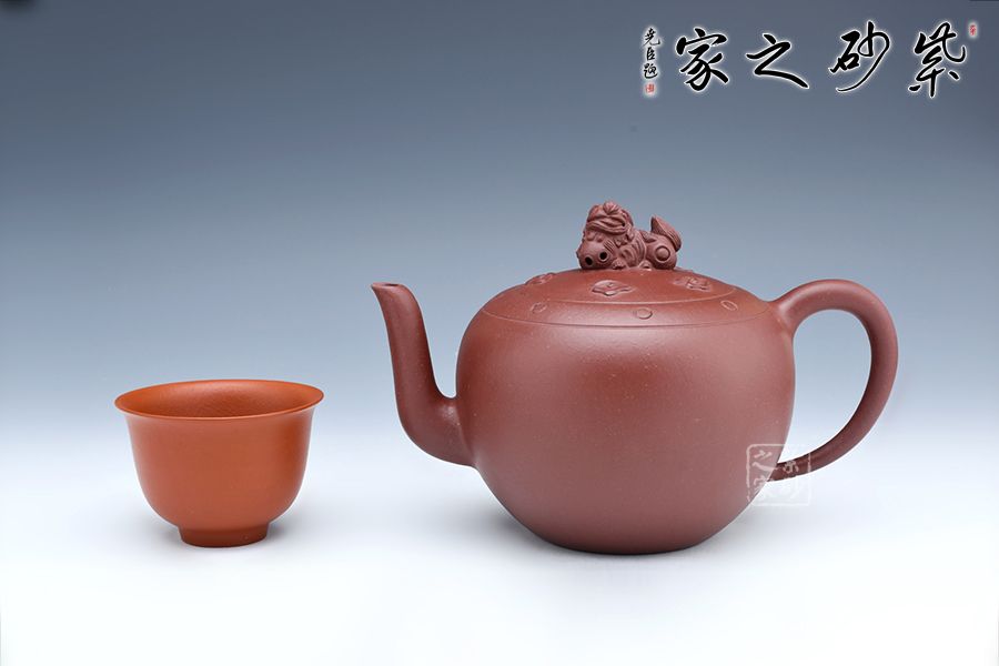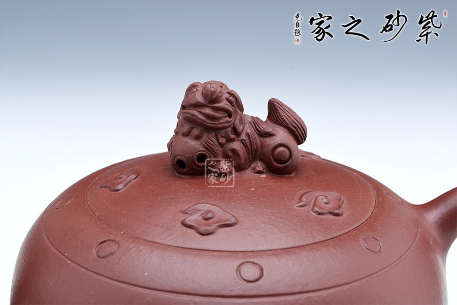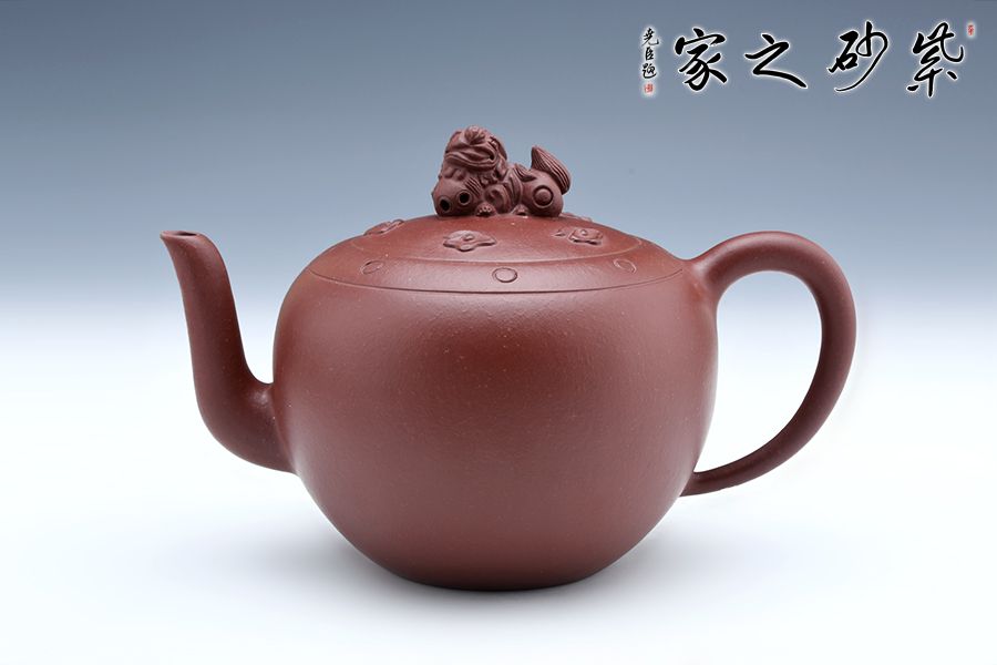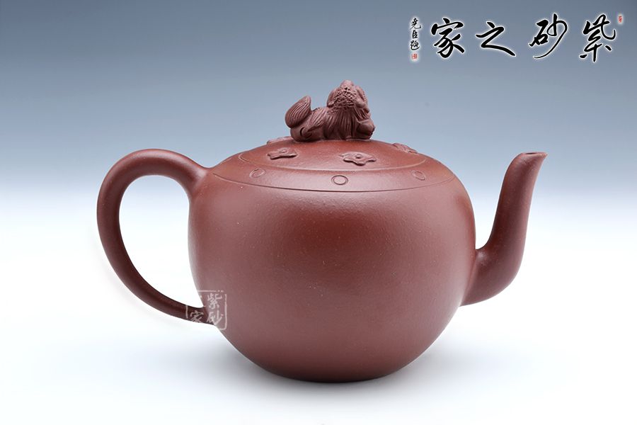 獅球壺盛行于清末民初,清末著名紫砂名家江案卿是因獅球壺器形名聲大振。紫泥泥料堅致,呈深紫色,壺身圓潤飽滿,蓋鈕塑以伏獅,信手拈來,氣暢神怡又憨態(tài)可掬。