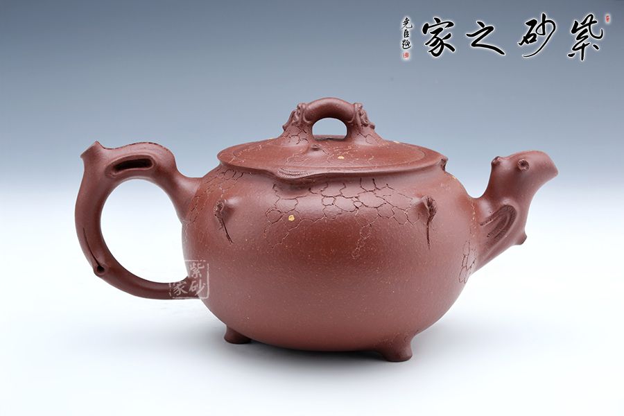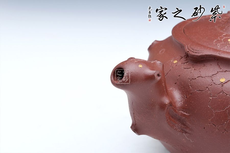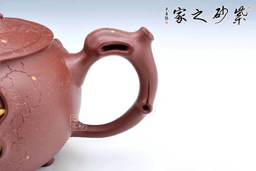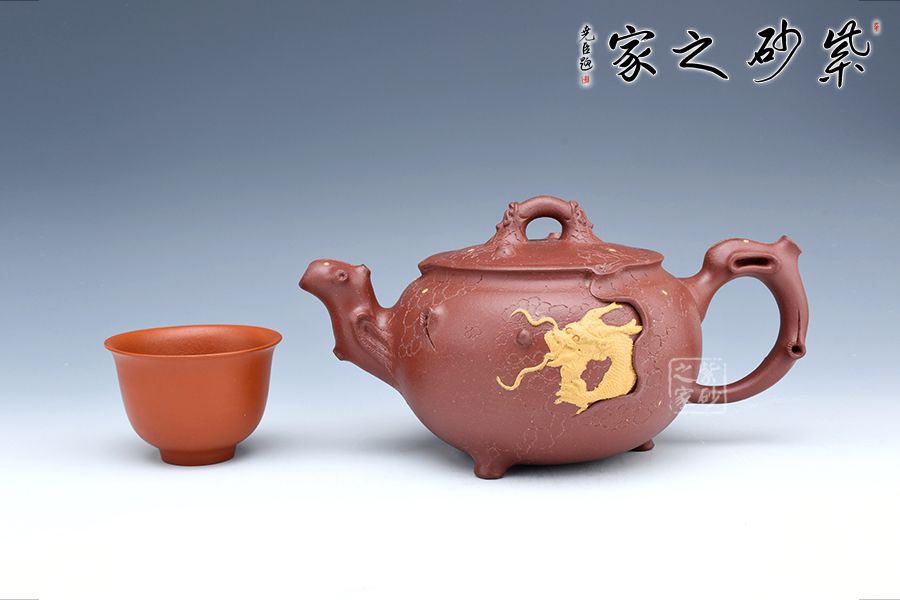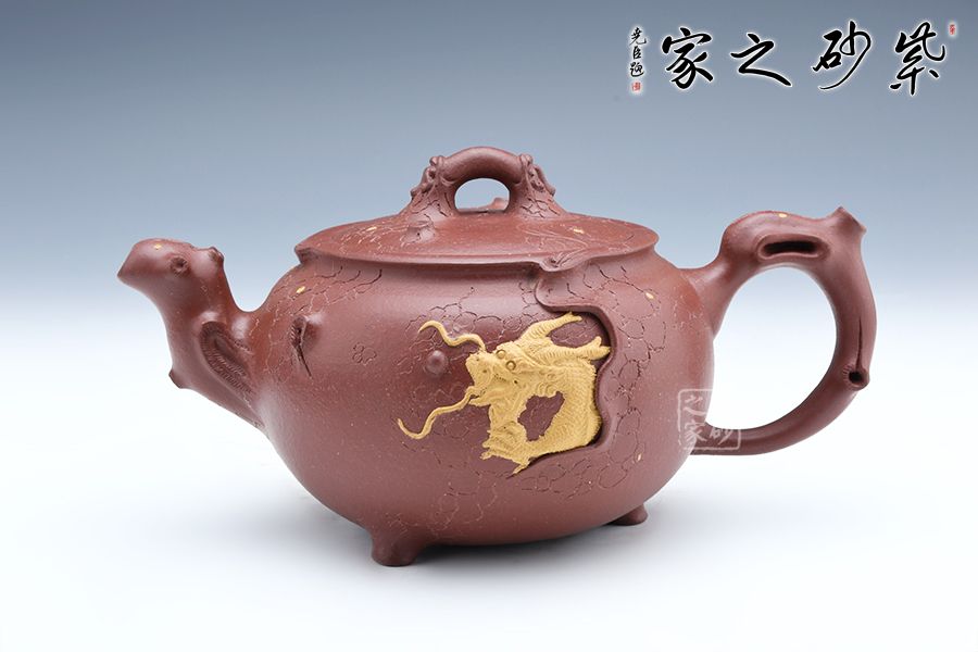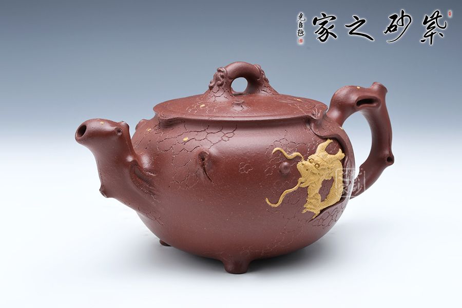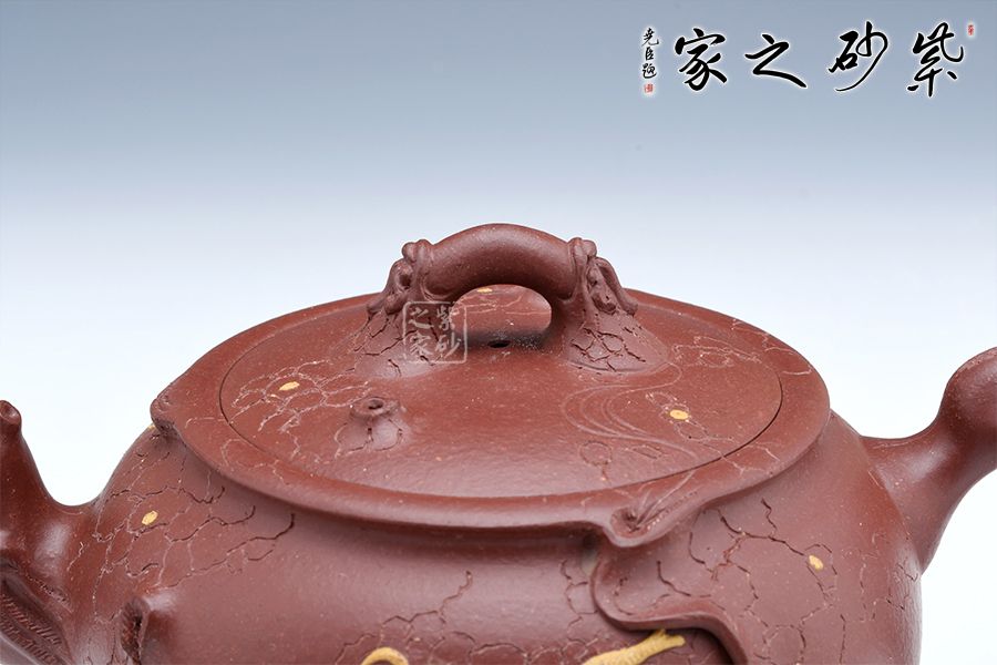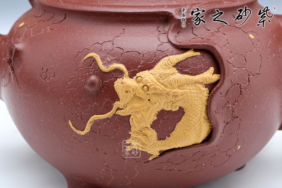 此壺以龍供春為原型,傳統(tǒng)器上加以創(chuàng)新,三彎流與把呼應(yīng),張力十足,壺鈕與壺身以祥龍為裝飾,金龍盤桓于壺上,盡顯霸氣,壺身有如老樹(shù)疙瘩,癭節(jié)滿身,不但突顯出其精工細(xì)作,亦展現(xiàn)出其深厚的制作功底。