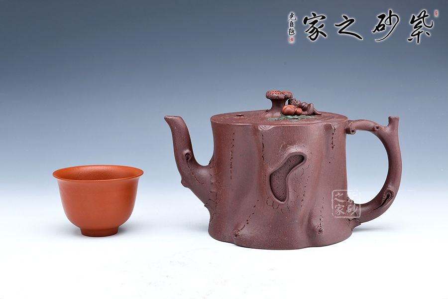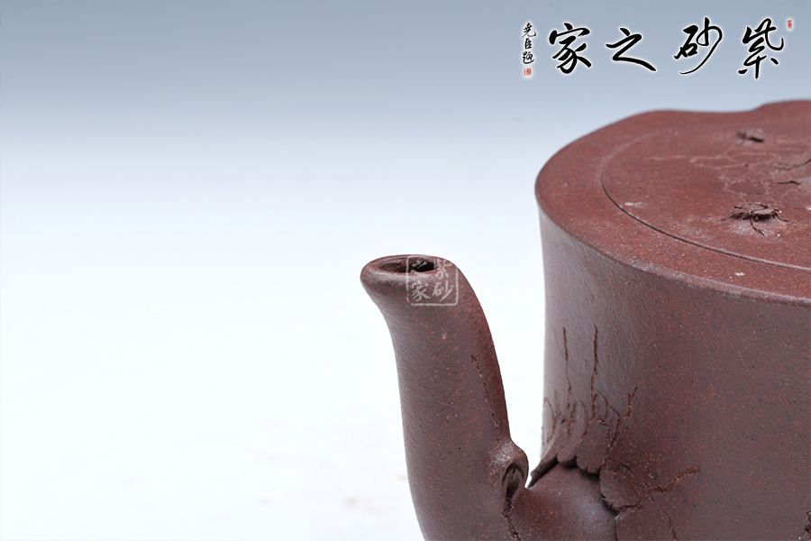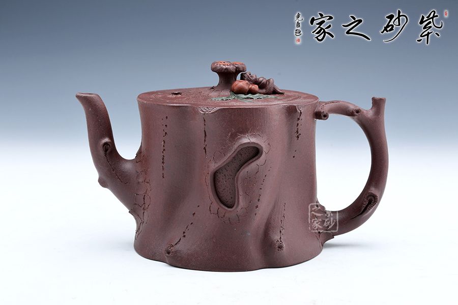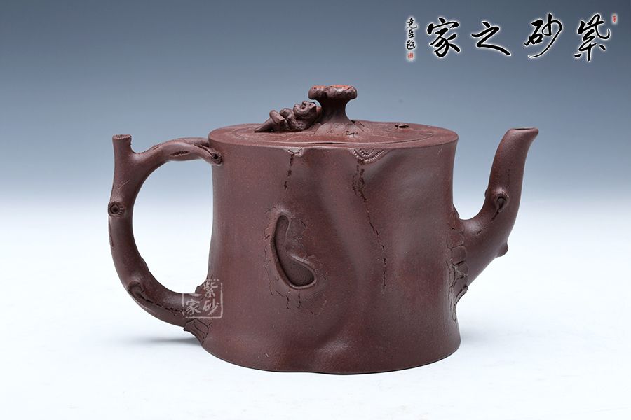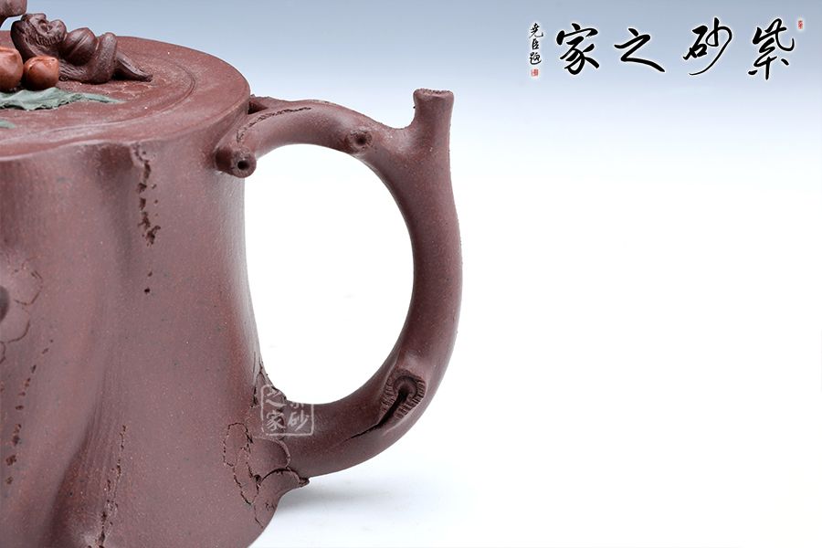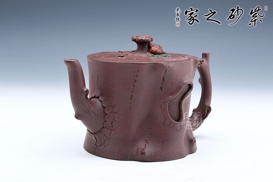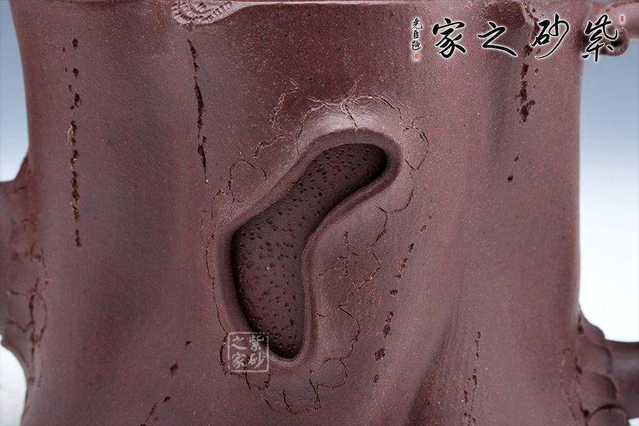 樹木的形態(tài)上下貫通,逼真自然。樹樁粗細(xì)不同,上下全不規(guī)則,再加上各種瘢痕、裂紋、樹皮的模樣,更顯得樹樁十分生動(dòng)。壺嘴、壺鈕和壺把則是樹枝,有彎有直,有收有放,粗細(xì)不一,將樹樁壺點(diǎn)綴得尤其逼真。