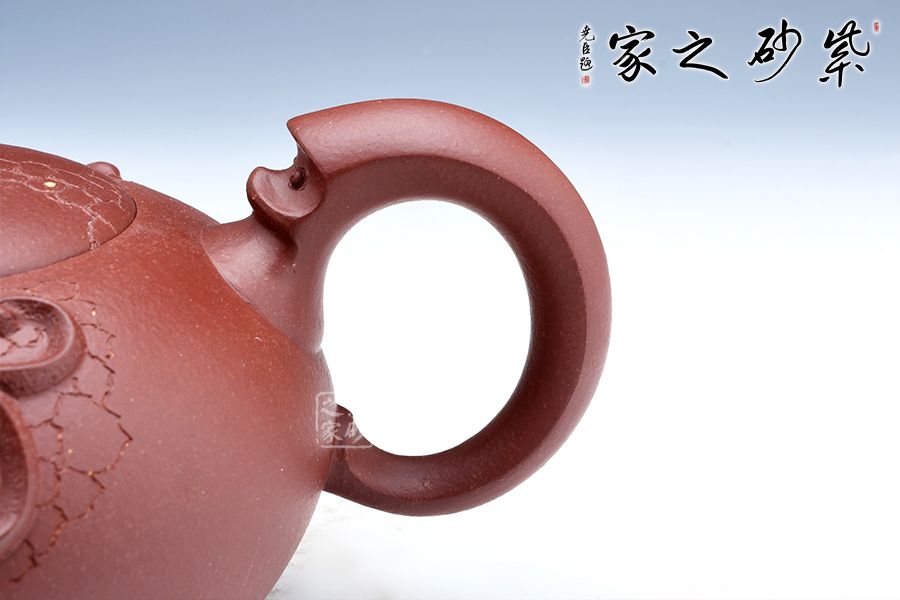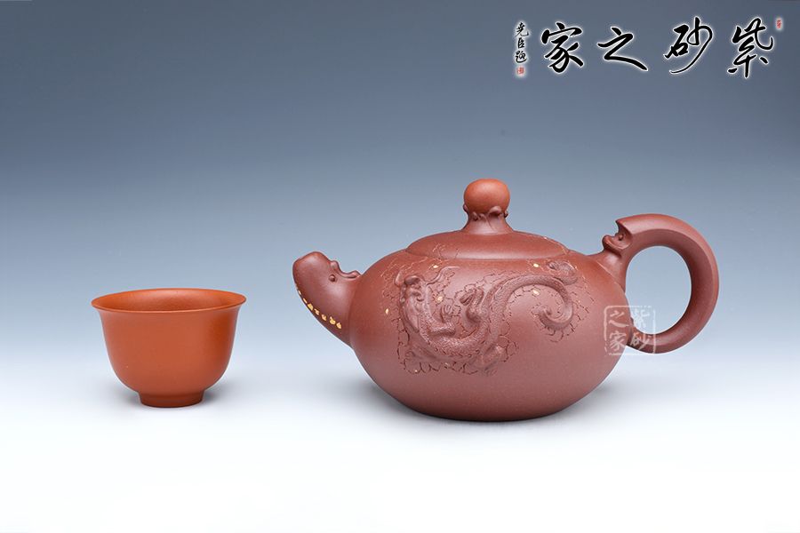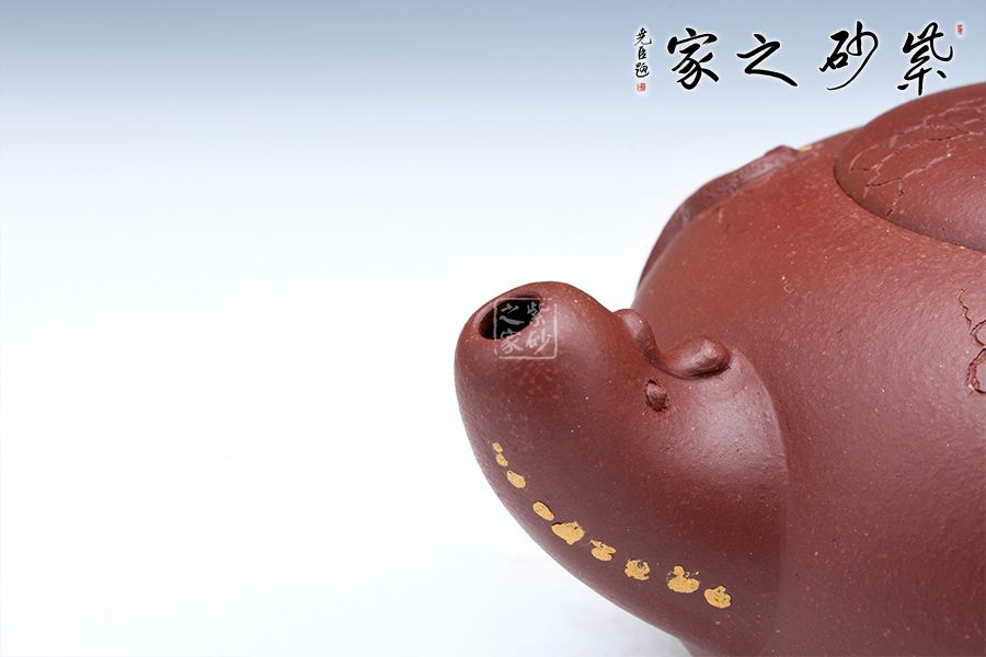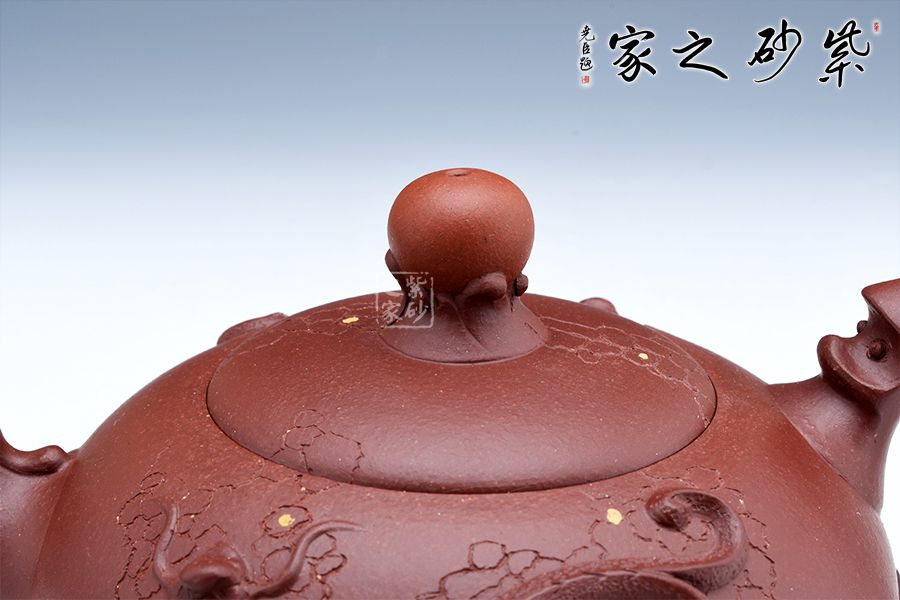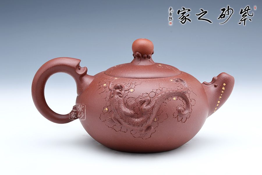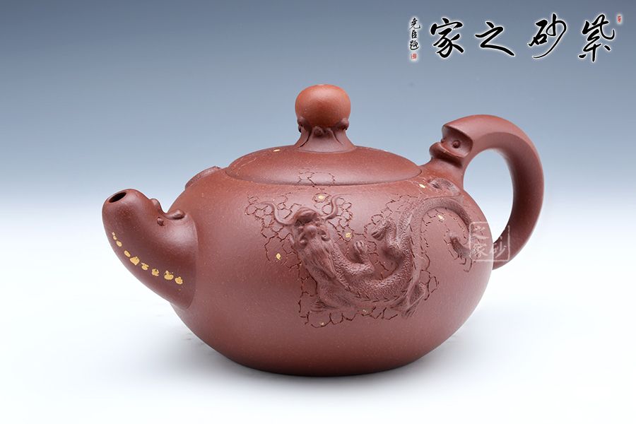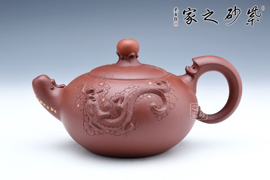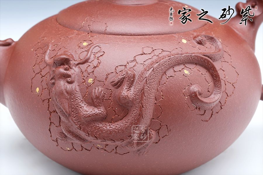 該壺珠圓玉潤(rùn),壺的流把以祥龍為造型,鈕如龍吐水,氣勢(shì)雄壯威嚴(yán),壺身采用鋪砂裝飾,熠熠生輝,古韻橫生,寓意明朗、和諧,有龍騰盛世之意。
