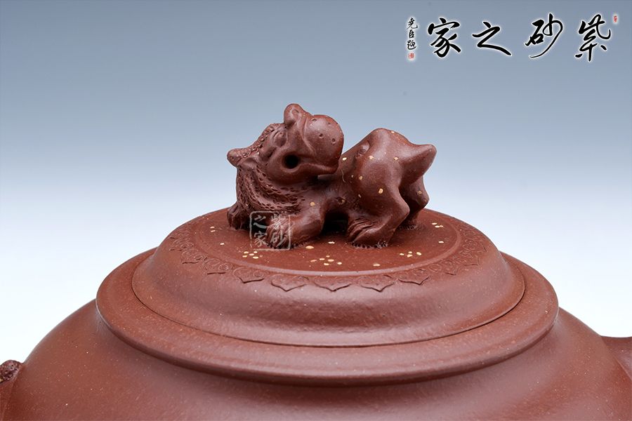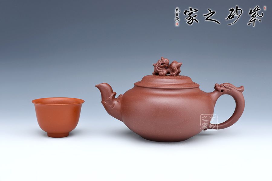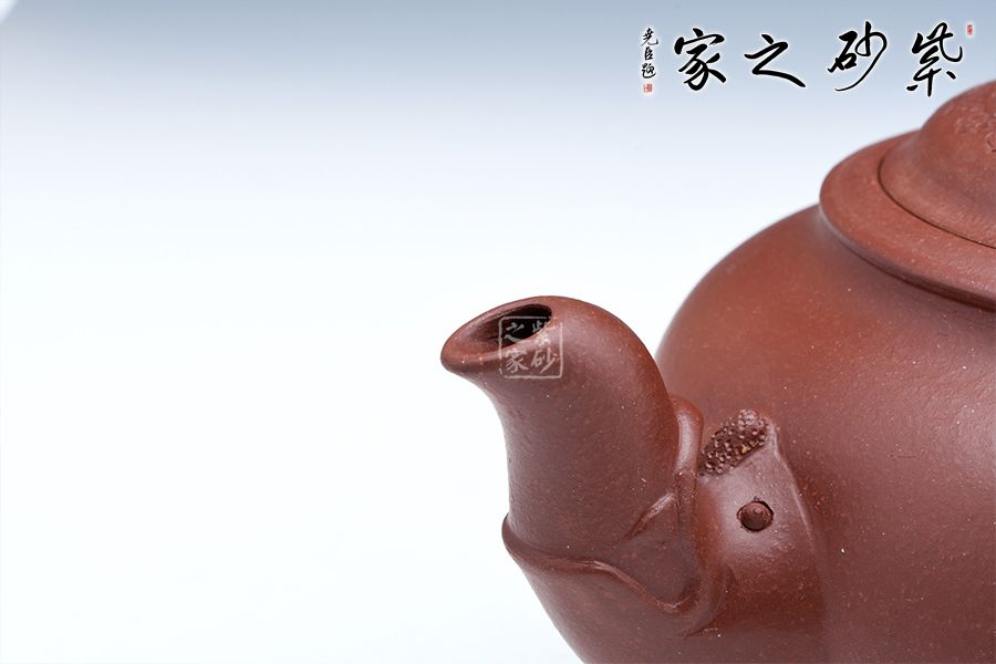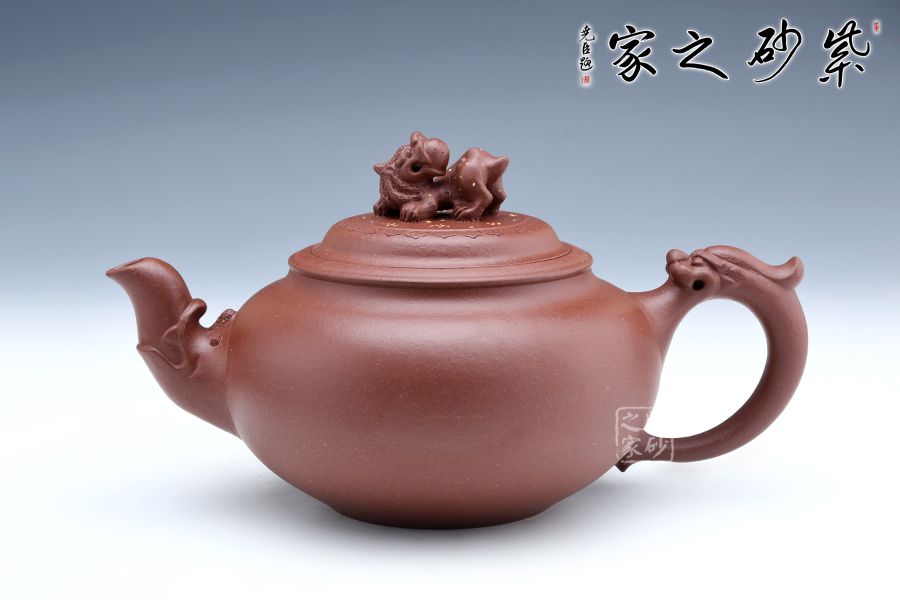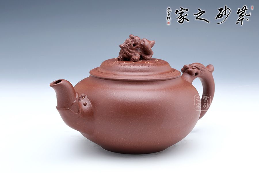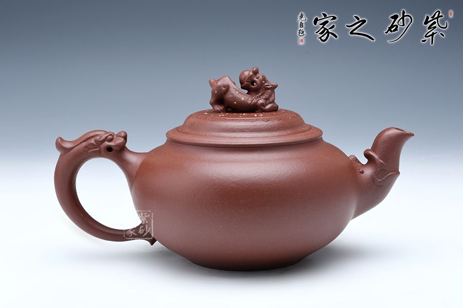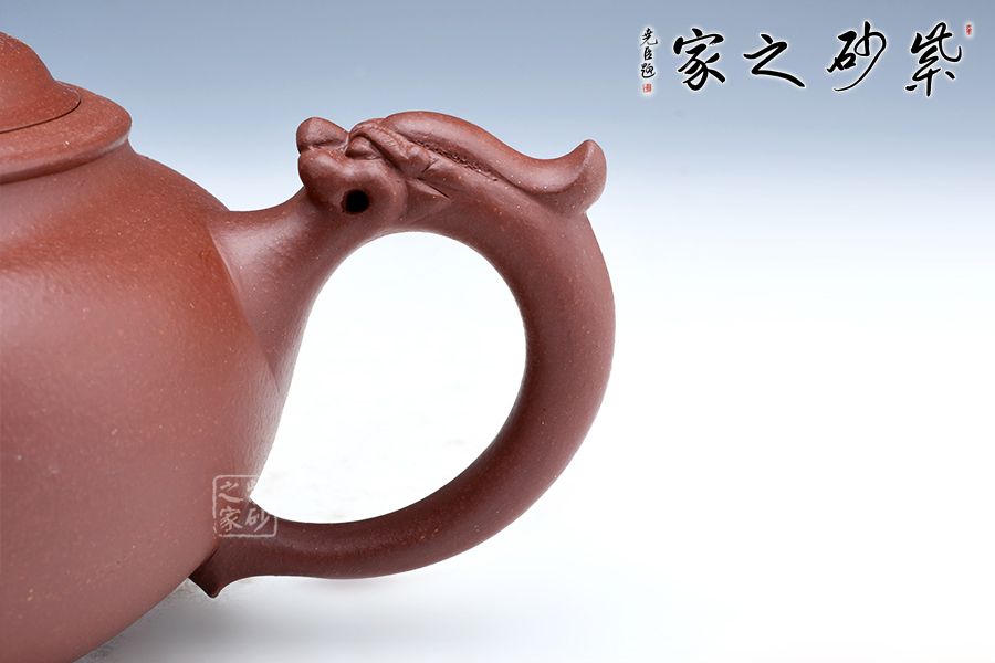 龍是中華民族的圖騰,是我們國(guó)家精神的象征,以“龍”為主題的紫砂作品不在少數(shù),壺嘴與壺把就猶如龍首和龍尾,整體就像一條祥云穿壺而過,壺鈕塑為龍首造型,不僅逼真?zhèn)魃瘢茉诙宋盏臅r(shí)候起到防滑的作用,可見實(shí)用性和藝術(shù)性俱佳。