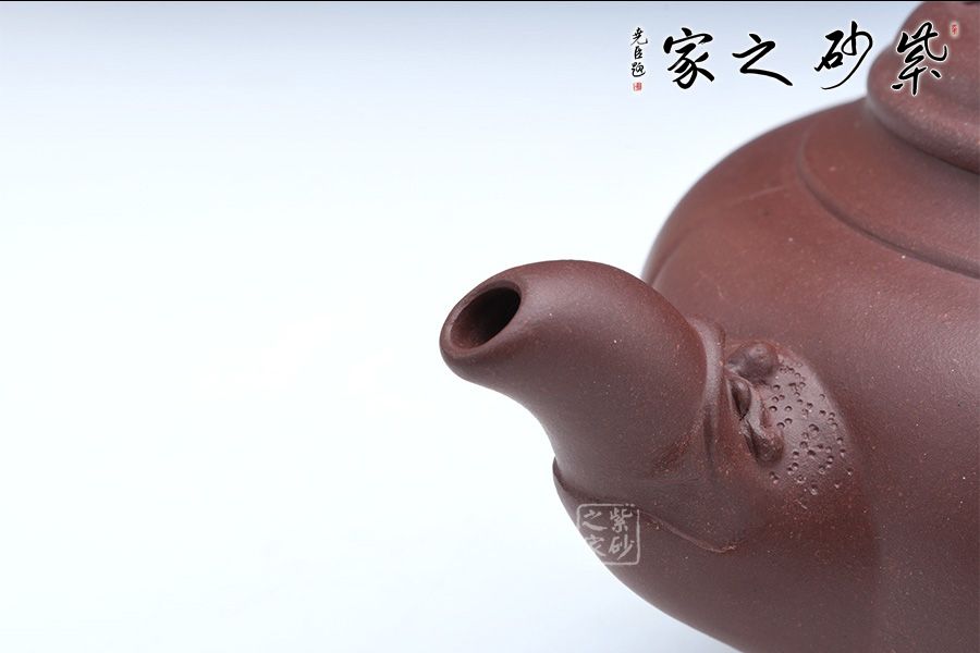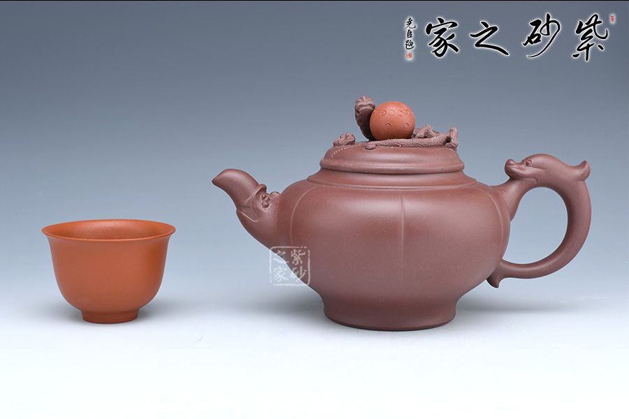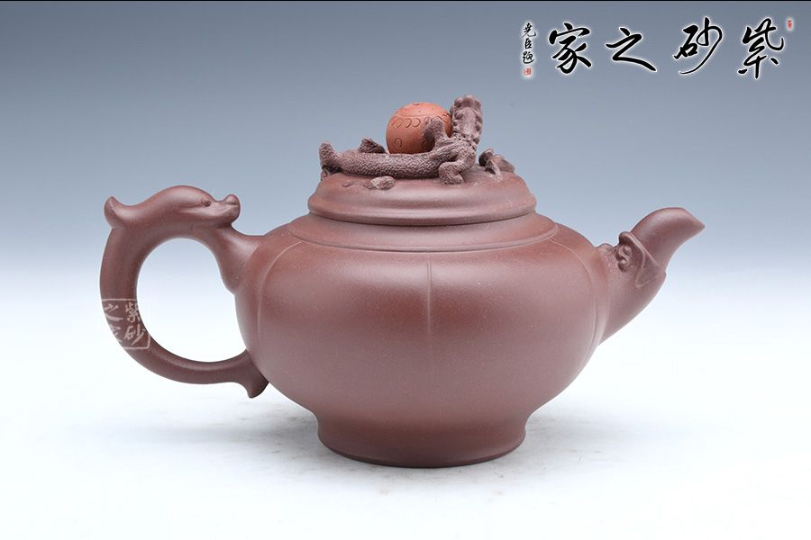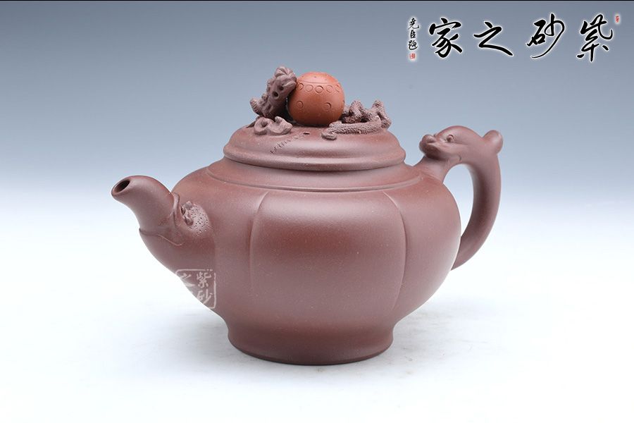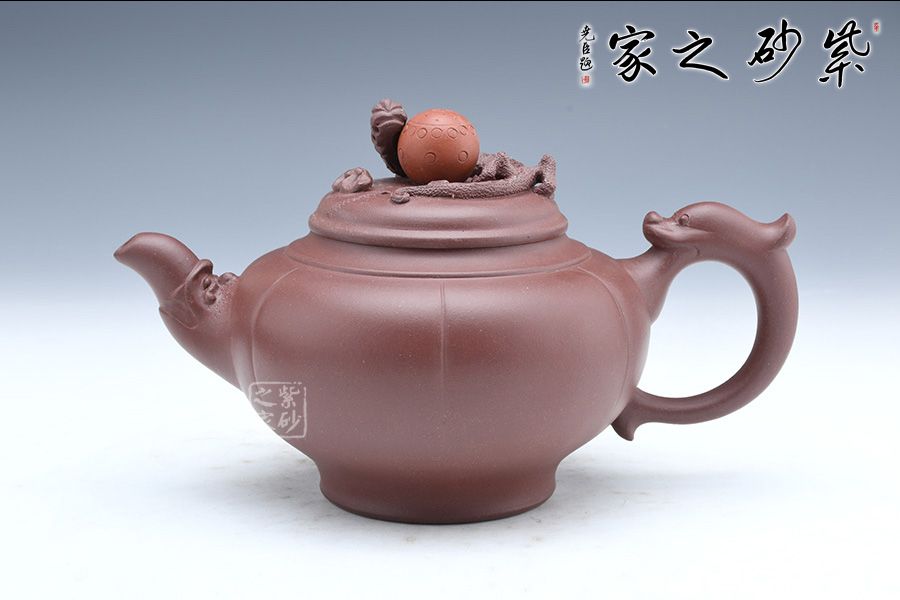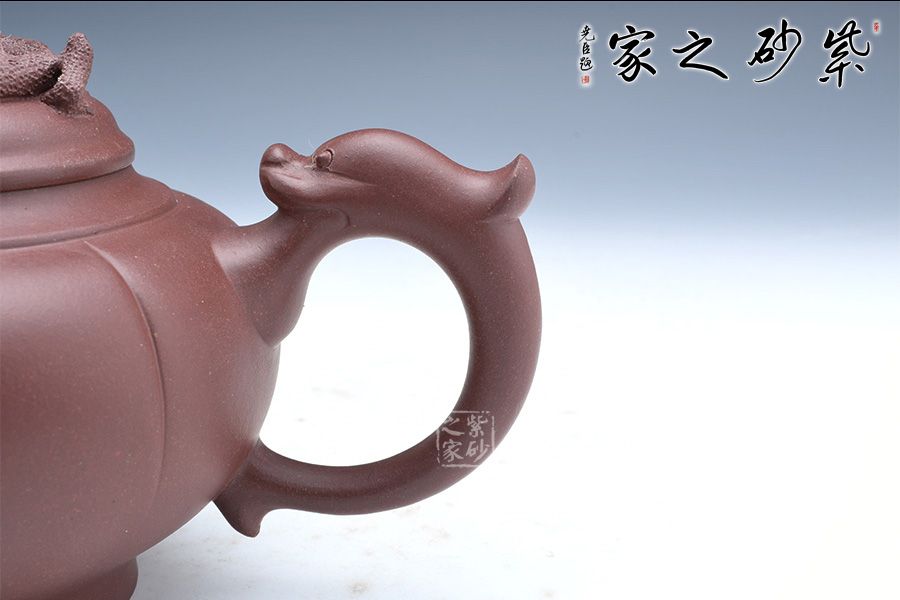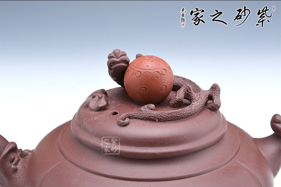 壺身圓潤,線條感強,結合筋紋制作工藝和手工雕塑工藝,難度大,成品率低,壺鈕以清水泥裝飾,寓意鴻運當頭,螭龍盤踞,大氣凜然!