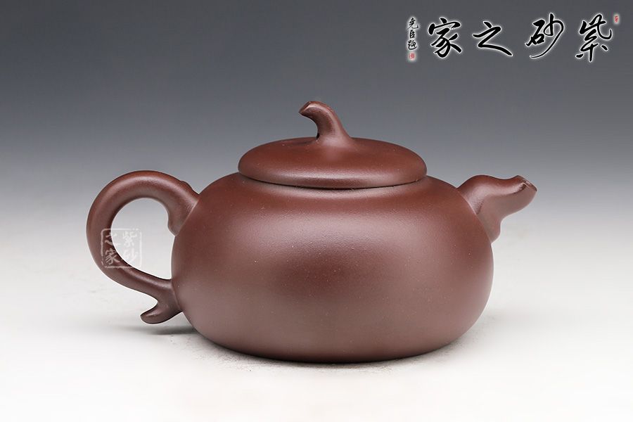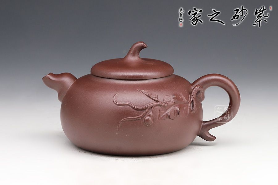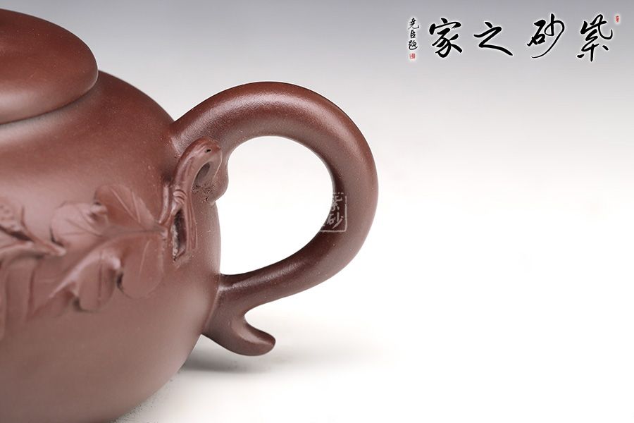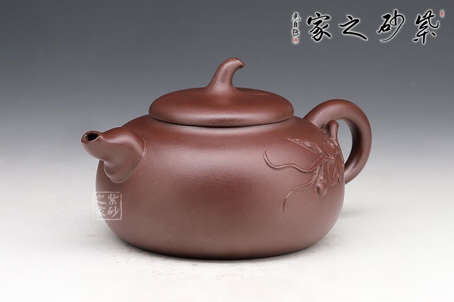 此壺壺身圓潤(rùn),腹肚大可納福。截蓋設(shè)計(jì),與壺身形成優(yōu)美的葫蘆形體;三彎壺嘴,出水爽利。耳把拿捏舒適,一枝自然蜿蜒的葫蘆藤延伸至壺面,葉、果,似從藤處牽出的一抹生機(jī)。壺鈕精巧,器型簡(jiǎn)潔素雅,值得收藏!