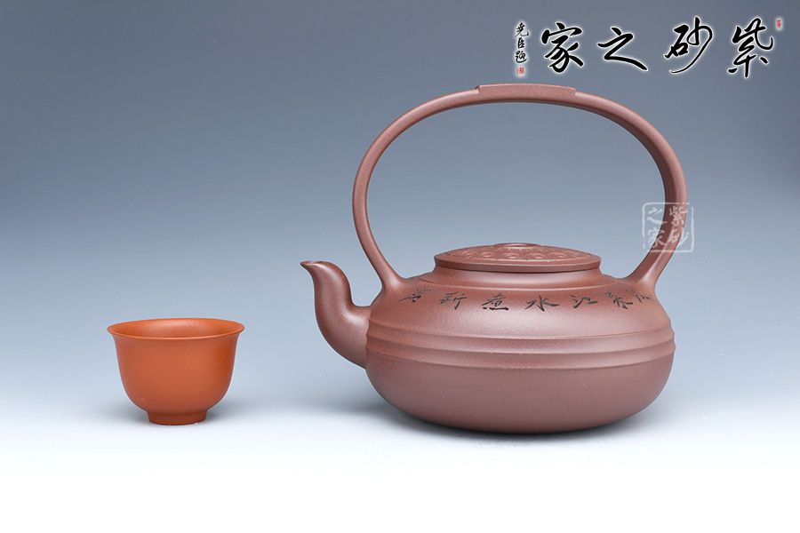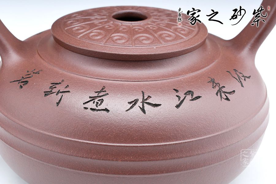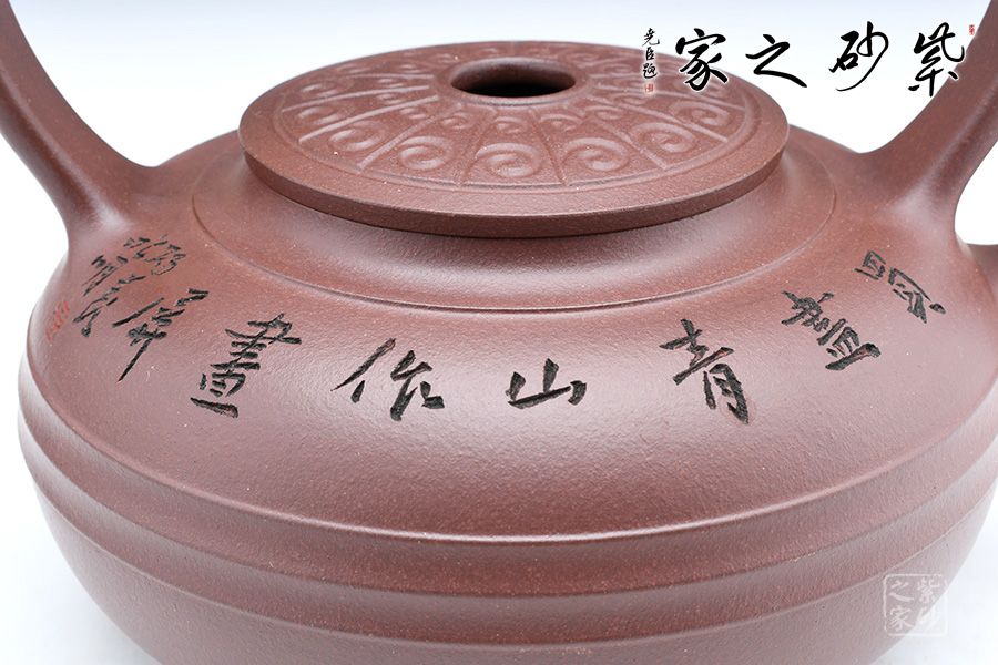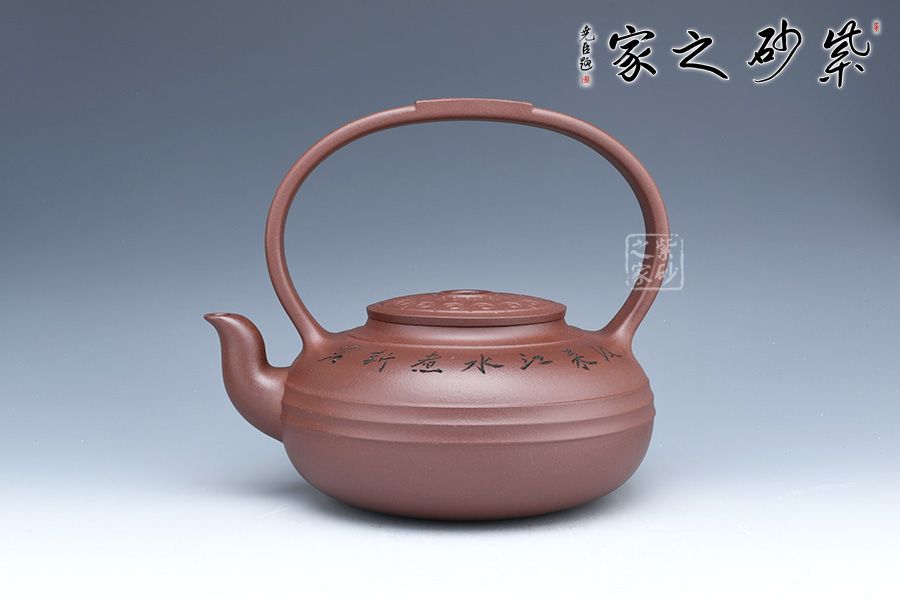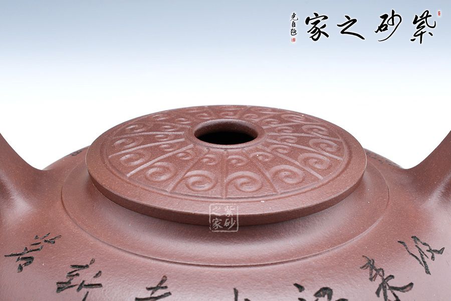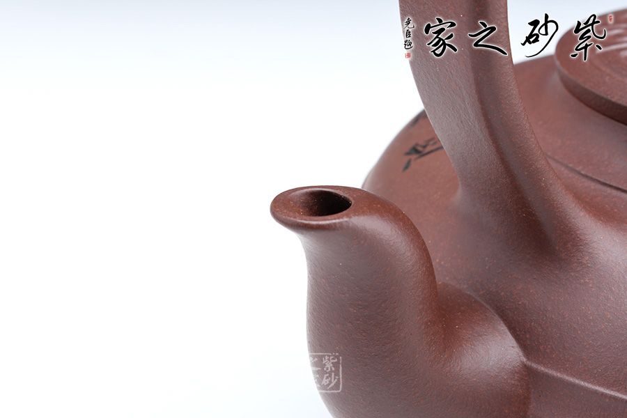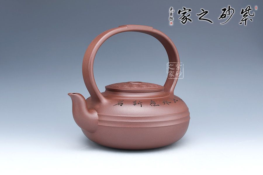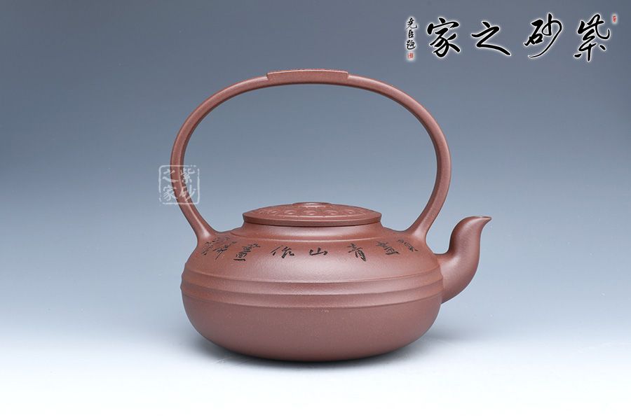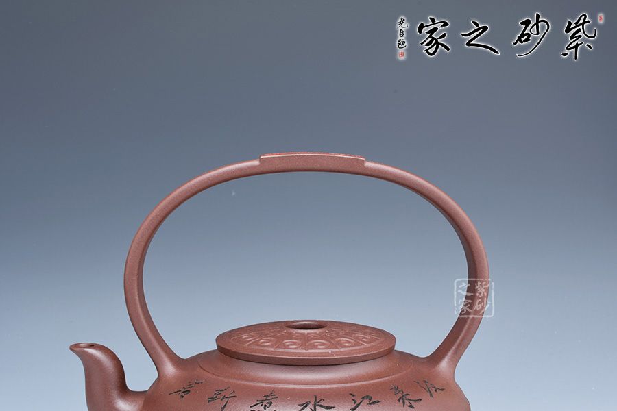 此壺提梁造型,氣勢磅礴,壺型簡約干練。細(xì)觀此品,給人一種頂天立地,穩(wěn)實厚重的感覺,壺身呈扁寬型,步步高升,雙層蓋飾以如意裝飾,提梁雙層設(shè)計,高于壺身的提梁帶來提拉的視覺效果,很不錯的一款器型!