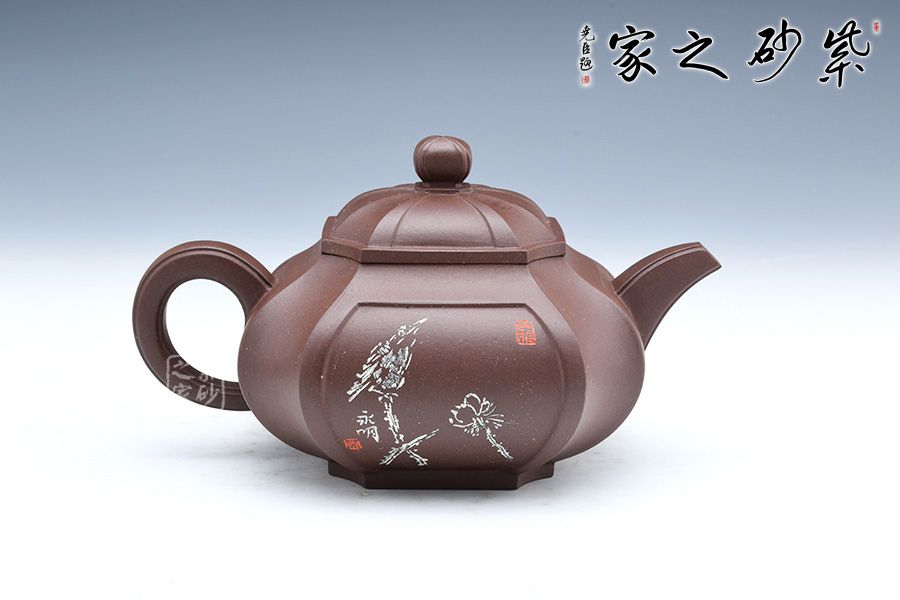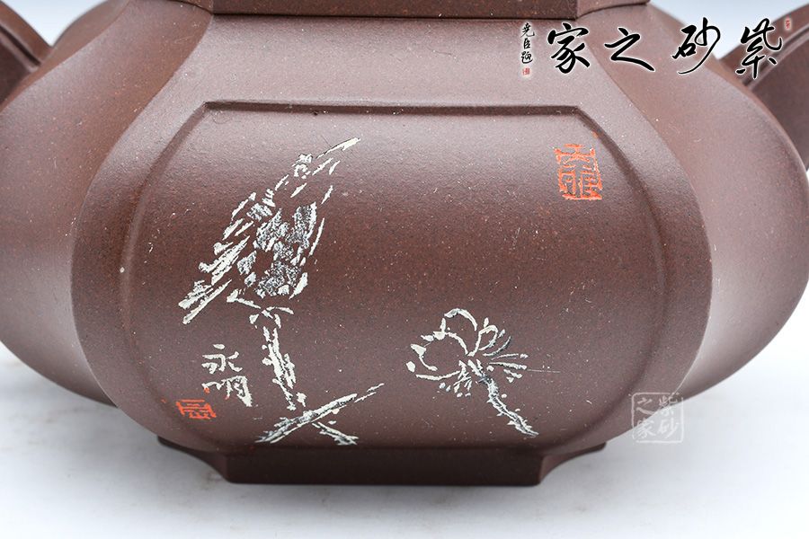 此壺為四方側(cè)角,造型古樸典雅,形器雄健嚴(yán)謹(jǐn),線條流暢和諧,大雅而深意無窮。泥質(zhì)細(xì)膩、成色穩(wěn)重。壺身筋紋,上下貫通,融為一體,壺蓋為壓蓋,壺鈕與壺身筋紋貫通,整體壺器自然流暢,均勻?qū)ΨQ,簡潔大方,圓中寓方,方中有圓。壺身開窗刻繪,極為清雅,做工難度大,賞藏價值高的一款壺。
