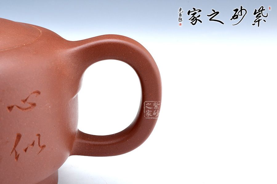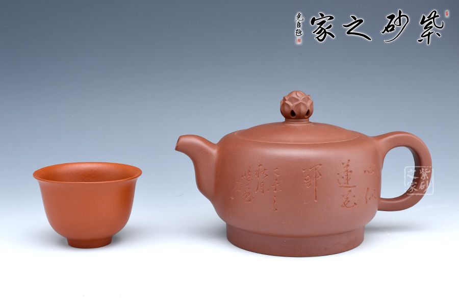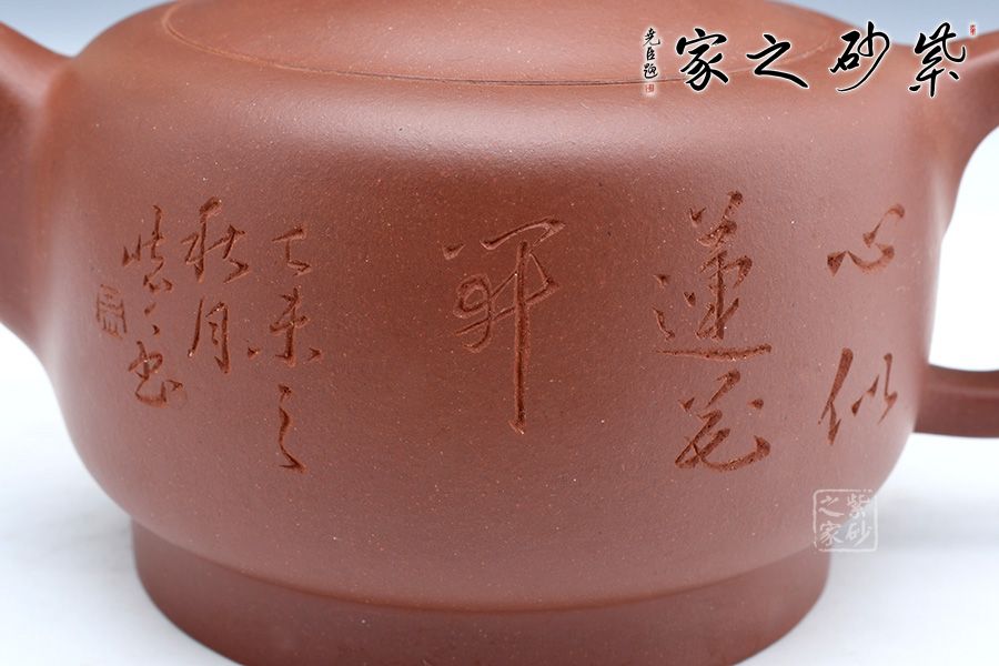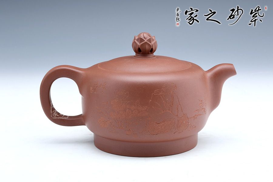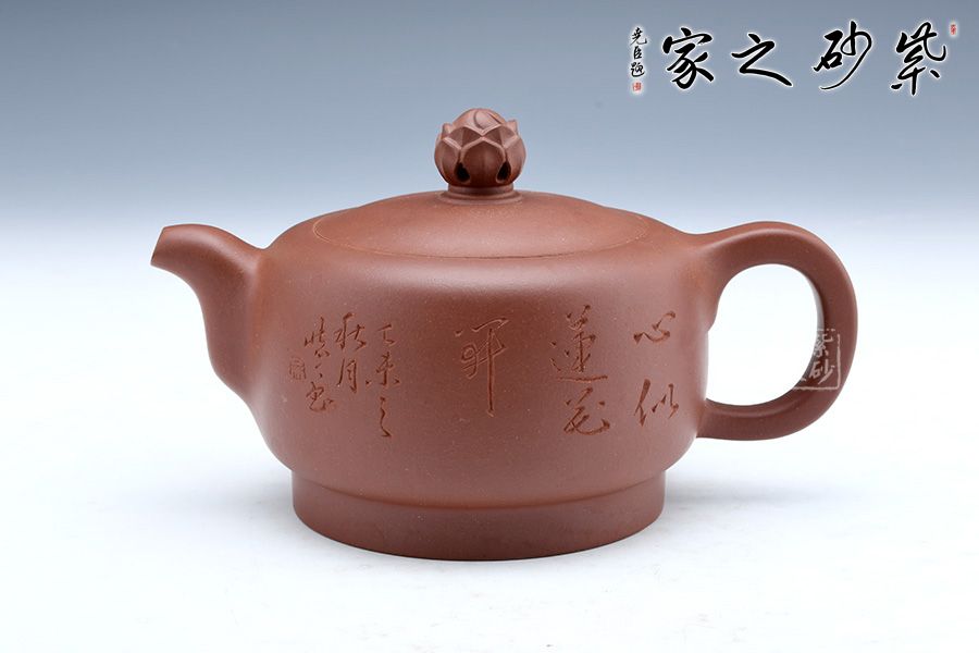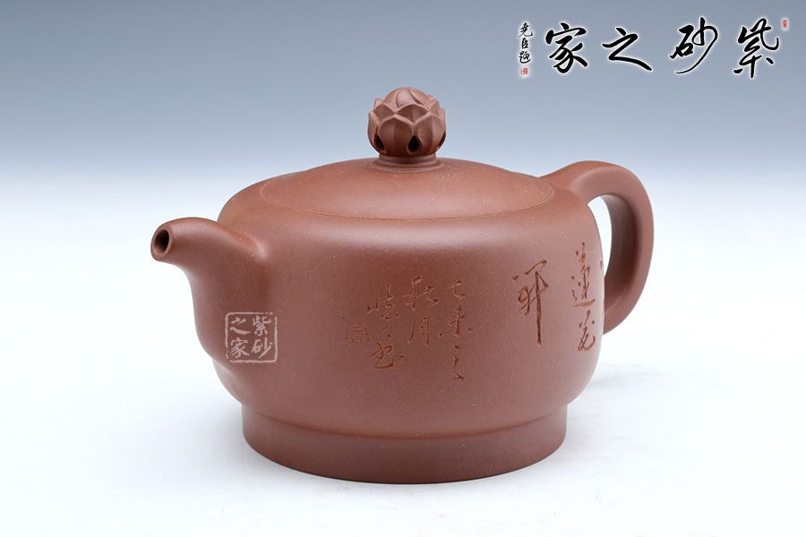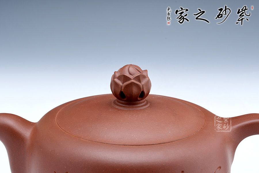 此壺經全手工制作而成,實用與欣賞相結合,大氣古樸,做工嚴謹,有獨特濃郁的文化氣息,壺鈕為一朵即綻放的蓮花,可以看到兩層花瓣包裹著的骨朵,花瓣溫潤肥美,令人如嗅蓮香。