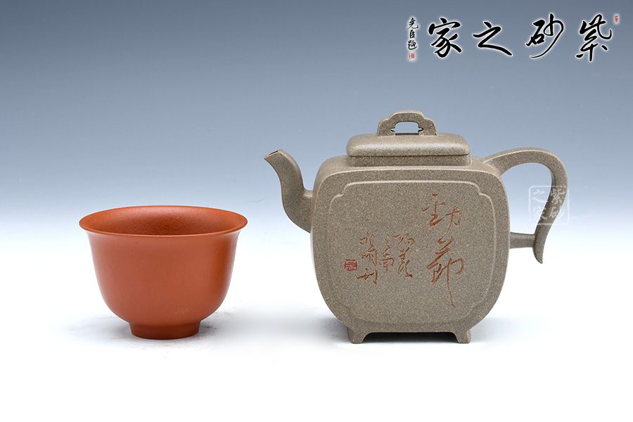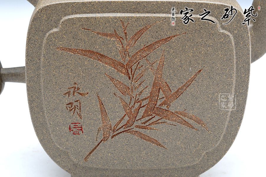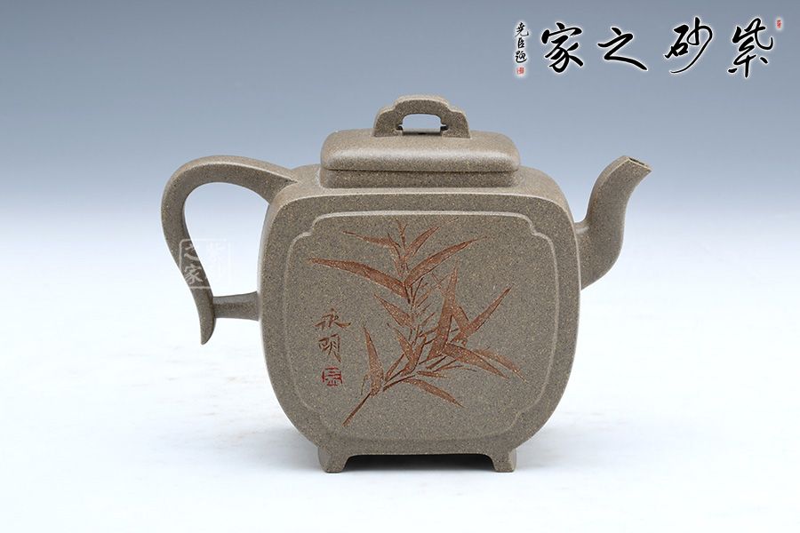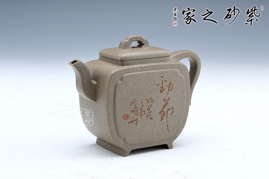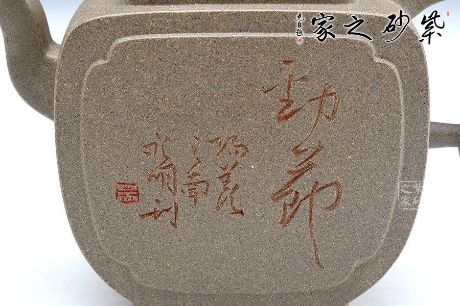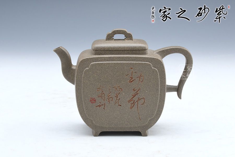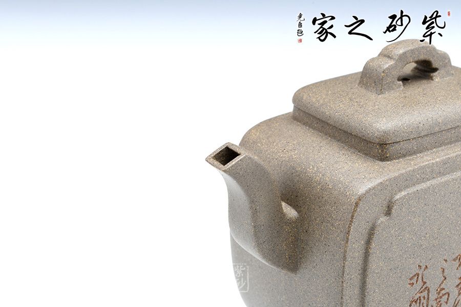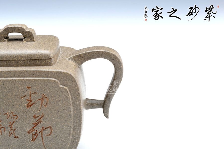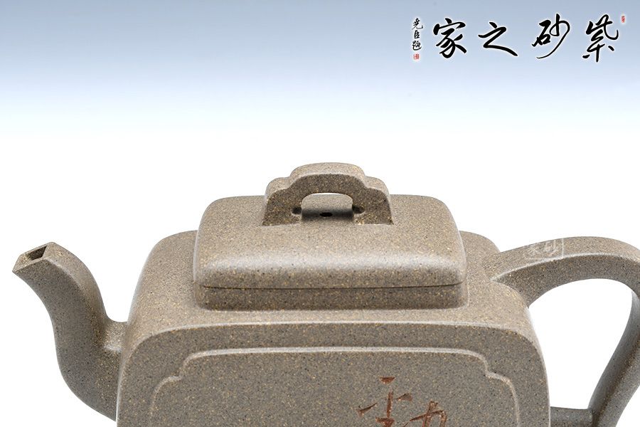 此壺為方中見圓,略上闊下斂狀,橋狀鈕,高口頸,蓋拱把聳,妙趣生動。。三彎流,彎曲朝天,壺身之上有貼面凹出,方圓中正,布局均衡規(guī)范。棱角分明,造型奇巧,外形優(yōu)美,線條曲直并蓄,主體感強。口蓋吻合嚴密。流、把形式和壺的高身相協(xié)調(diào),美觀大方。全器工巧逼真,氣勢龐大,值得收藏。
