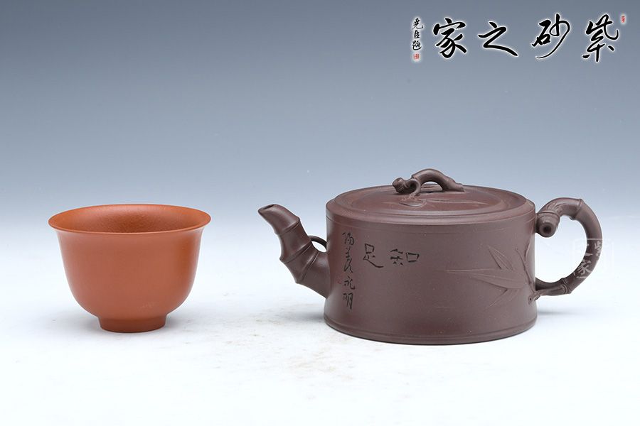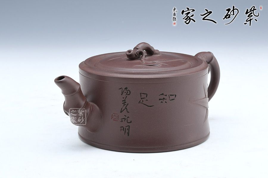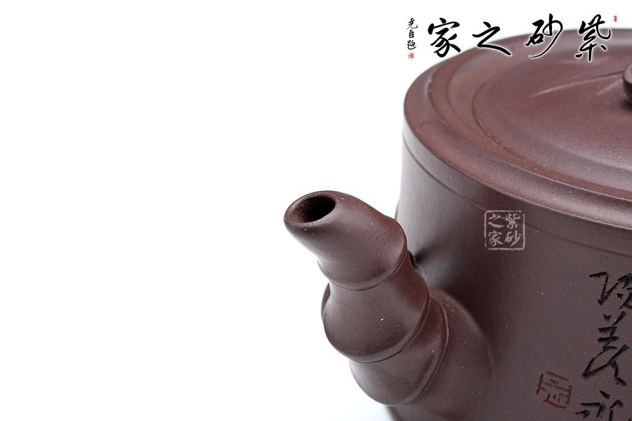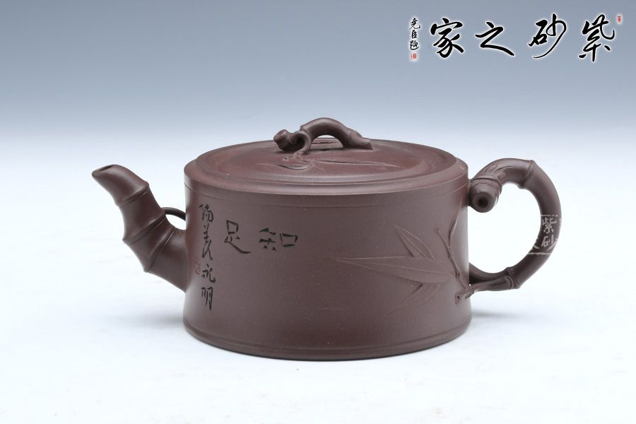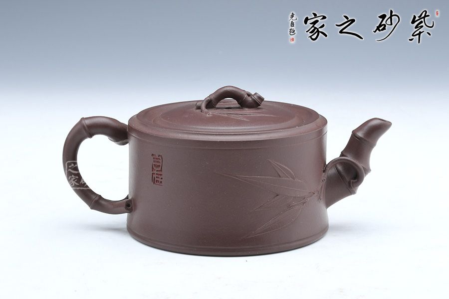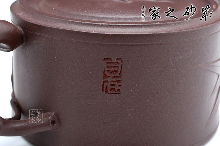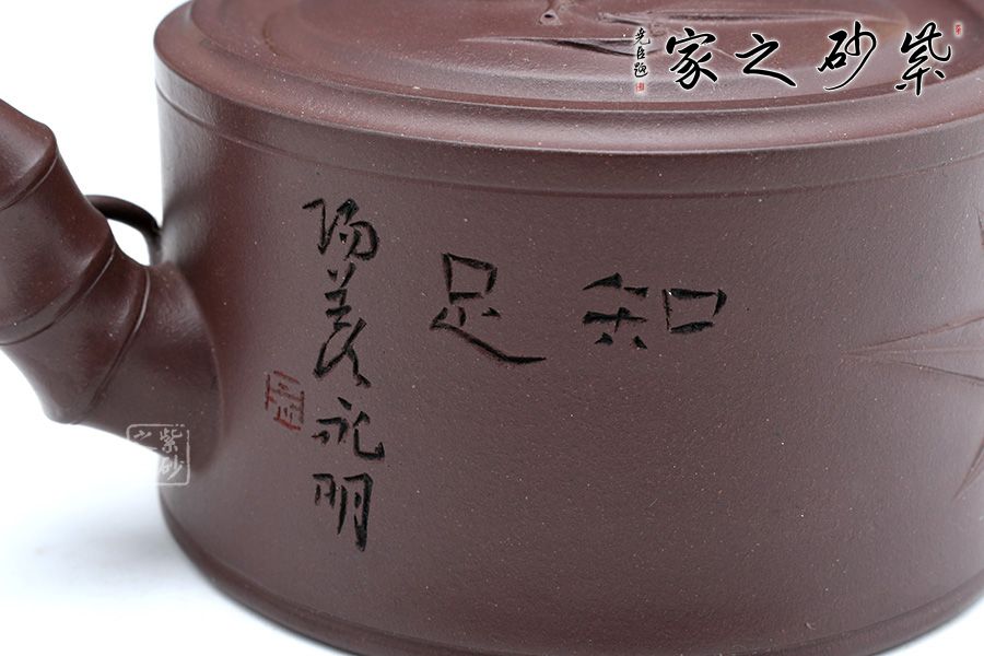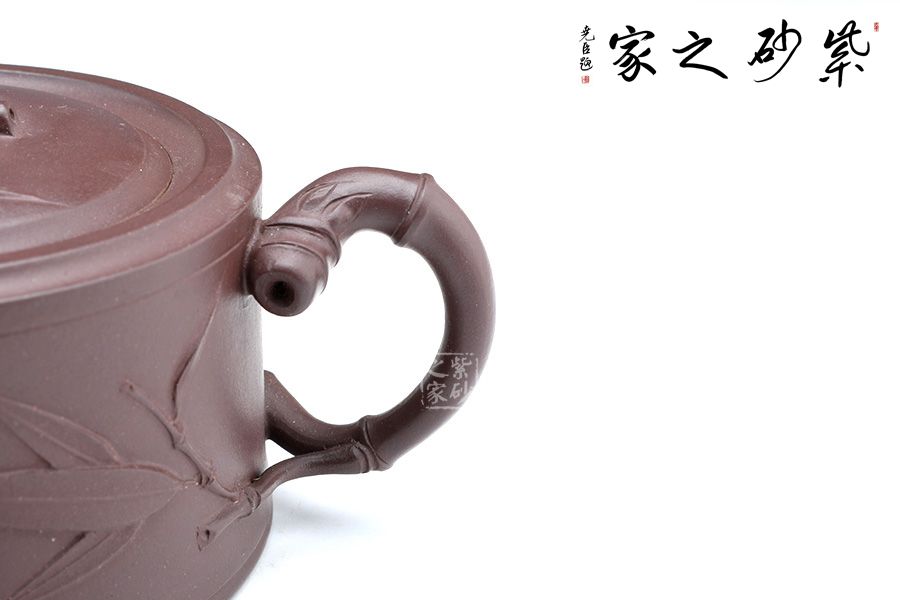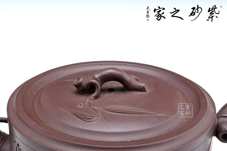 壺柄,壺流,壺鈕的竹節(jié)上帶有幾片竹葉,似乎在隨風(fēng)搖曳,竹枝挺立,制作復(fù)雜,嵌蓋,氣密性佳。加之“知竹常樂(lè)”呼應(yīng)主題,更增添文人氣,可藏可賞必入美器!