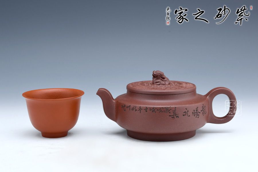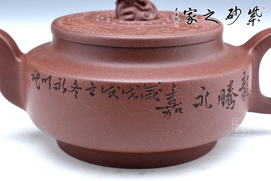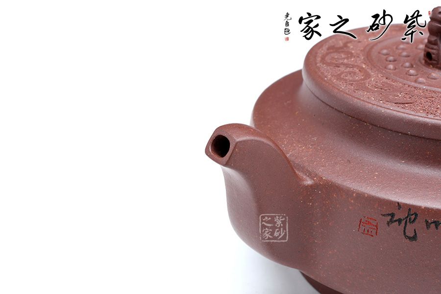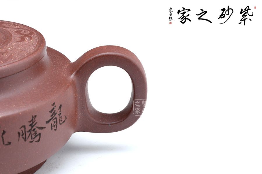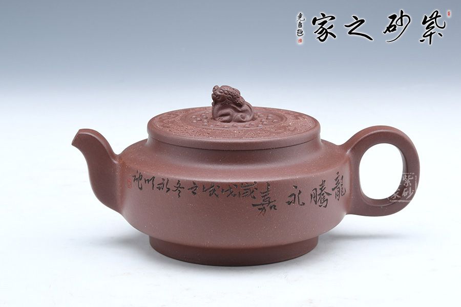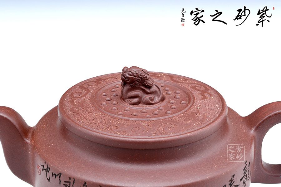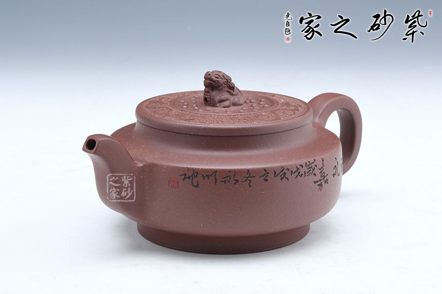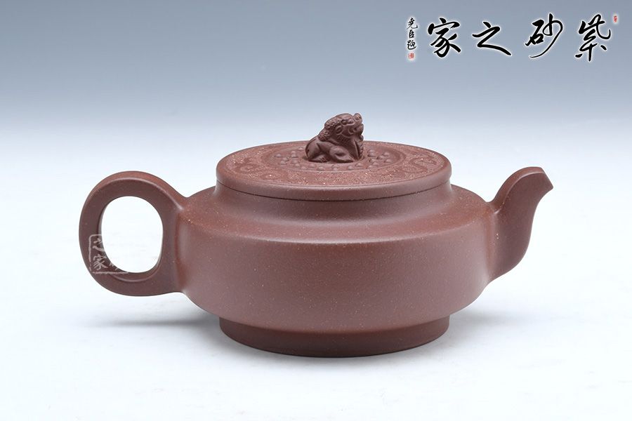 此壺端莊大氣,飽滿大度的壺體,給人以有容乃大的大家風范和氣度,堅挺的流有挺拔向上的氣勢,流暢的把又具圓滑中庸之取向,圓潤,飽滿,不媚不俗,高貴之氣盡于無言之中。簡約有章,厚重中略顯莊嚴樸實。方中見圓,圓中帶方,瑞獅摘鈕,寓意吉祥,圓扁玉潤精到,平邊新穎別致,骨力沉穩(wěn)的表達方圓,壺肩搭配陶刻,賞玩絕佳,值得收藏。