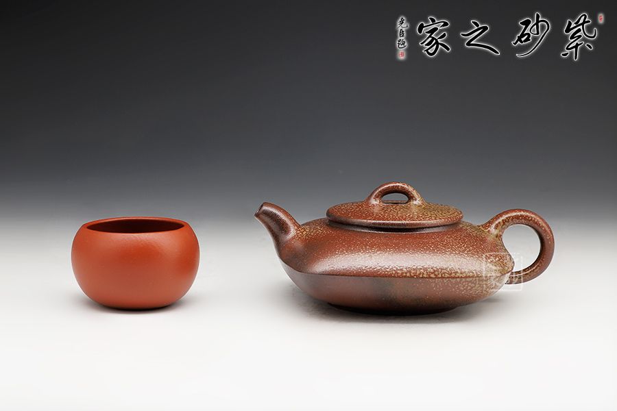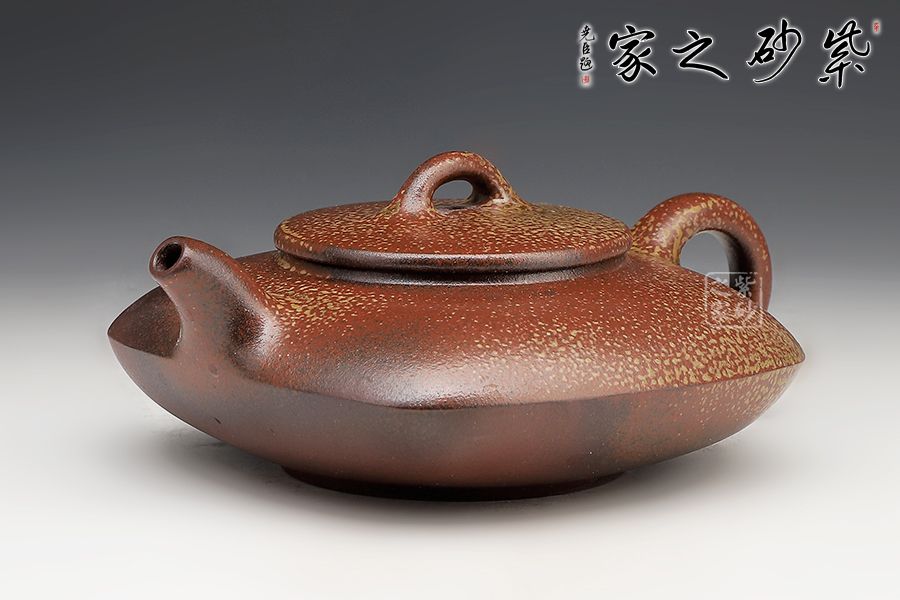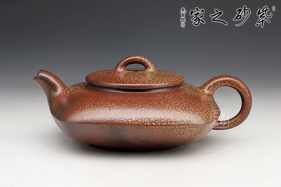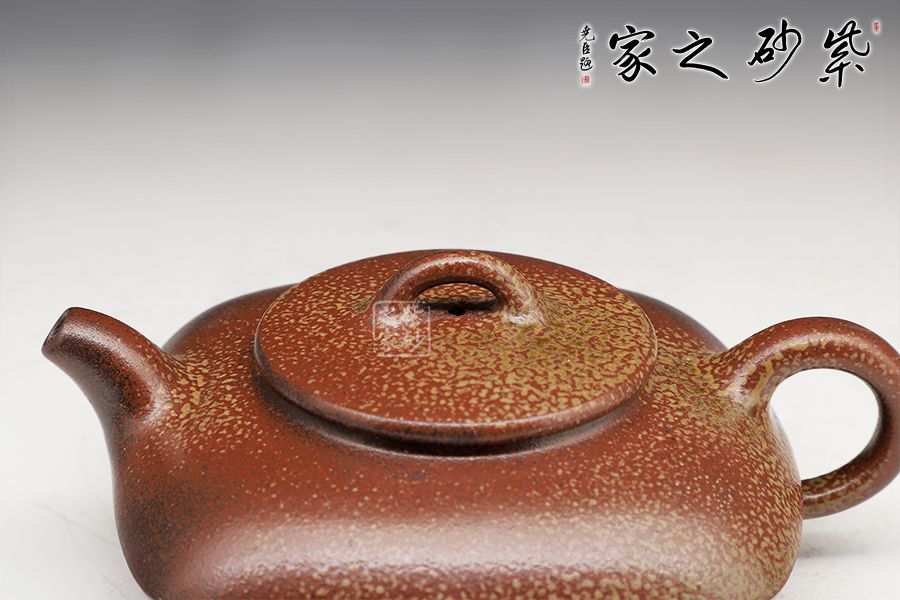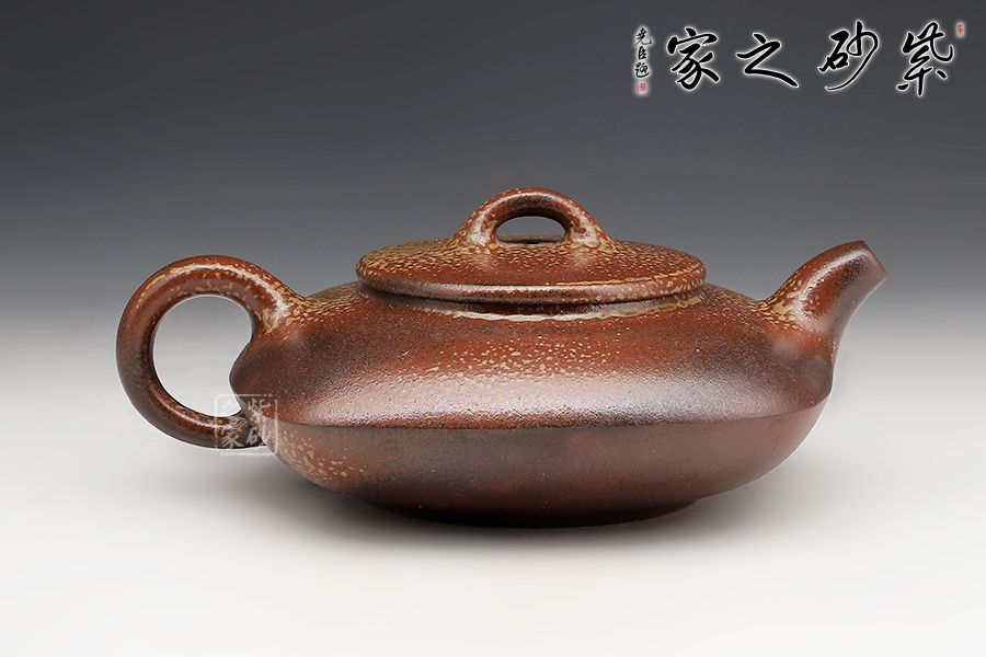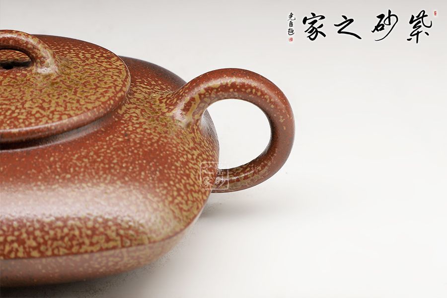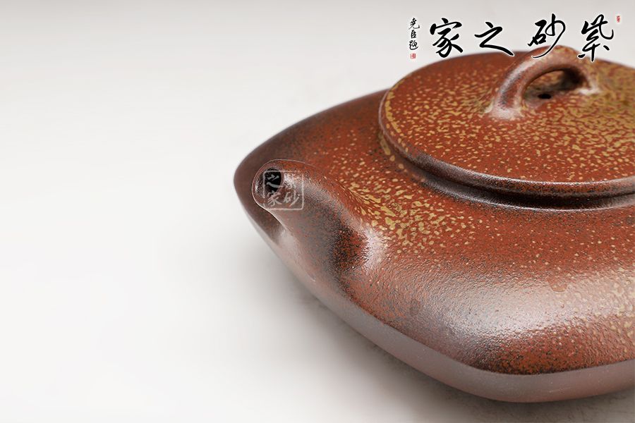 此壺為上下合式,壺身扁圓幼方,棱線分明,一彎短嘴,平蓋橋鈕好拿捏,壓蓋圈把,接口處融合平滑。古法燒工藝令壺身出現(xiàn)斑駁的梅花金幣紋,十分有特色。