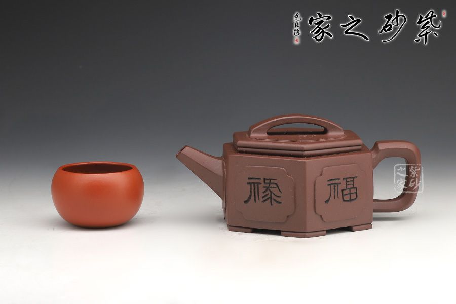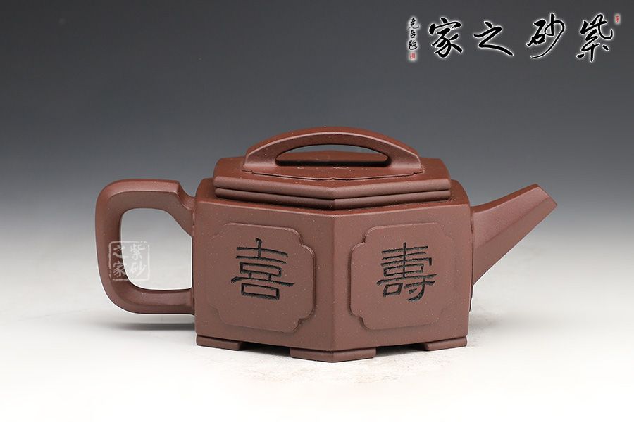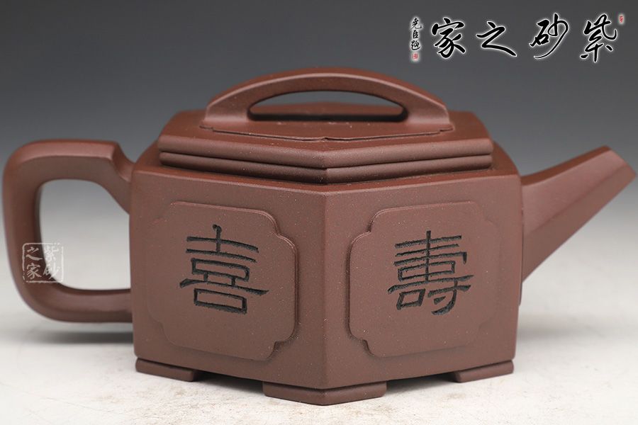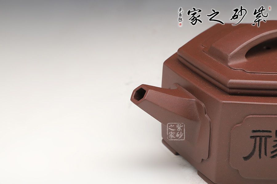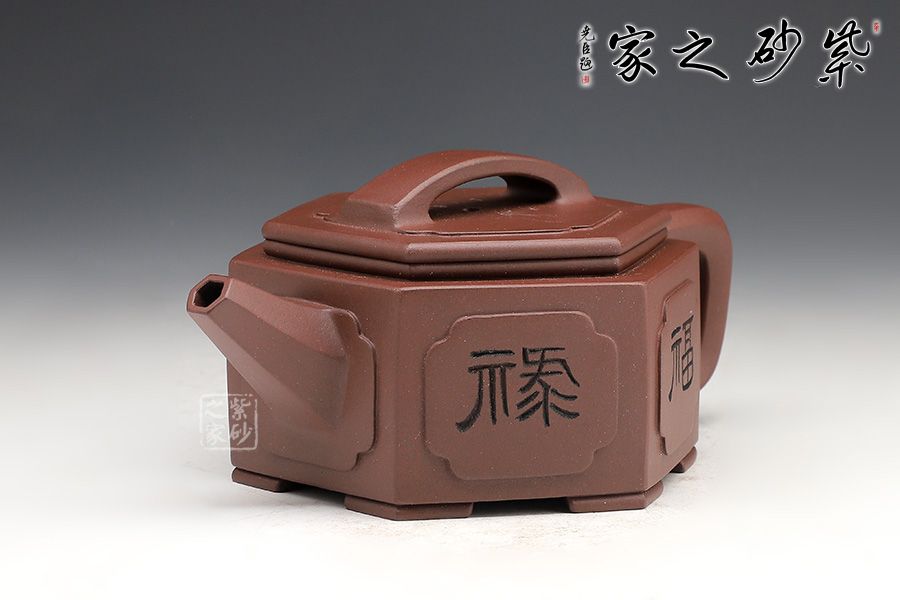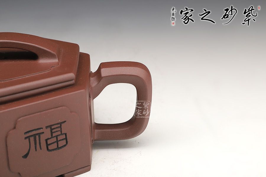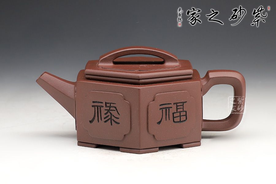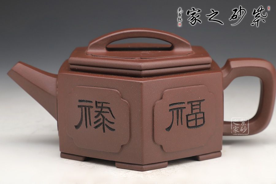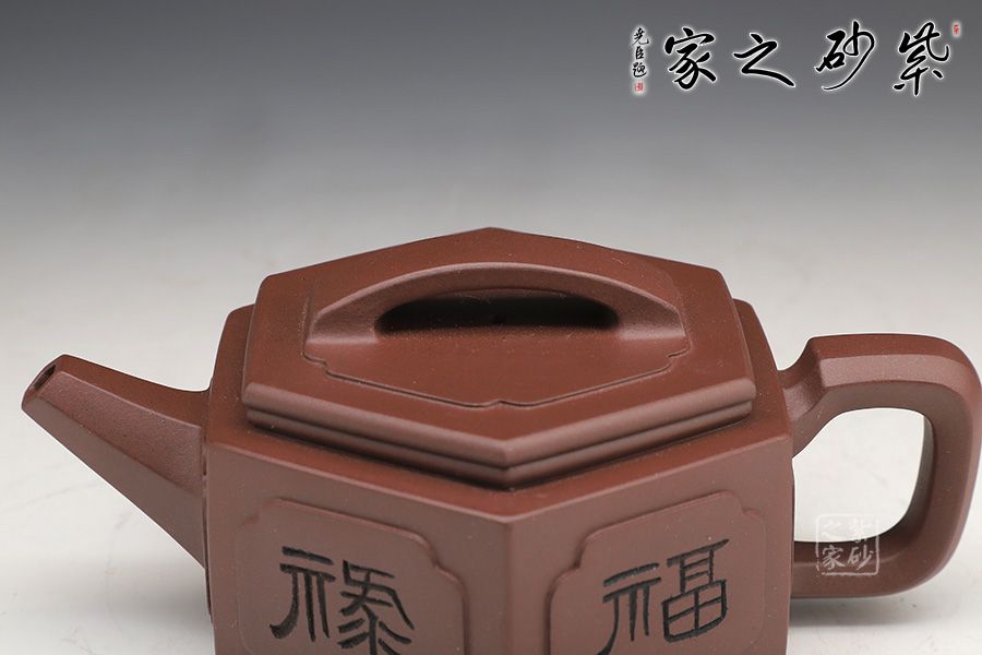 漢瓦六方為型,全手工制作,泥片銜接十分自然,毫無拼接痕跡。線條平穩(wěn)莊重,輪廓分明,棱角清晰,方器的挺括陽剛之氣盡顯。壺蓋之上漢瓦作鈕,彰顯古韻味;陽開窗,分別刻繪“福祿壽喜”四字。整器線條收放自如,于剛正中透出一股雅骨,壺身至壺蓋的層次感,又彰顯不俗功力。