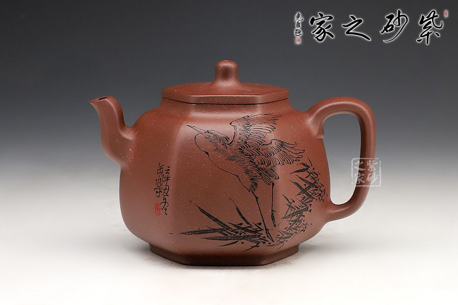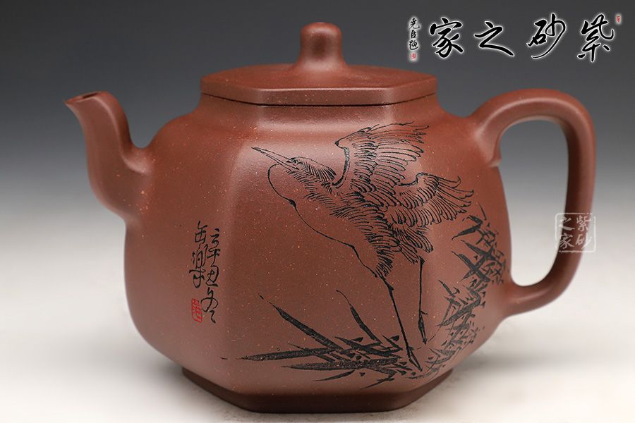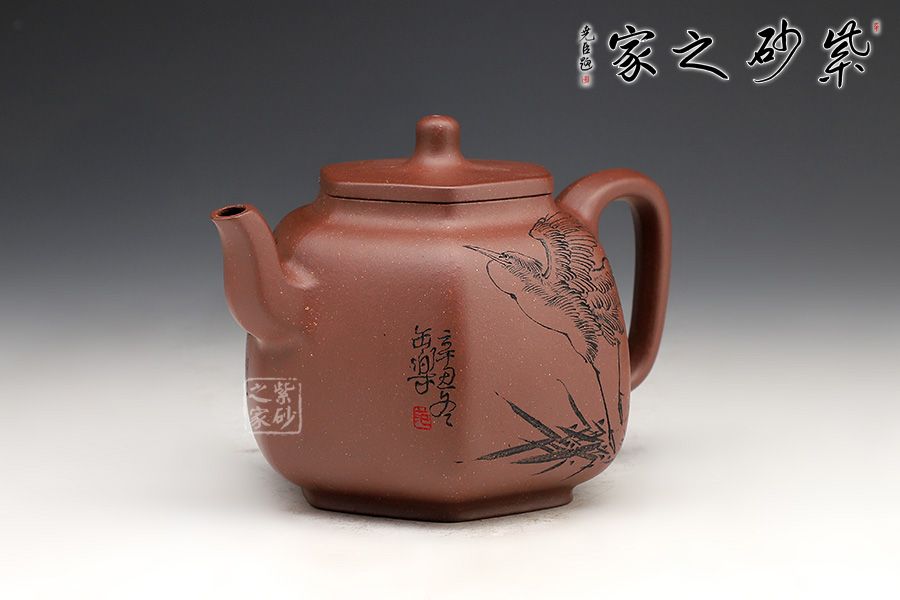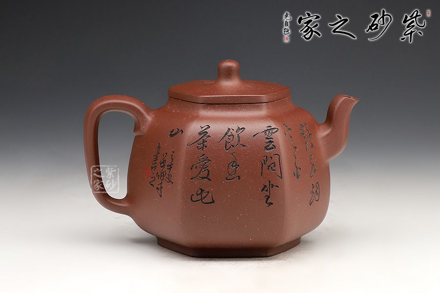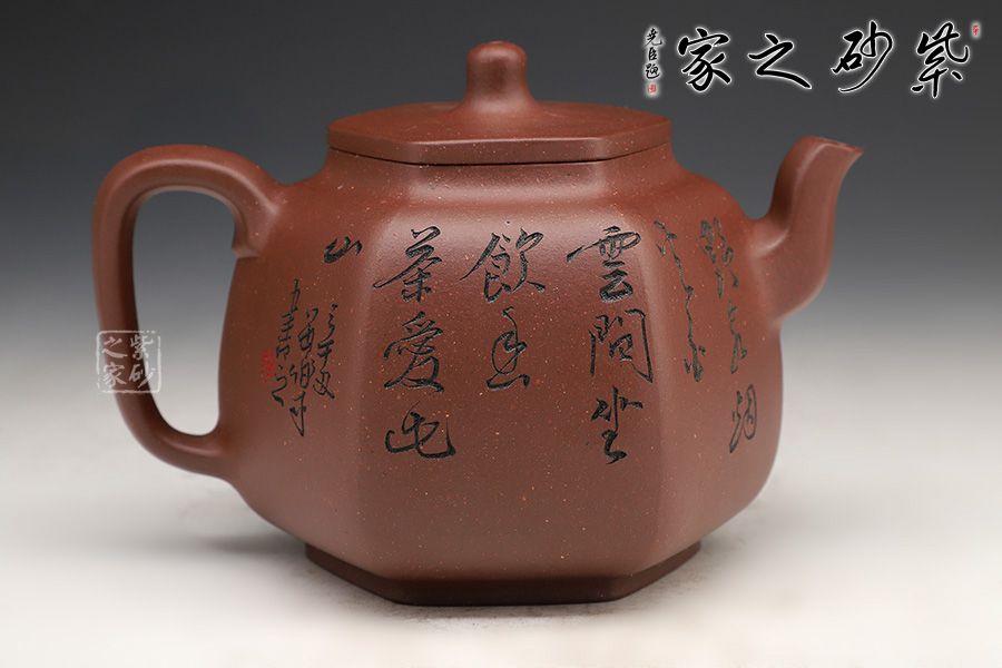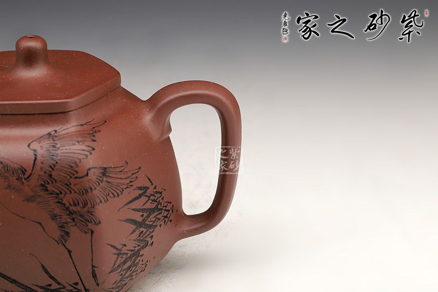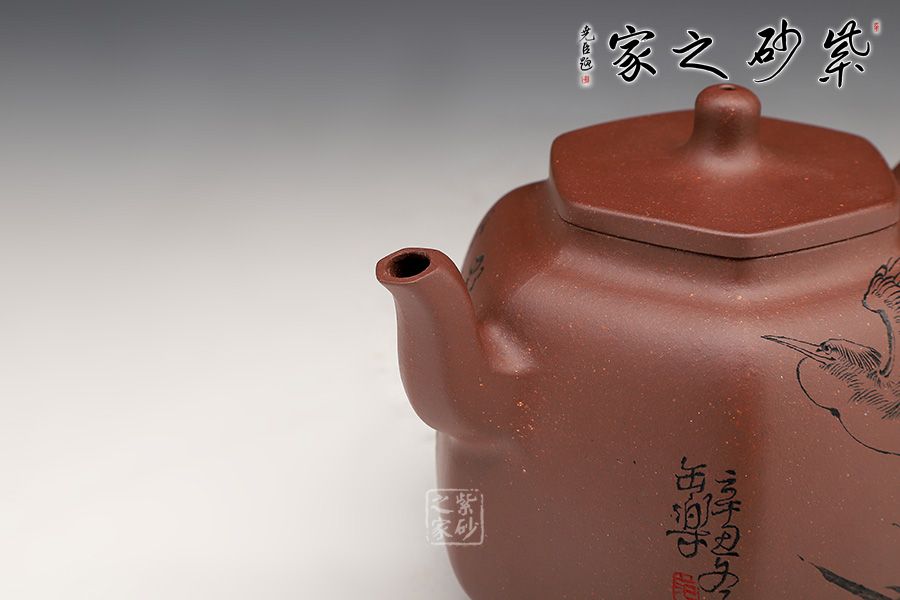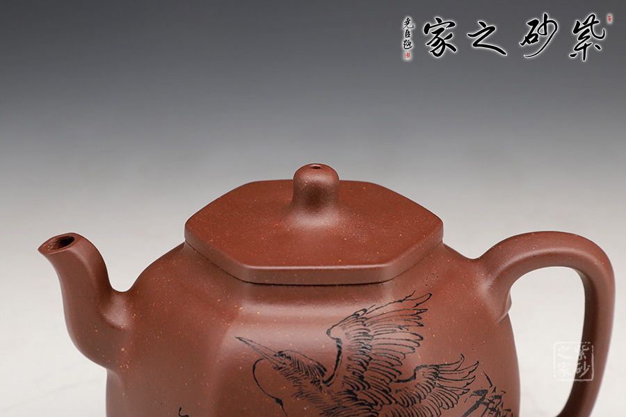 壺身各部均分為六面,鑲接成型工藝難度大,點線面清晰明確,線條自壺鈕氣孔處斜斜流瀉而下,各面略鼓出,肌理豐盈而力道渾厚。壺身柔美的線條,上下一氣貫通,構(gòu)思巧妙而制工細(xì)。壺嘴為六方彎流,出水爽利,暗接手法與壺身相連,壺把與壺身相對應(yīng)。