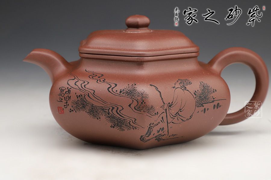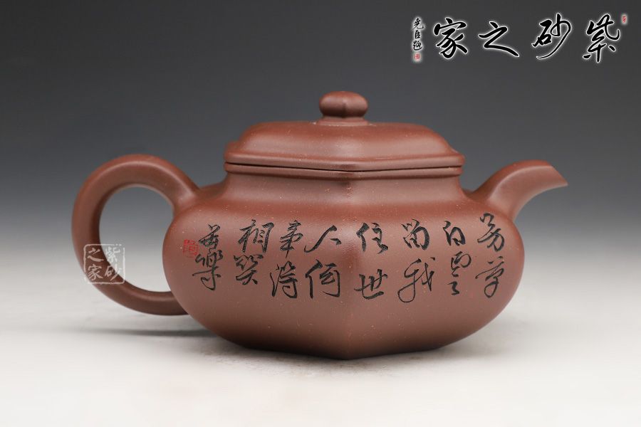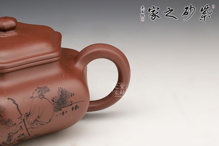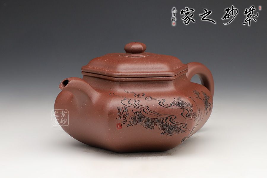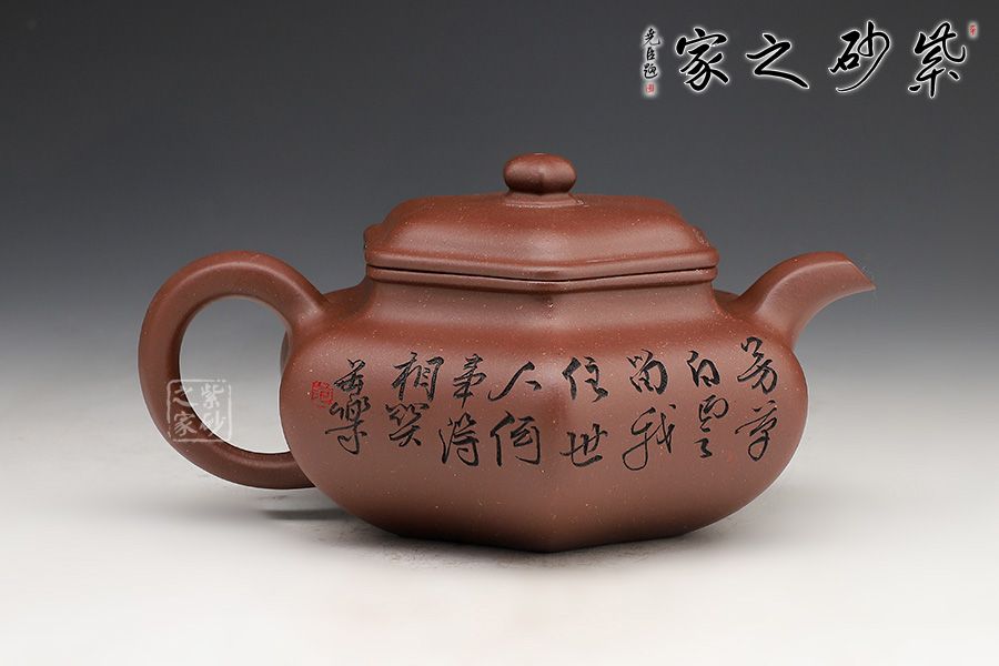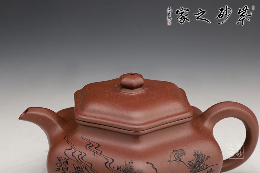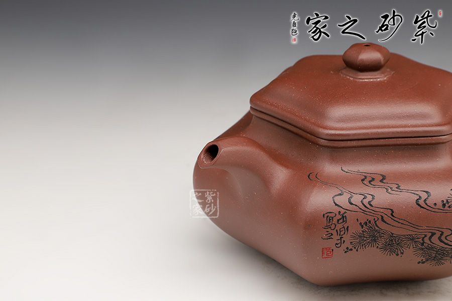 扁腹壺形為紫砂壺傳統(tǒng)樣式,此壺在中又加上六方造型,嘴微彎,壺身線(xiàn)條流暢,傳統(tǒng)韻味十足。壺身扁韻有致,下身的弧度與平肩形成鮮明對(duì)比,顯得典雅絕俗。此扁腹壺在流與壺體銜接處做得有如天成,小巧而不失勁道。
