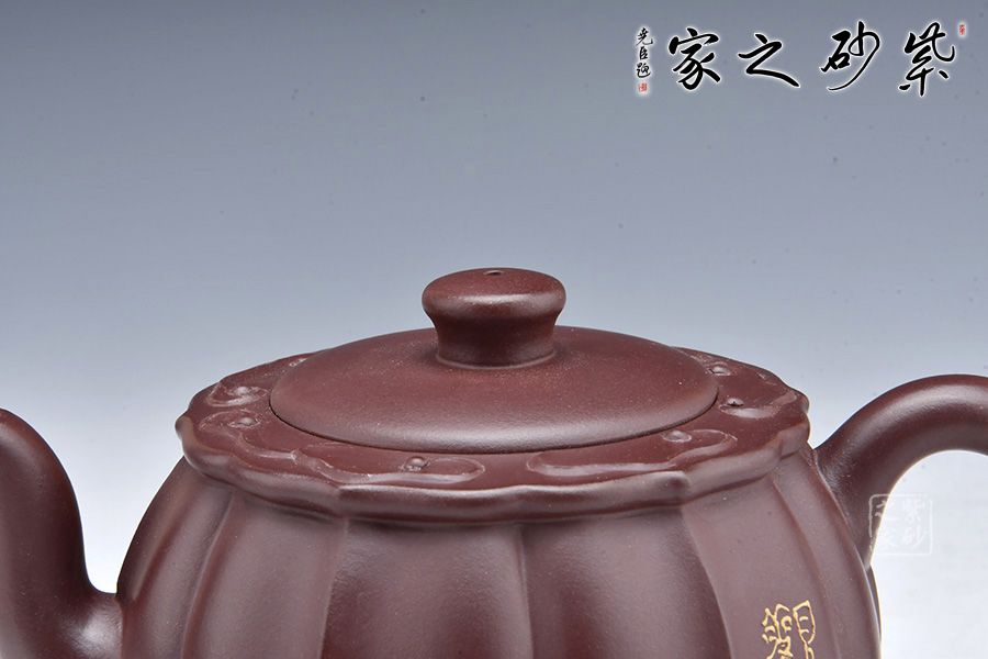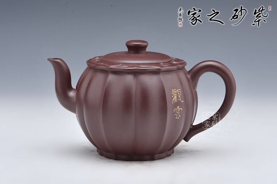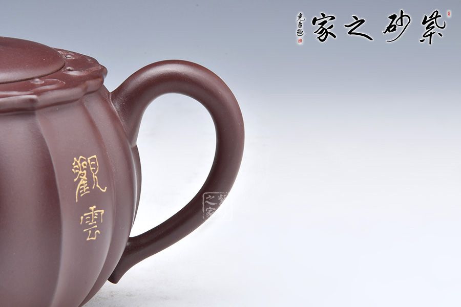 此壺在傳統(tǒng)的圓器上加以改良,做成了筋紋器,但仍舊可以看到壺身的飽滿圓潤。范國勤老師采用家藏的原礦紫泥制作,壺嘴壺把壺蓋壺鈕壺底跟壺身好像完全不搭,但是別有韻味,單獨(dú)的壺身做成筋紋器,設(shè)計(jì)巧妙。壺身刻繪“觀云”二字簡約自然,觀賞性十足。