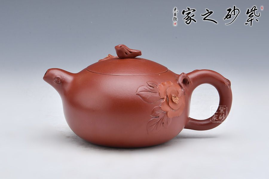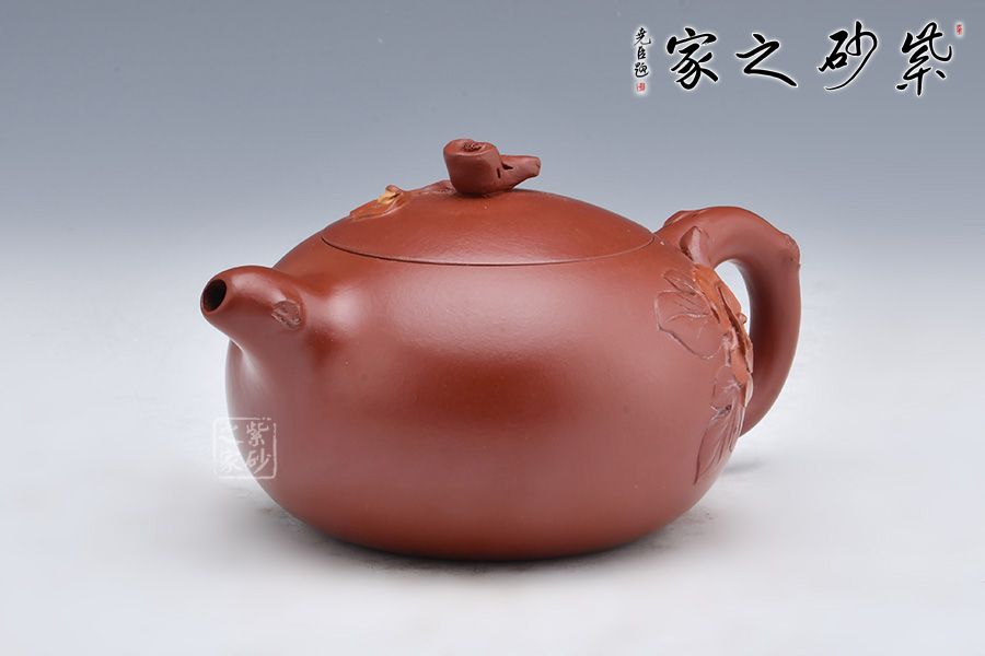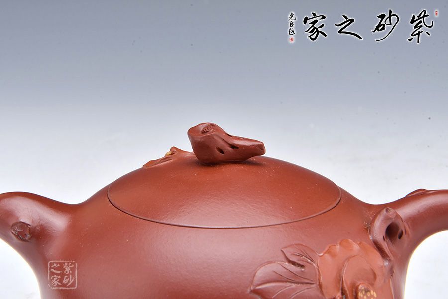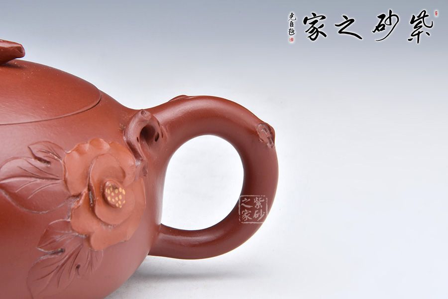 這款作品的整體造型比較簡單,壺身采用的是嵌蓋的工藝,壺身飽滿圓潤,壺把枝節(jié)蒼勁,孔洞古舊,一段側(cè)枝自壺嘴根部胥出貼于壺身之上,一朵牡丹豐碩無比,富貴大氣;頗得古代文人之精神韻味,中和圓潤的姿態(tài)和低調(diào)的氣質(zhì),符合審美特點(diǎn)。
