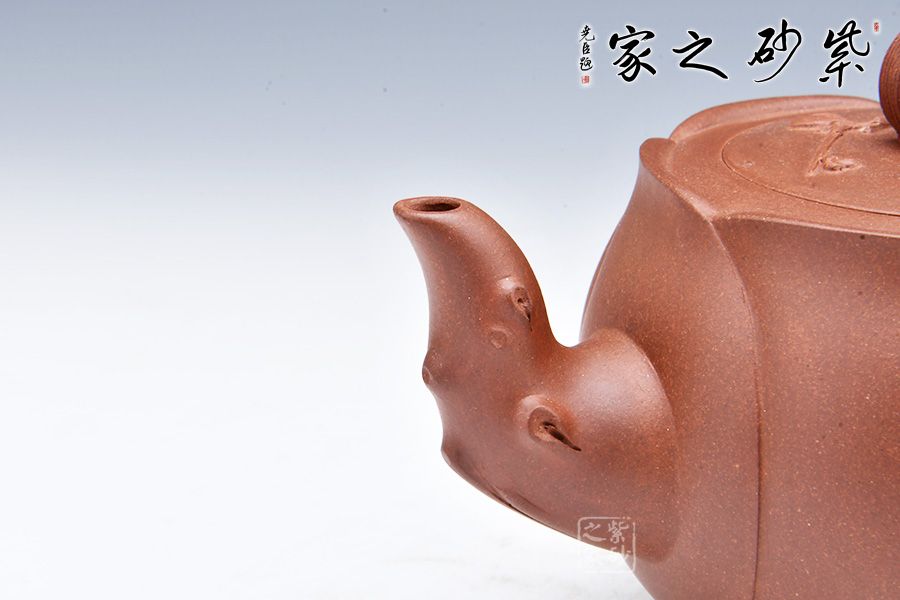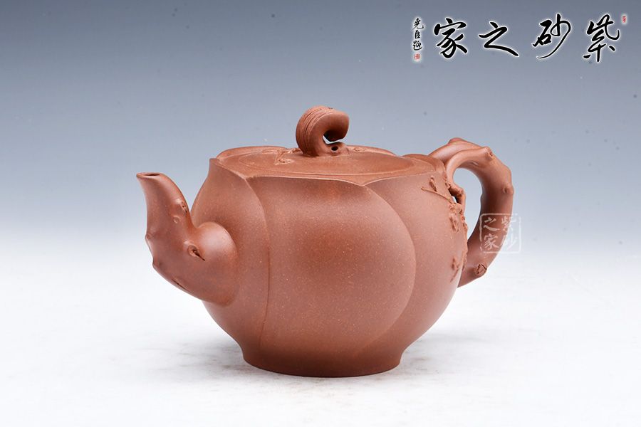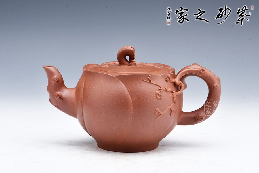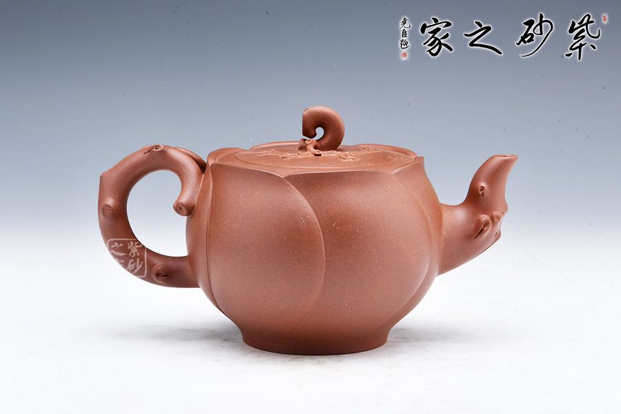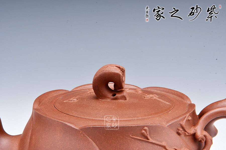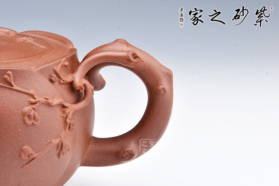 此壺以“梅”為主題,壺身造型如蒼古遒勁的梅枝,色澤紅潤,典雅大氣,透露出一種醇和爾雅,濃厚的文人氣息,整個壺身筋紋飽滿均勻,如同一朵即將盛開的花朵,蒼秀清雅,給人以翩然的動態(tài)感,蘊(yùn)含了古典秀雅。