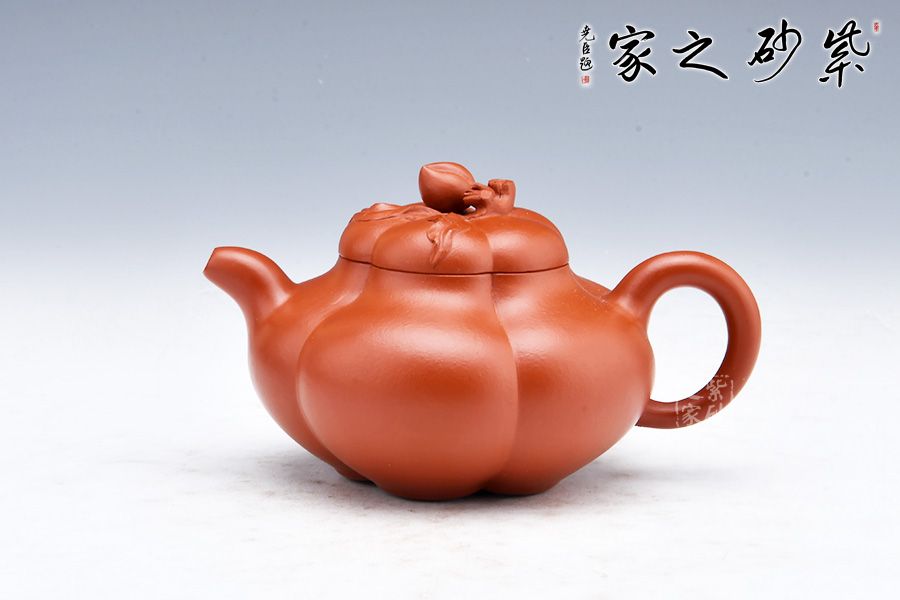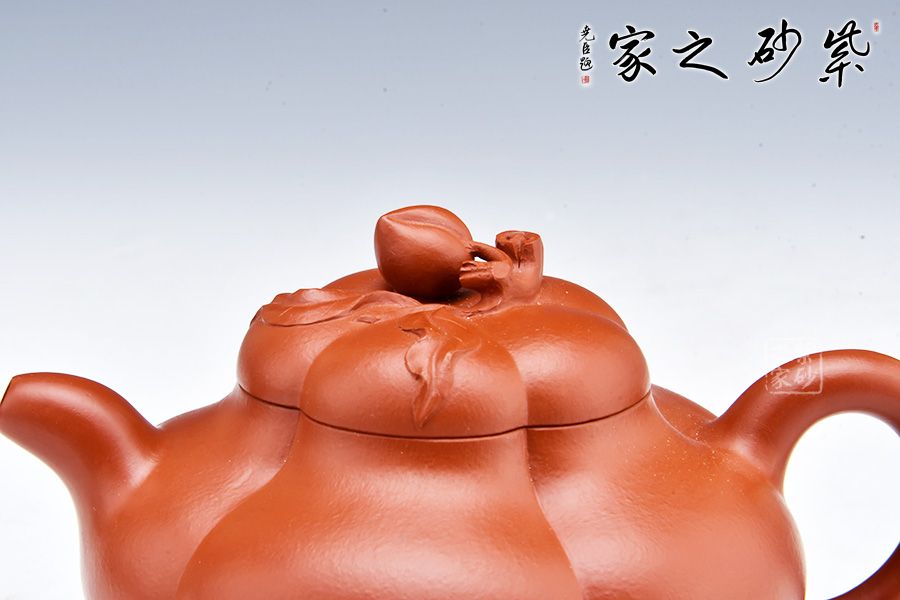 此壺為筋紋式,壺體較飽滿,壺身分為五瓣筋囊,等分均勻。線條頗具張力,囊塊飽滿,壺蓋與身密合,壺流一彎,出水流暢;壺把從囊凹處舒展而出,強(qiáng)化形體的平衡感;蓋鈕以捏塑手法摶成小桃及小枝桃葉,形體逼真。泥色素雅,簡(jiǎn)潔生動(dòng),表現(xiàn)出紫砂花貨藝術(shù)的細(xì)膩精致。桃子歷有長(zhǎng)壽之意,吉祥之寓自然不言而喻。