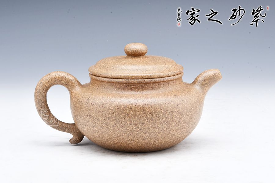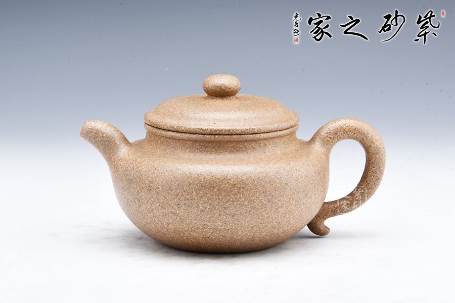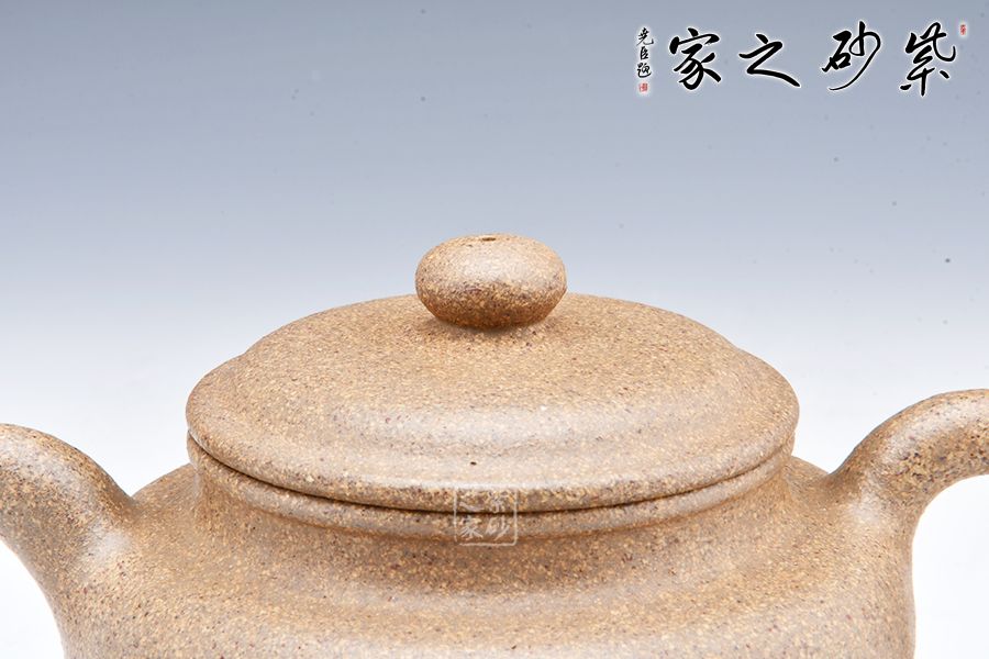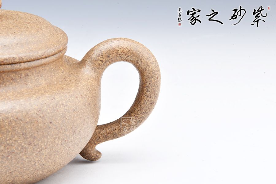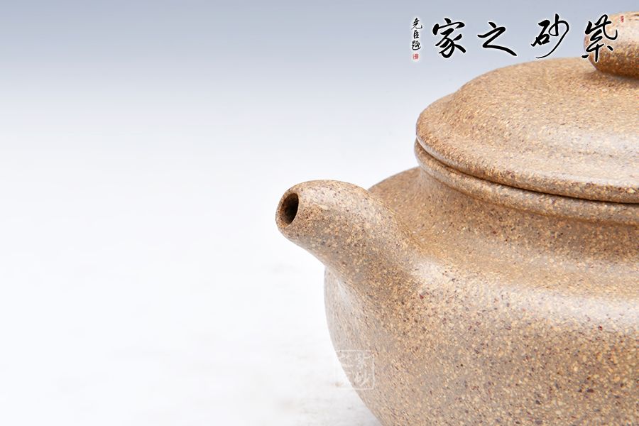 這款紫砂壺是經(jīng)典的傳統(tǒng)壺型,壺身各部分比例協(xié)調(diào),點(diǎn)、線、面的過(guò)渡轉(zhuǎn)折清晰流暢。壺嘴的高度與壺口,壺柄相比略高,在倒水時(shí),水流傾瀉而下,呈水柱形,不會(huì)發(fā)散。蓋扁圓鈕,工整而不失其穩(wěn)重姿態(tài)。