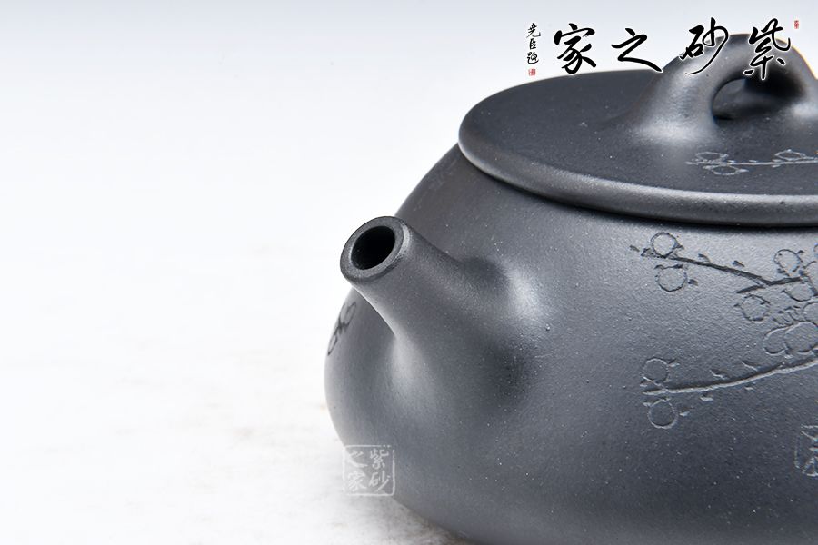 這款石瓢壺黑泥的沉穩(wěn)與刻繪的金石味相應(yīng)和,顯得整款壺氣韻高雅,與眾不同。橋形壺鈕略為平整,整款壺更加穩(wěn)重。乳足敦厚,壺身圓融。直流嘴挺峭而出,與壺把的三角形相應(yīng)和,整款壺和諧規(guī)整又有作者自己的風(fēng)格,值得賞用。