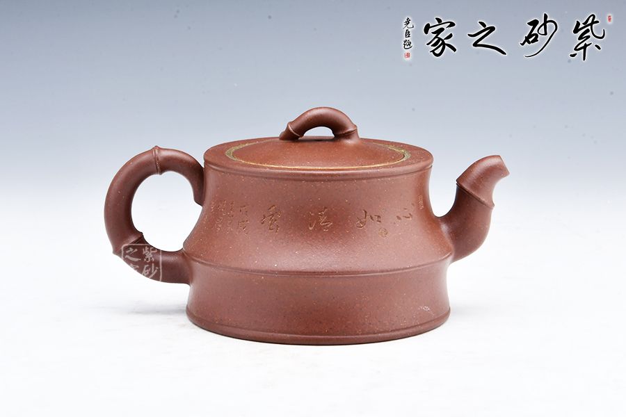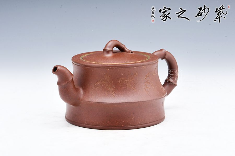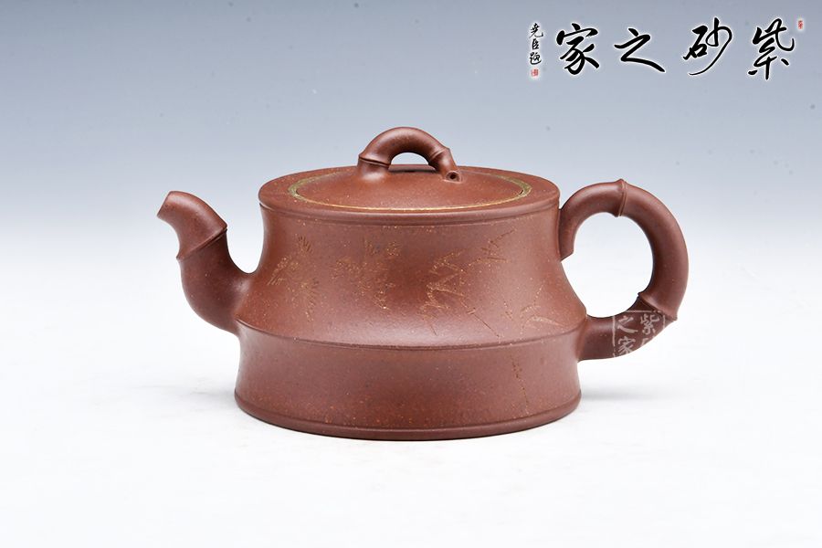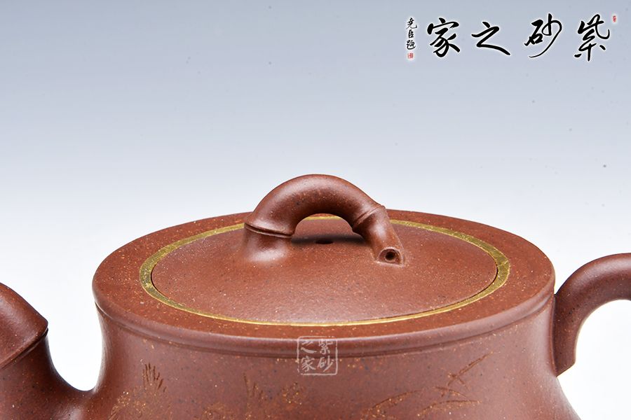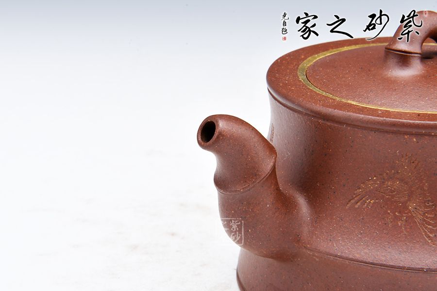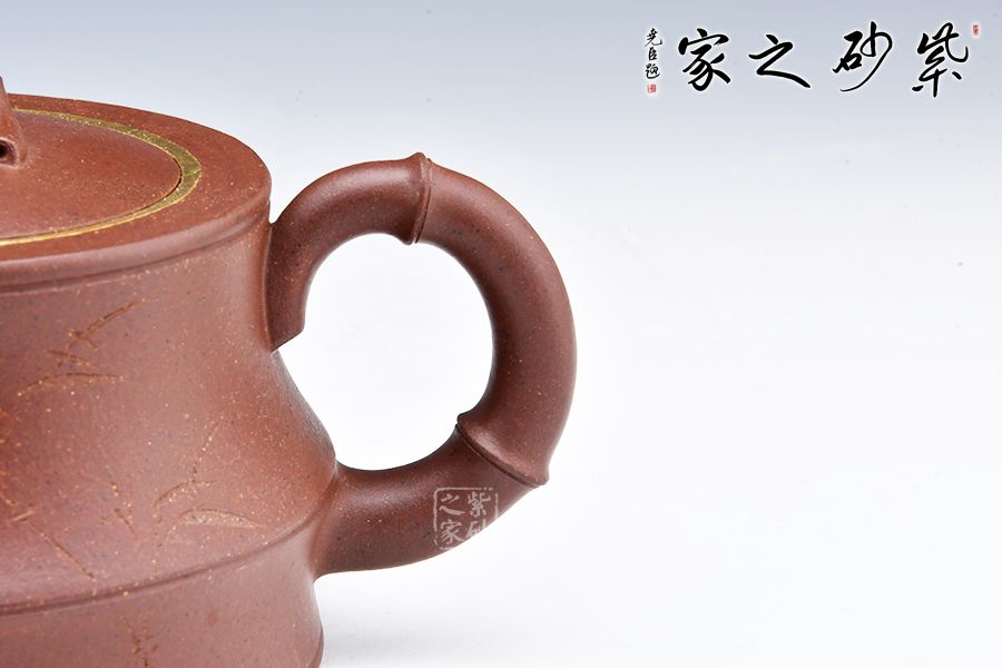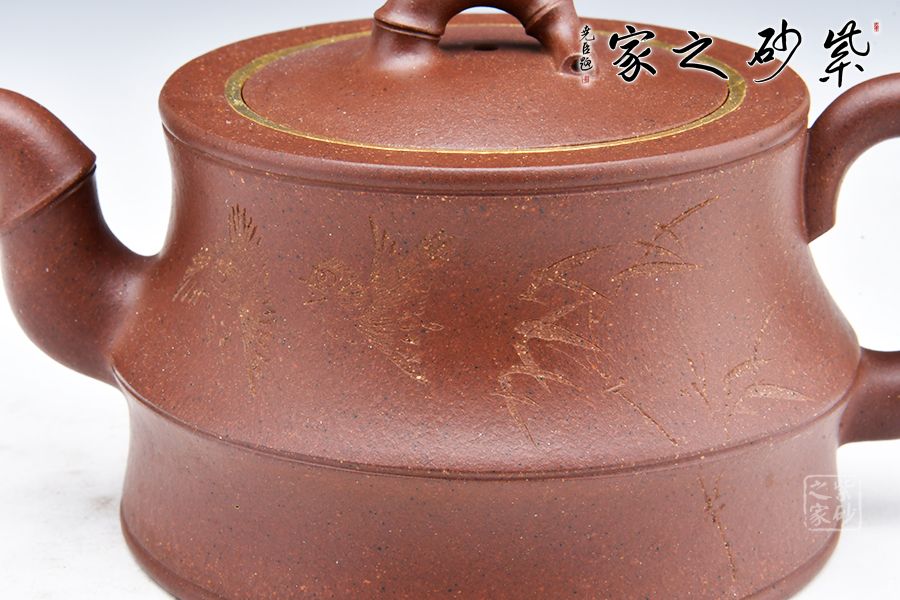該器線(xiàn)條流暢,整體皆以竹入壺,力量感十足,壺身刻繪竹子,更添文人氣息,壺口金圈裝飾,