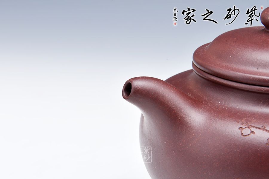 掇只傳統(tǒng)款式,敦樸大度。此壺骨肉亭勻,簡(jiǎn)練大方,制作頗見(jiàn)功力,彎流嘴胥出,柔美之姿盡顯,壺柄略微上抬之后優(yōu)雅滑落而下,形成一條圓潤(rùn)飽滿的弧線,樸雅大方。
