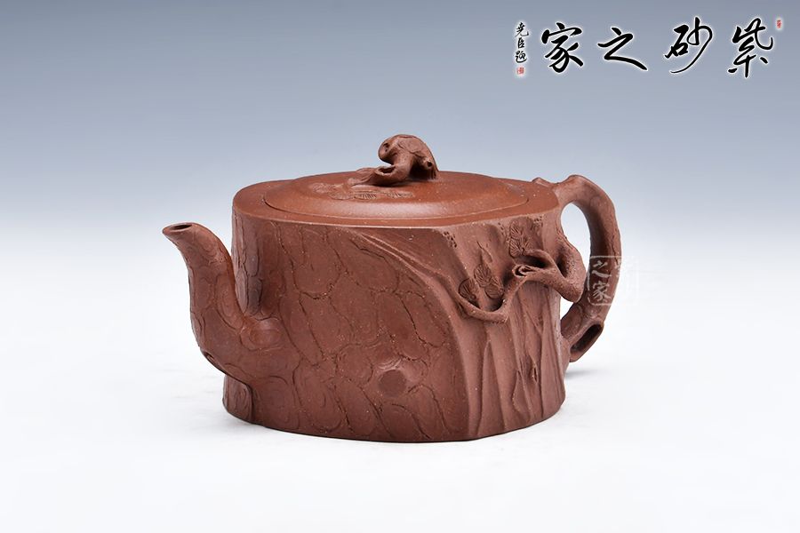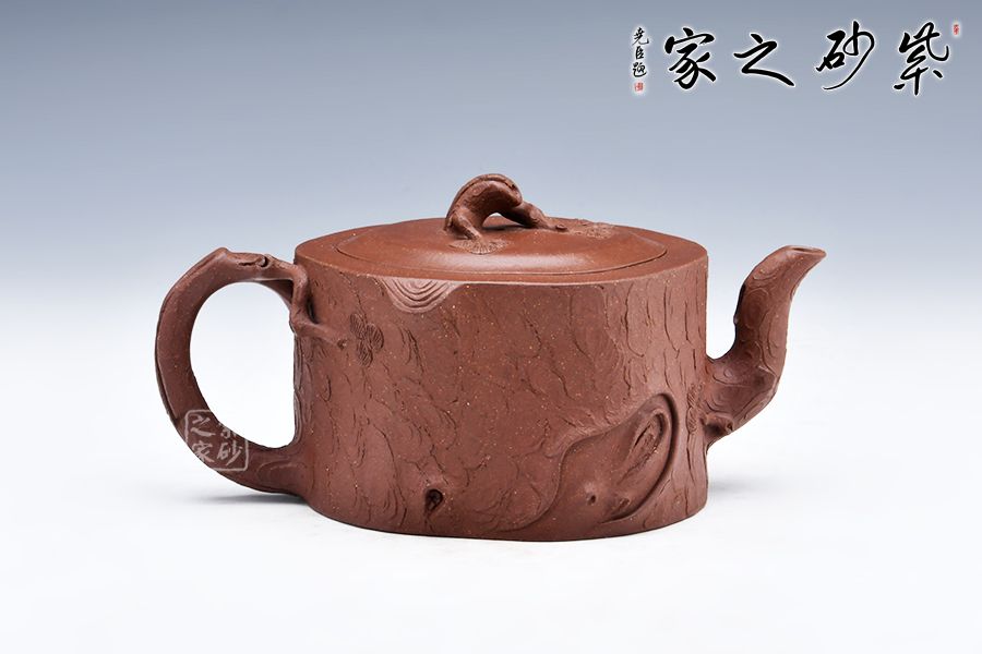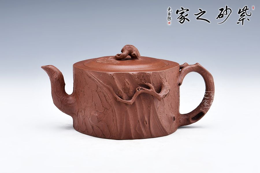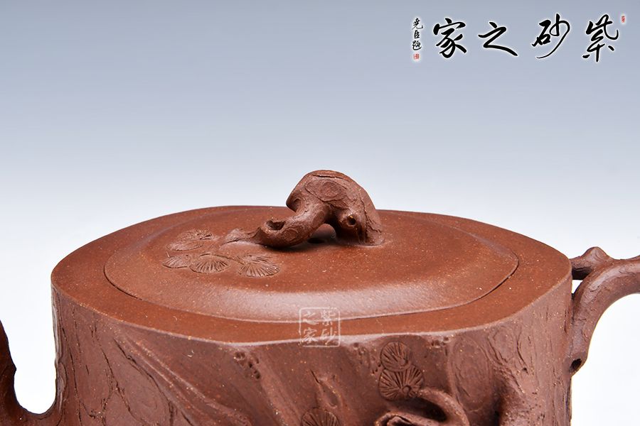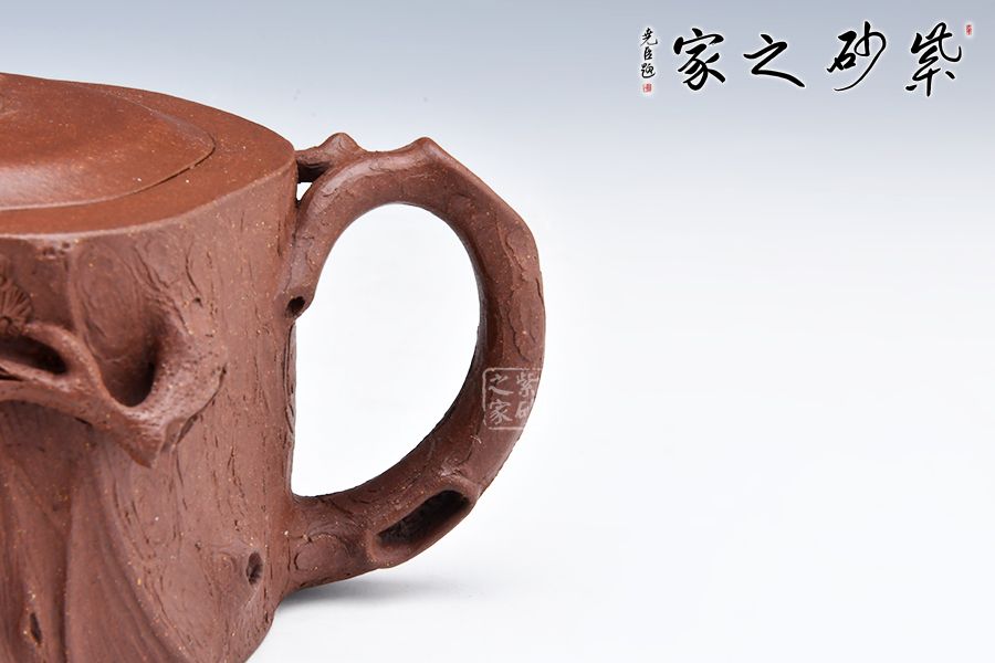 這是一件仿生作品,其造型古樸,壺身,流,把,蓋皆做松樹(shù)枝節(jié),平口略鼓,平底穩(wěn)重。整件松段壺泥塑工藝精美,層層迭迭,將古松蒼老之外皮塑造的分外相似。壺鈕更是巧取松節(jié)一段,匍匐貼合于蓋上,極其逼真,生動(dòng)而形象。整件作品用工精致,值得收藏!