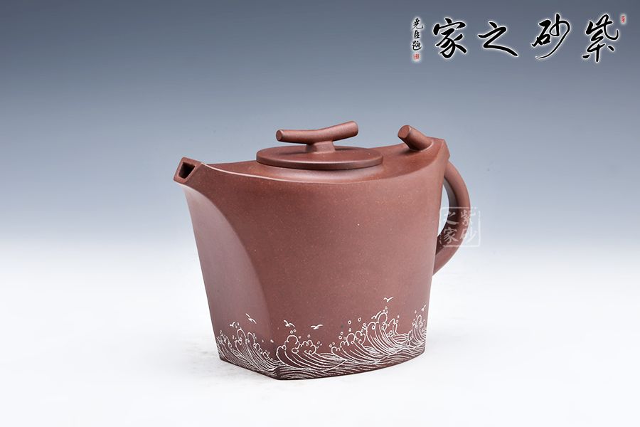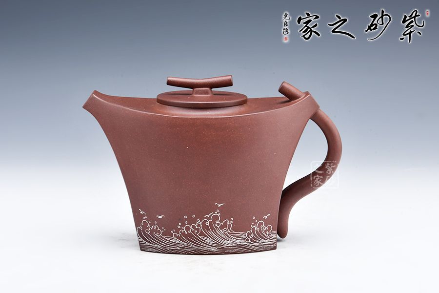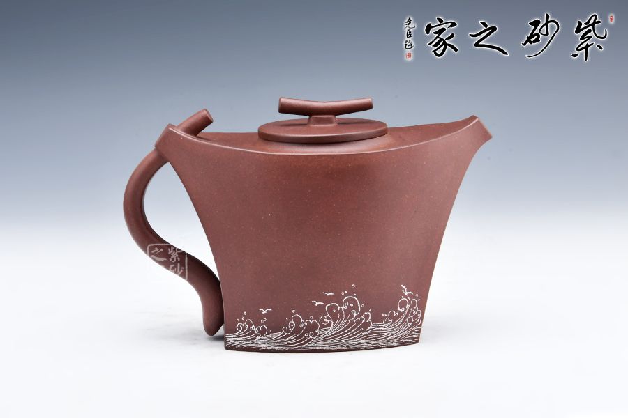 乘風(fēng)破浪會(huì)有時(shí),直掛云帆濟(jì)滄海。此壺選用原礦底槽青精致而成,造型飽滿,方中孕圓;上豐下斂,壺嘴暗接,壓蓋咬合緊密,整體以船為形,壺把為船槳,氣力內(nèi)蘊(yùn),極富張力。壺身繪制風(fēng)浪海鷗,兩杯與壺相得益彰,套壺難得。寓意積極向上,藝術(shù)感極強(qiáng),值得賞藏。