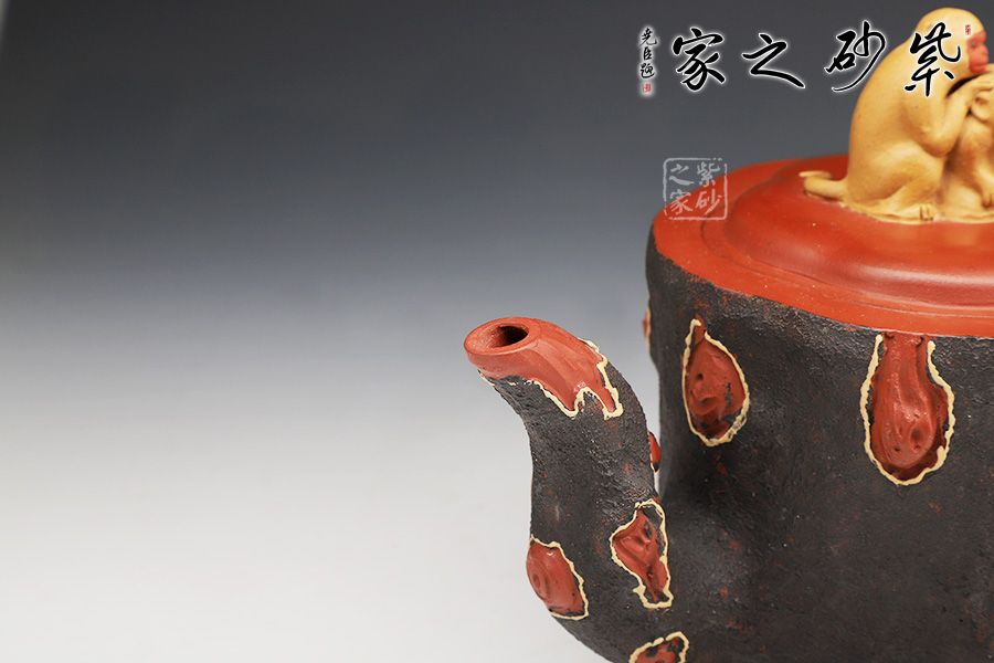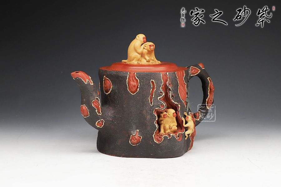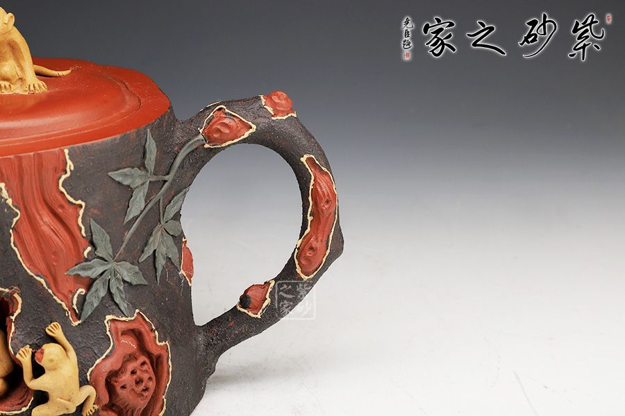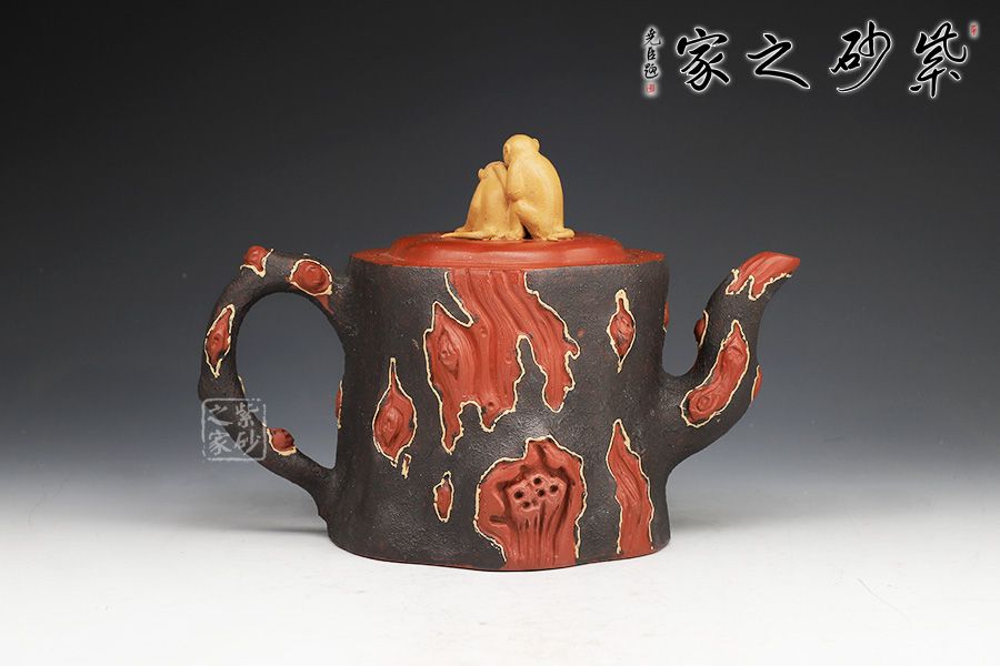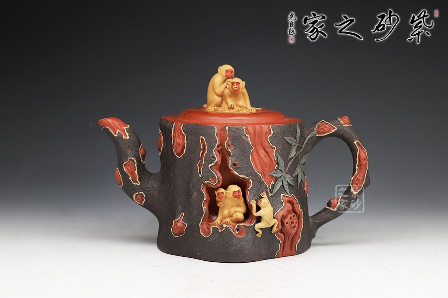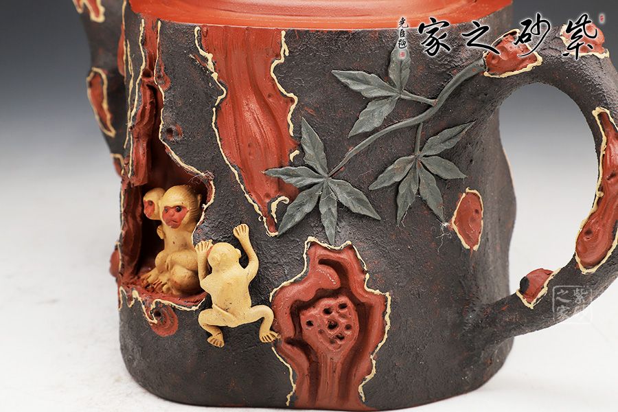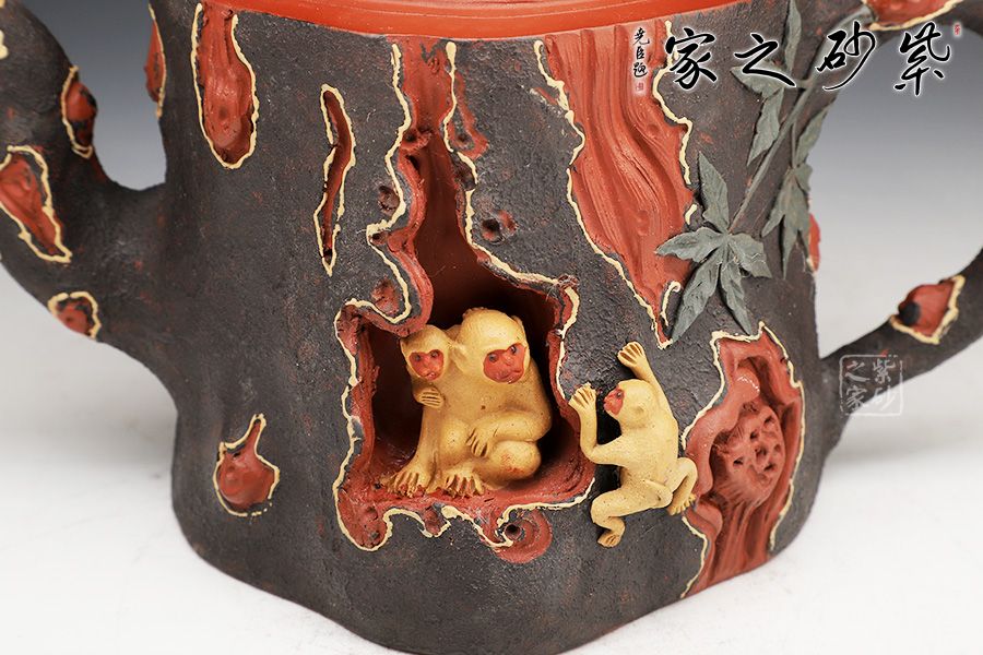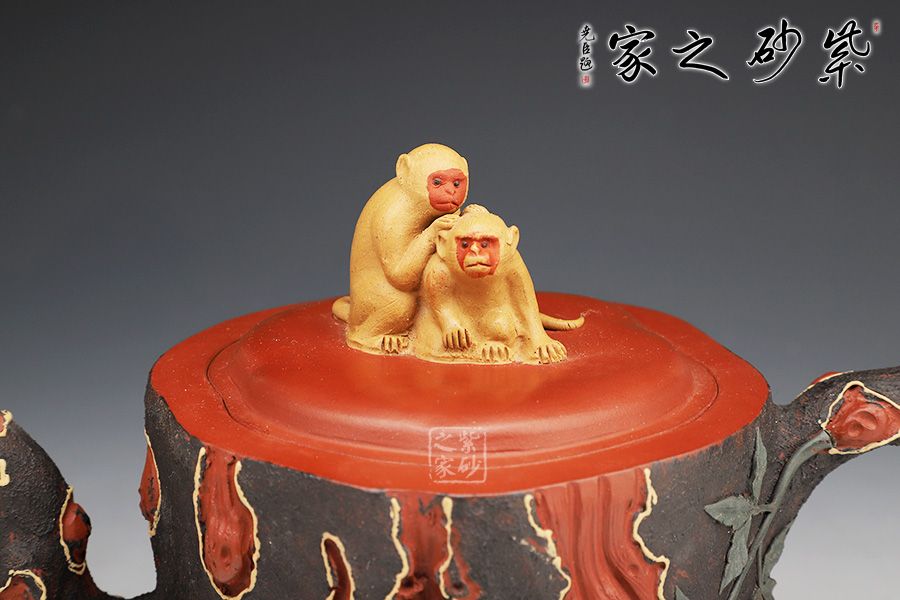 壺身呈樹樁形,嵌蓋上猴形壺鈕與壺身渾若一體,壺面雕琢猴子猴孫,寓意著兒孫滿堂,幸福美滿。