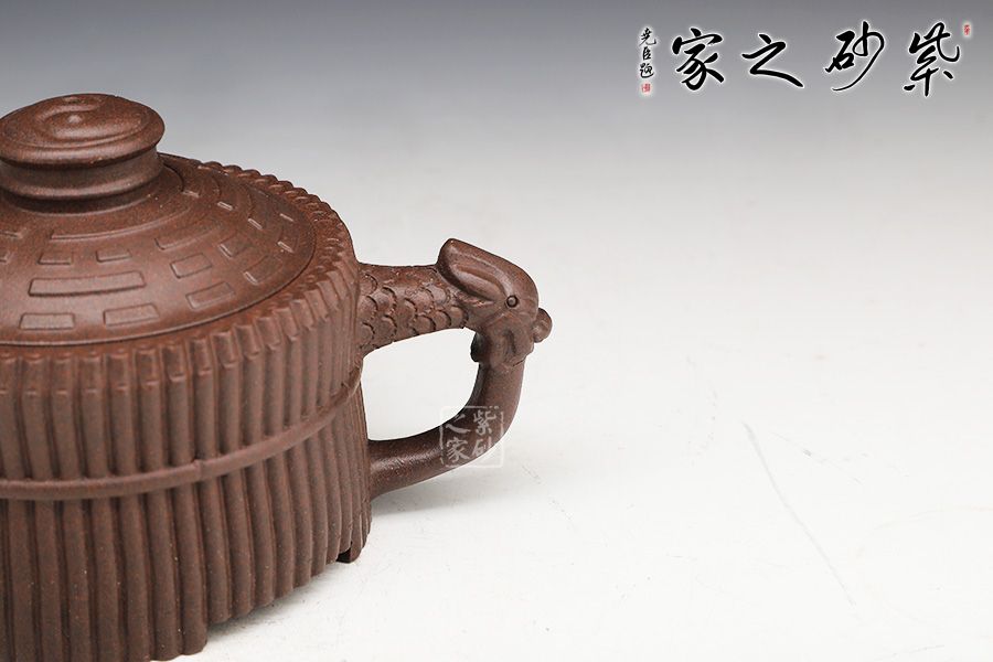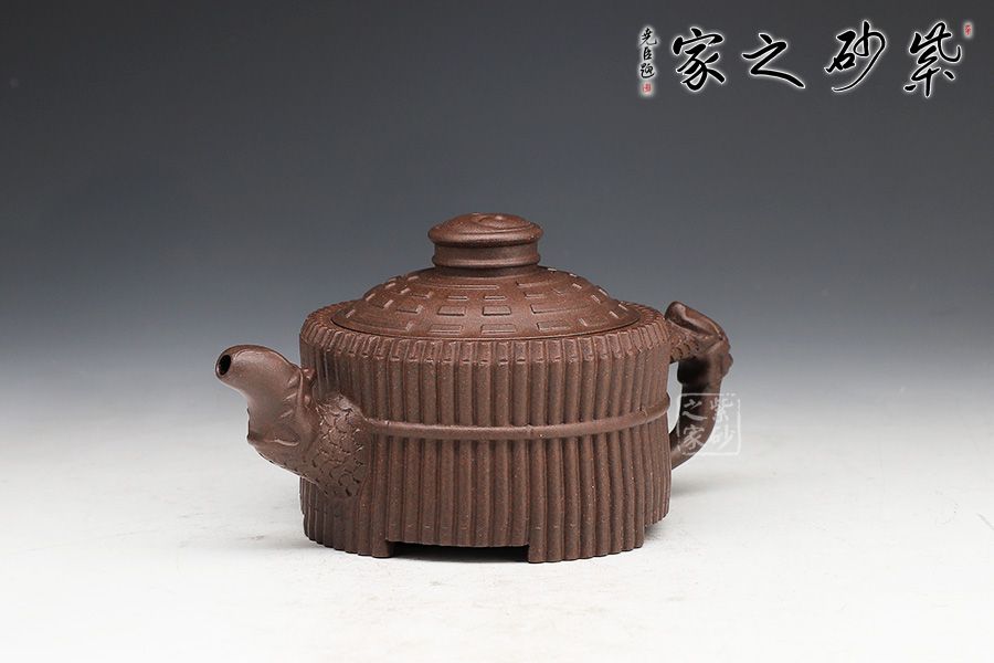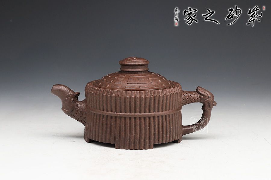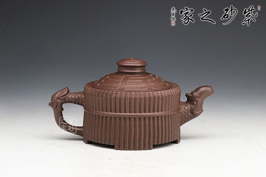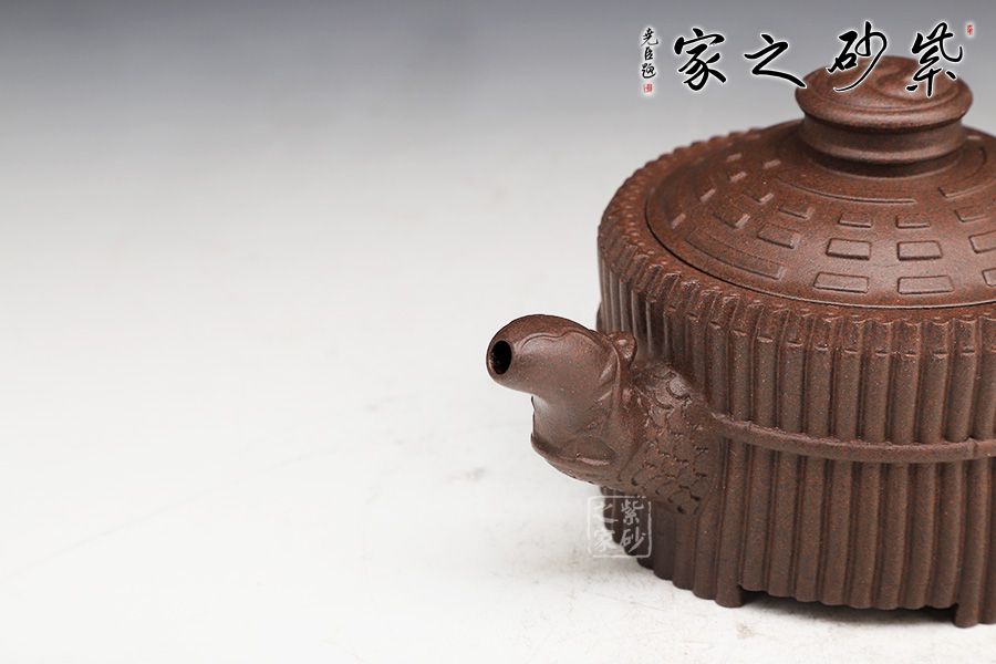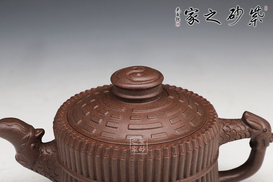 器型端莊穩(wěn)重、氣宇軒昂??v觀此壺,有龍有竹,有卦有圖,深富中華文化之內(nèi)涵。壺身外壁似一捆整齊的竹段,中腰以一竹束之。竹段由64根竹子均齊排列,分四組重合,壺底四周有四個(gè)腹部伸出的8根竹子做足,上下一體,縝密協(xié)調(diào)。束腰之竹鏤刻精致,64根竹的上端均刻有小圓圈,以示竹心中空。壺蓋微凸作伏羲八卦方位圖,蓋紐為太極圖式。把和流以堆雕飾成飛龍形象,龍口含水左右呼應(yīng),似有“見龍?jiān)谔铩敝狻?/p>