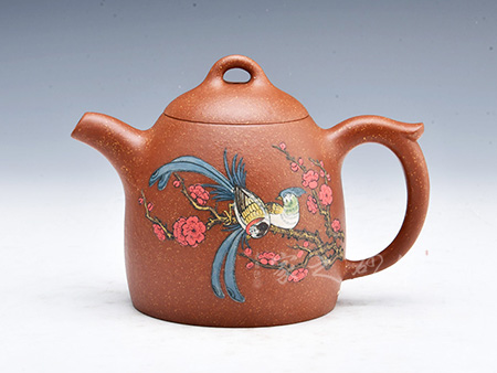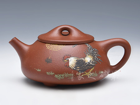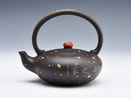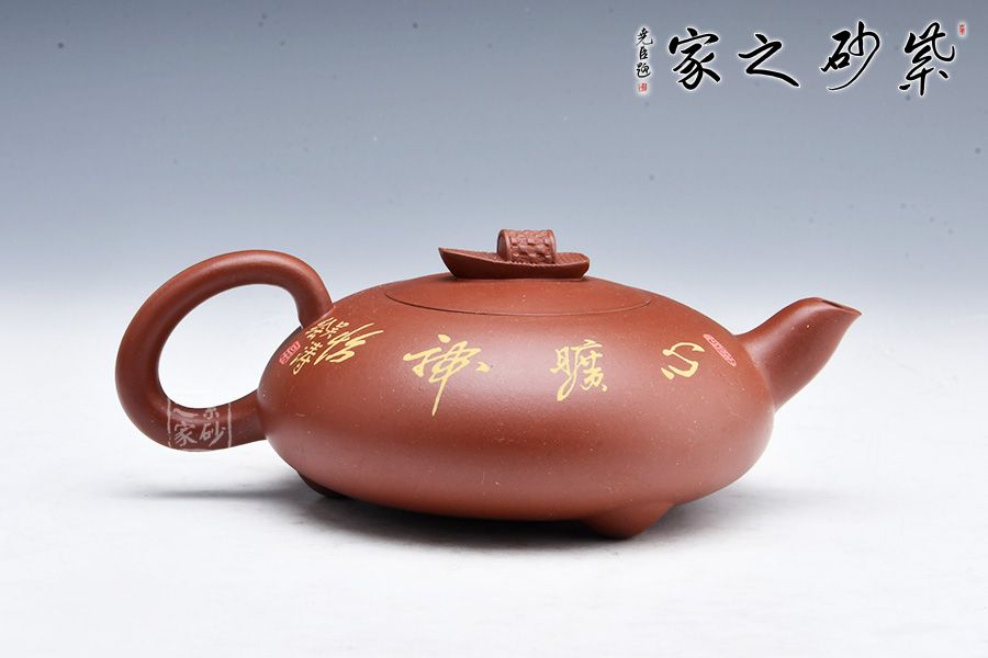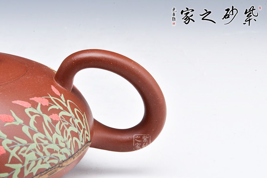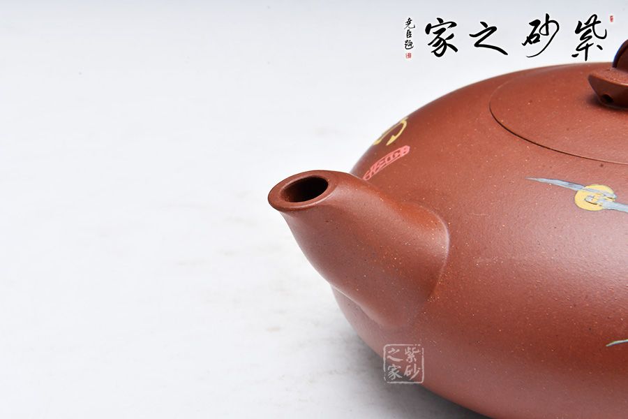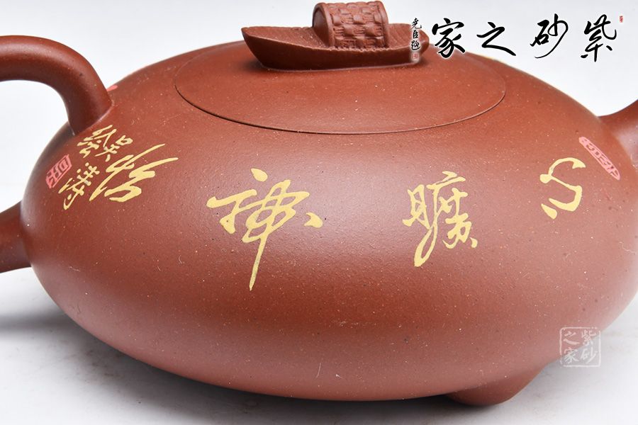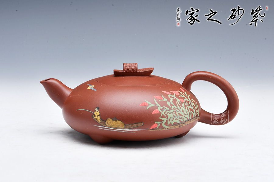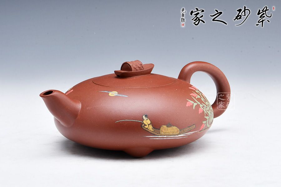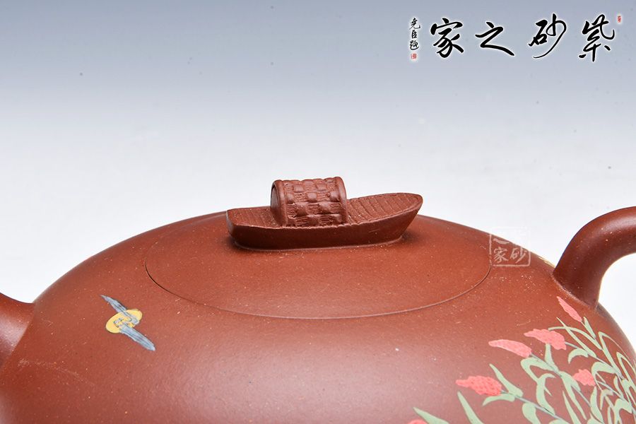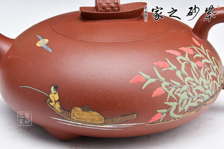 此壺的扁圓壺身造型飽滿溫和,壺身上下平和,嵌蓋與壺口嚴(yán)絲合縫,氣密性極佳,壺鈕尤為別致,為一只小船,壺嘴、耳把有一種微風(fēng)吹過飄逸之感。